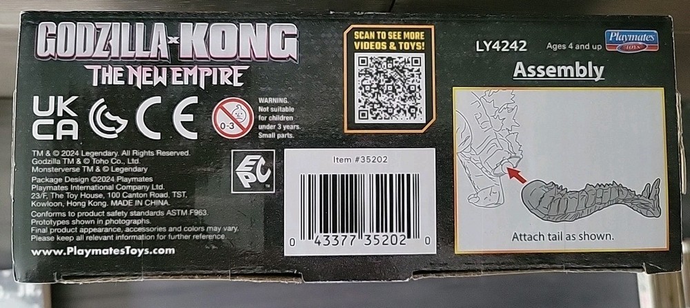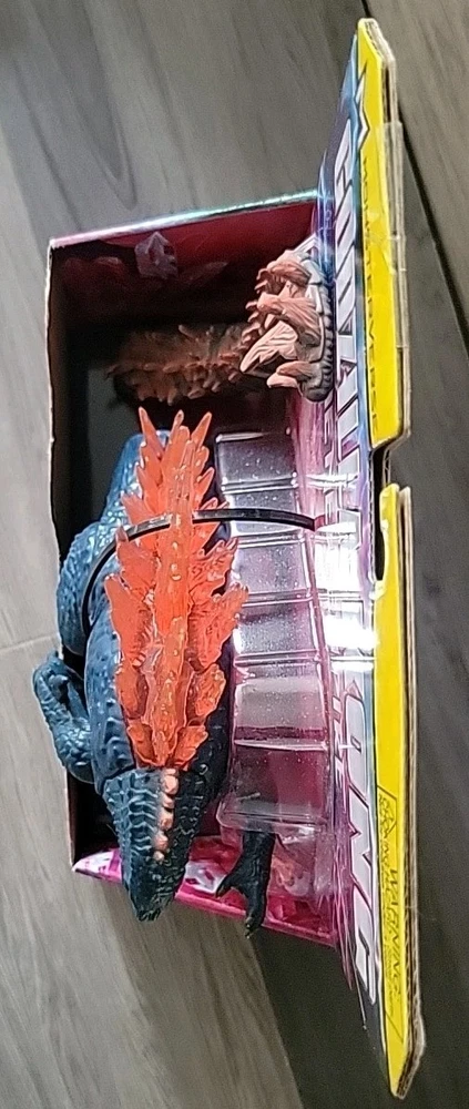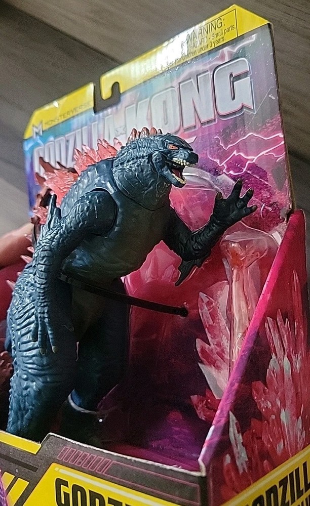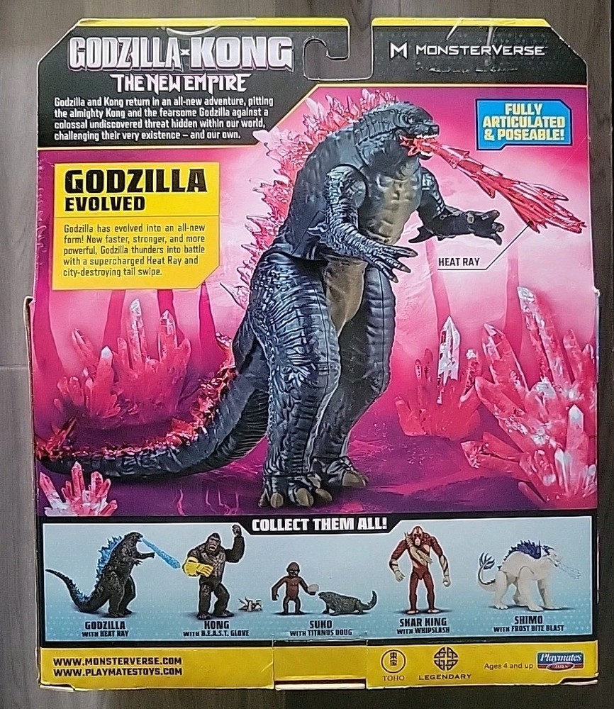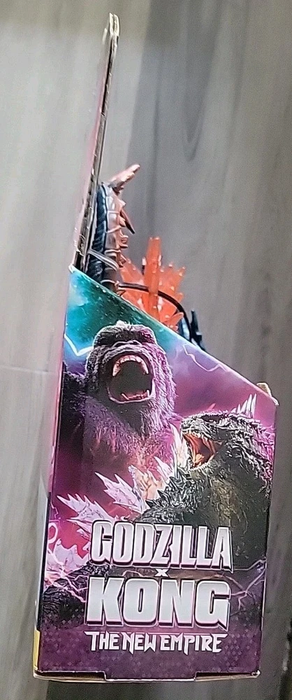 The product is an 8" length Godzilla x Kong action figure with a heat ray, manufactured in 2024 for San Diego Comic Con. This special edition, limited edition figure is part of the Godzilla franchise and features adjustable, fully jointed design. Made of ABS plastic, this exclusive boxed figure is a part of the Monsterverse series by Playmates Toys, perfect for fans of Godzilla and related series.