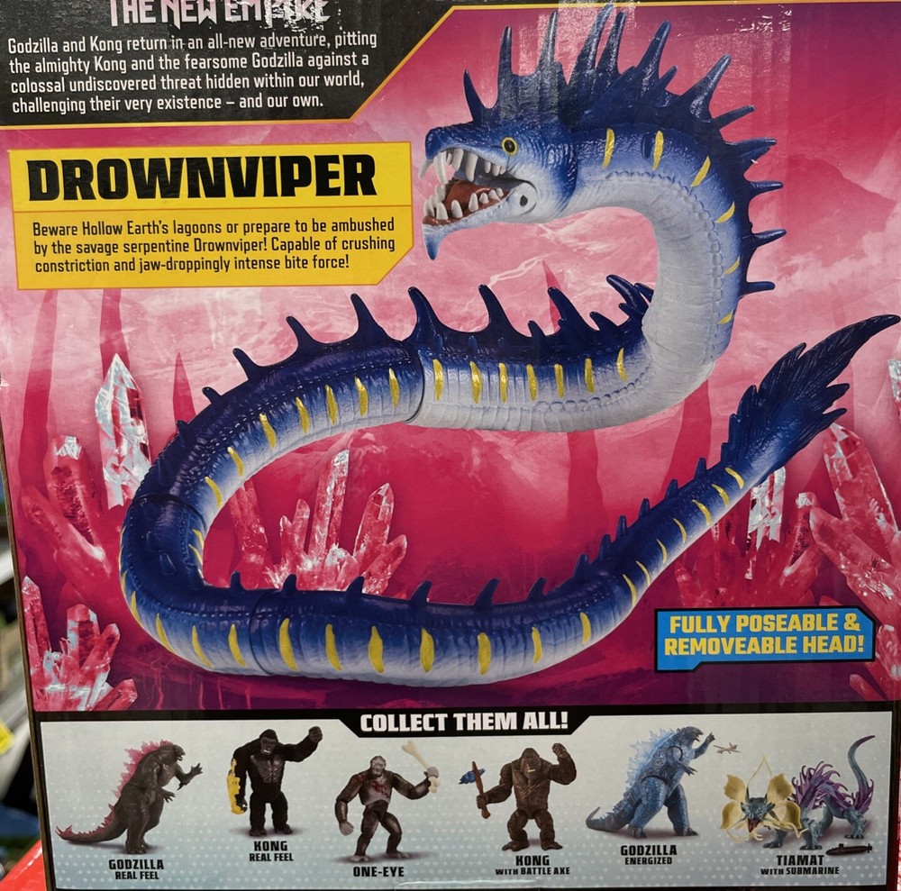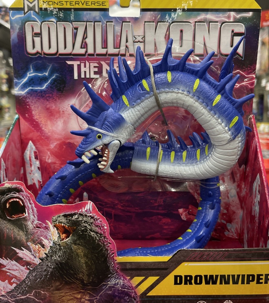 This Godzilla x Kong The New Empire action figure features the iconic Drownviper character, along with Godzilla and King Kong. The figure stands at 7 inches tall and is made of durable plastic material. It is part of the Monsterverse TV show series and is an original licensed reproduction from Playmates brand. The figure is perfect for fans of the Godzilla franchise and collectors of action figures. It comes in a blue color and features the animal species of snake. The toy is not vintage and was manufactured in 2024. The Godzilla x Kong The New Empire action figure is a must-have for anyone who loves TV, movie, and video games themes.
