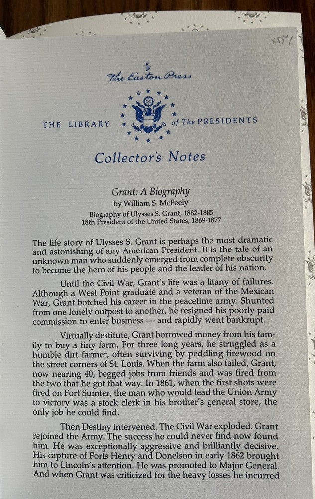 Grant: A Biography by William S. McFeely is a special edition leather-bound volume published by Easton Press in 1987 as part of The Library of the Presidents series. This nonfiction book provides a detailed account of Ulysses S. Grant's life and accomplishments in English, focusing on his role in American history. The genuine leather binding and hardcover format make it a valuable addition to any book collection, showcasing the author's expert storytelling and the publisher's dedication to quality craftsmanship. Beautiful leather bound edition. Previous owner’s bookplate on inside cover