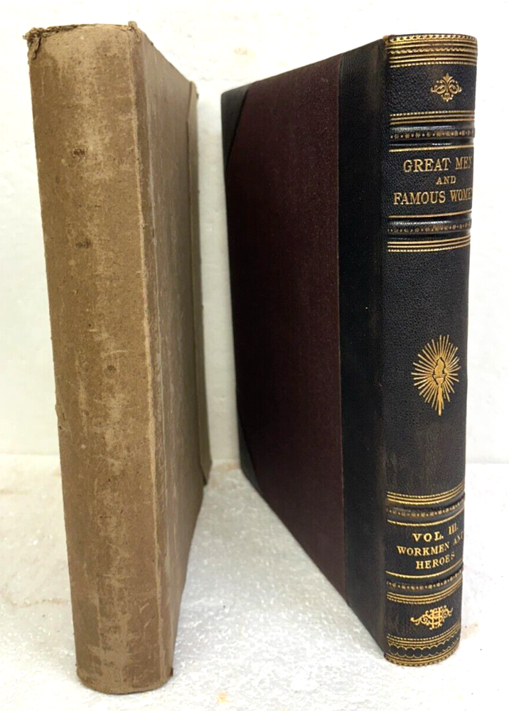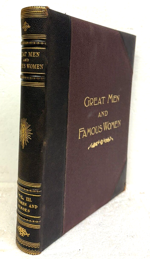 GREAT MEN AND FAMOUS WOMEN A Series of Pen and Pencil Sketches of the Lives of More than 200 of the Most Prominent Personages in History Volume III Workmen and Heroes edited by Charles F. Horne Published: Selmar Hess, Publisher, New York - 1894, First Edition This hardcover book measures 9 1/2" X 11 3/4" - 408 pages, with B&W text illustrations, plus 18 B&W photogravures, and 32 B&W plates. This volume is one of what appears to be a four-volume set. We believe this set is a First Edition, First Printing of Great Men and Famous Women, dated 1894. In attempting to ascertain a value on Bookfinder we found these books were in the listings mixed with a cheaper and of less quality eight-volume set from the same publisher. Oddly enough we have (had) volumes 1-4 of this set in our inventory. They are also dated 1894, with no mention of the originals. There appears to be NO distinction between the two on Bookfinder. You will notice we designated the lesser quality four volumes as a Later Edition. Apparently at some point the quality four-volume set was broken into eight parts by the publisher. These inferior versions of the originals lack the gilt edged pages, the quality leather spines and corners, fine end papers, and are printed on stock of a lesser quality. We are offering these four quality original volumes not as a set since some people might have one or more in their libraries. We can always sell all four together to an interested party. What is also of note are the slipcases (see image) on volumes 2, 3 & 4 which have kept the conditions of these volumes in Near Fine over the years. The book is half leather bound, with gold inlay on the front and spine, and all the page edges gilted. There is some minor wear to the corners, with the book remaining in Very Good Plus condition or better. Free U. S. Media S&H. Parcel post and priority mail available upon request at an additional cost. Combined S&H available. International S&H higher. Please E-mail us with any questions. Thanks for looking!