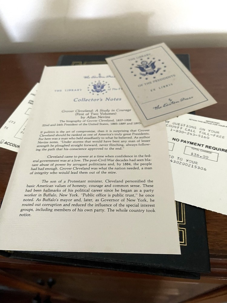 Dive into the captivating biography "Grover Cleveland: A Study in Courage" by Allan Nevins, presented in an elegant leather-bound volume by Easton Press. This collectible 1989 edition, published in Norwalk, Connecticut, offers an insightful look into the life of one of America's most fascinating presidencies. With its historical focus and meticulous research, Nevins' work is an essential addition to any biography or autobiography collection. The book is an original print in English and comes from a personalized batch, making it a unique piece for readers and collectors alike. It has been crafted in the United States with attention to detail, ensuring a high-quality reading experience. Whether you're a fan of the character family or simply appreciate well-documented historical accounts, this book promises to be a noteworthy acquisition for your library. ππππβππΈπΆπ π Very Good Condition Pages and covers are clean and have no markings - All items Guaranteed to be in said or better condition- Ships same day before 1pm EST weekdays! Note: The Photos are the actual item Terms Of Sale Payments: Payments on "Buy Now" items are due within 48 hours Pay Sooner get it sooner! Payment must be made within 3 days of auction end or item will be re listed & non-paying buyer dispute will be filed. We offer "Make Offer" option on most items. Only serious offers will be considered Returns This item is covered by eBay's Money Back Guarantee. All returns subject to a 20% re-stocking fee at the seller's discretion. If item is new and boxed must returned not opened If an opened box item must be returned with original packaging Please contact me to set up returns. If stated, Buyer pays all return shipping fees Shipping Information Shipping Ships next weekday from non smoking home All items are guaranteed to be in said or better condition We are not responsible for incorrect or undeliverable addresses. We ship 100% of all orders the same or next business day after payment received/cleared. Please understand that once orders are shipped, we cannot control the transit times thereafter Customer service is very important to us. Any questions? Contact me. Please contact me before leaving feedback in order to resolve any issu e. Thank you for looking!