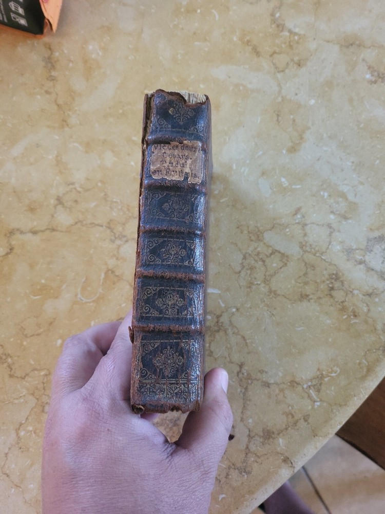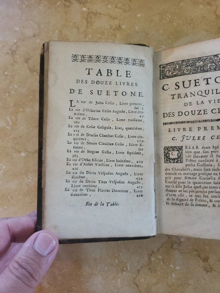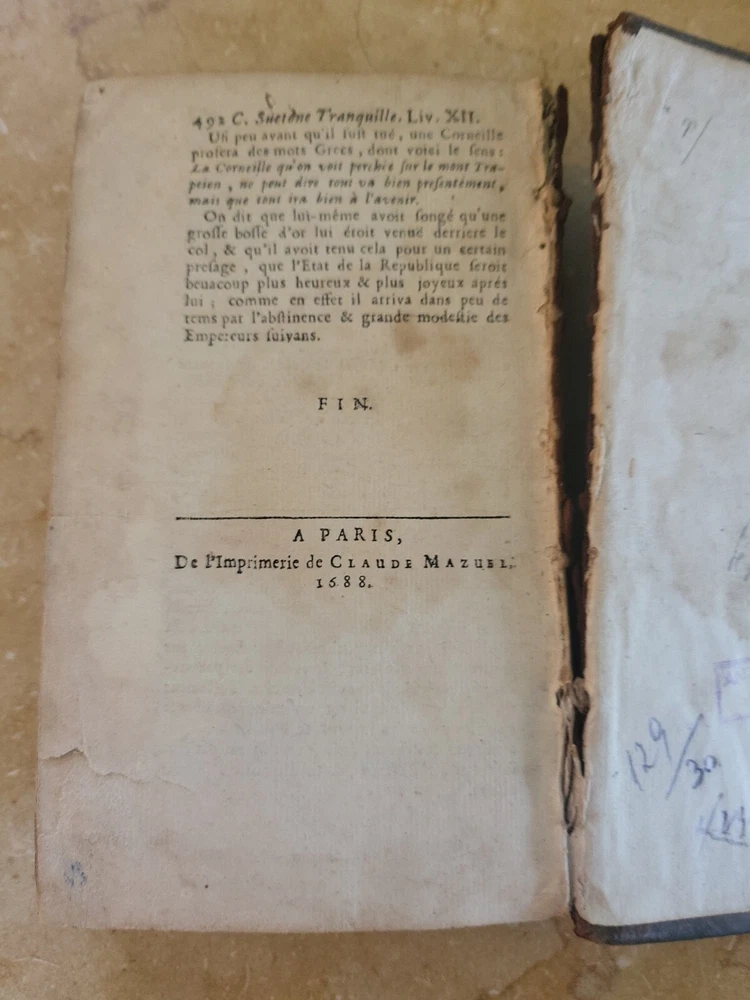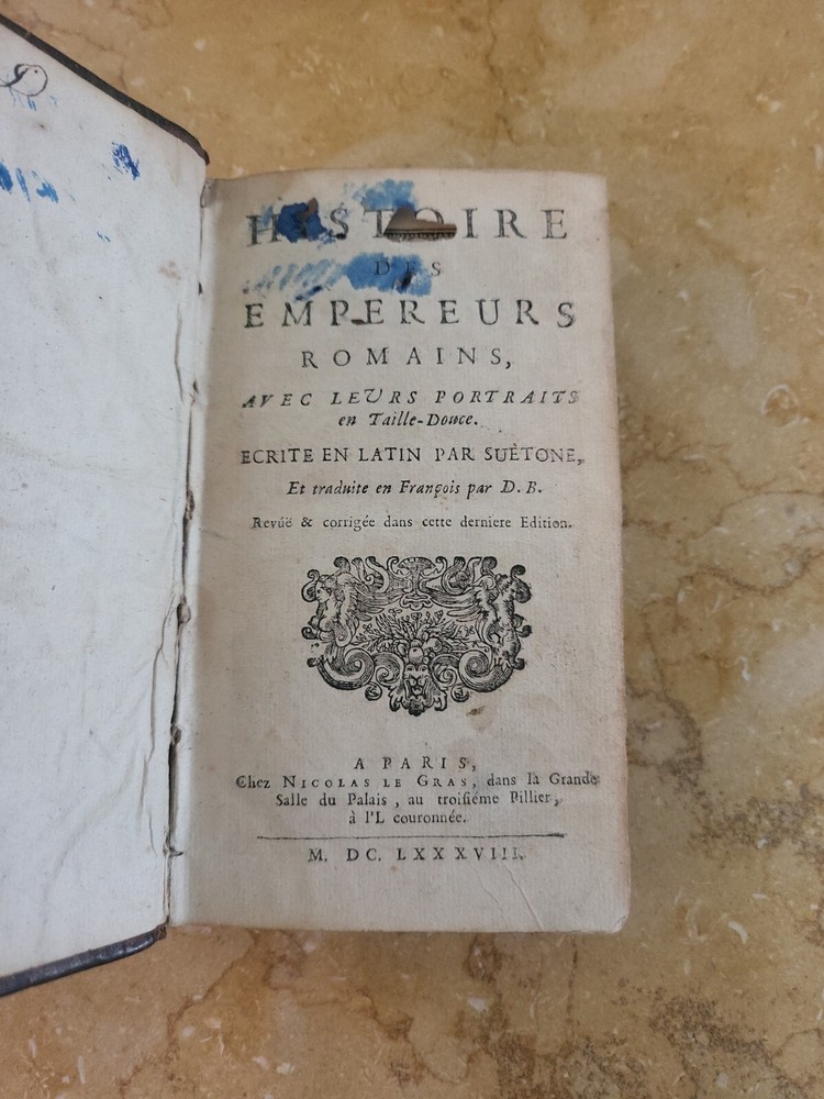 Up for sale is a copy of. "HISTOIRE DES EMPEREURS ROMAINS avec leurs portraits en taille-douce, écrite en latin par Suetone. Et traduite en françois par D. B." Published 1688 by Claude Mazuel. 492 pages. Various chapters about Roman individual Roman Emperors. Julius Caesar, Caligula, Augusts Caesar etc.. Looks as though based on lectures of Suetone. Overall VG-/G+ Chipping to top and bottom of binding. Some lean to book. Wear. Missing endpages. Back board 3/4 broken away from work and in some danger of falling off. Old stamps, writings on back board. Interior pages are generally good with most significantly issue being title page has several small holes through title. Still a solid copy. Please email with questions and see my store for other great items.