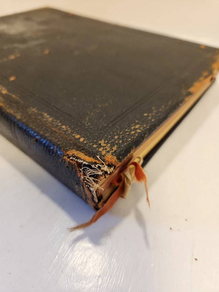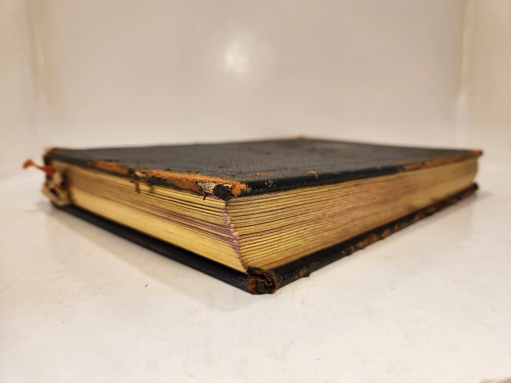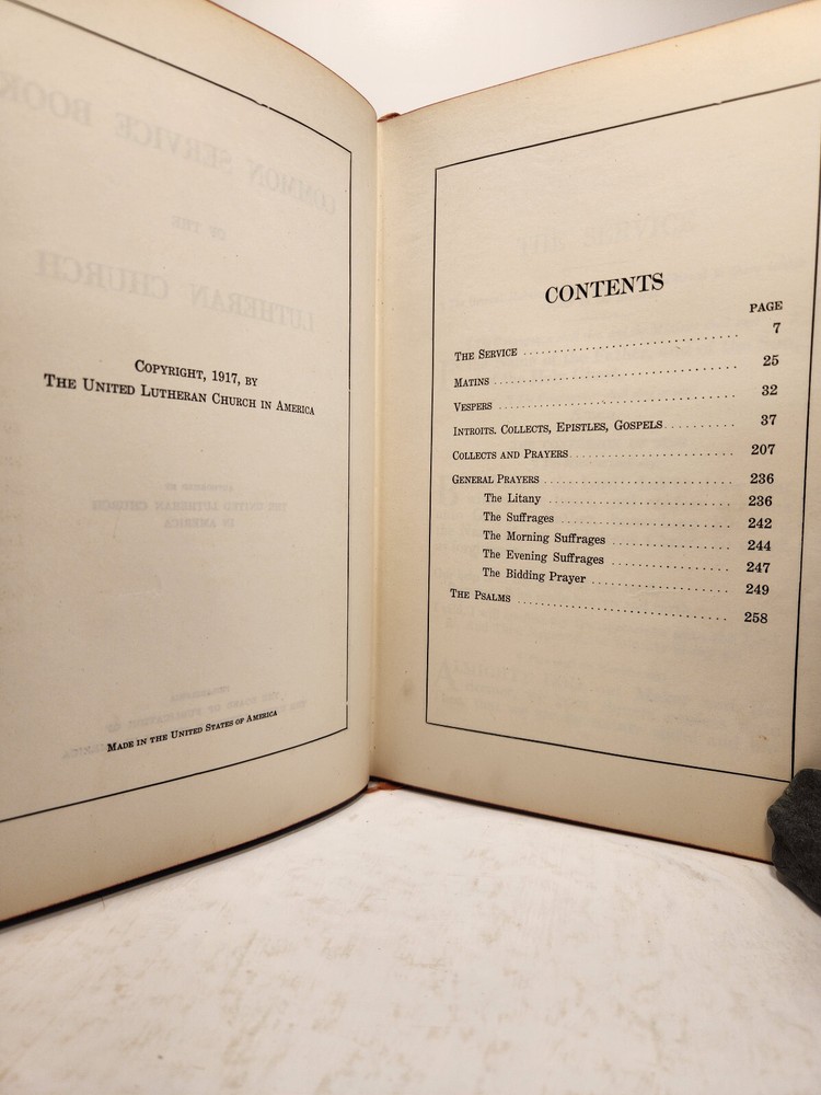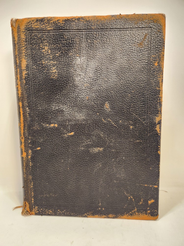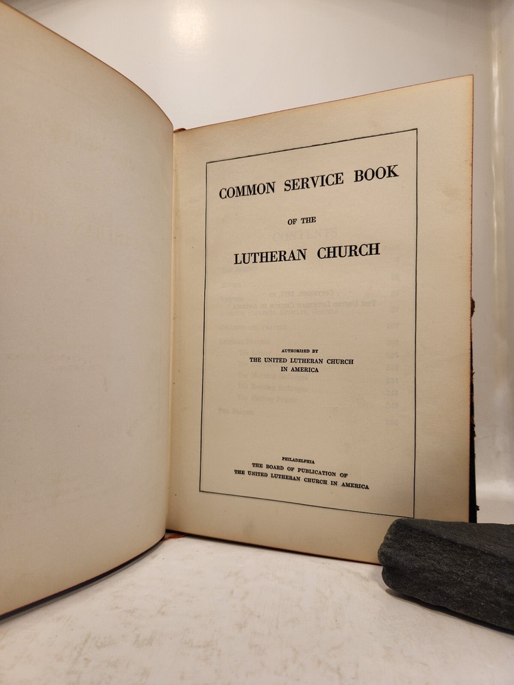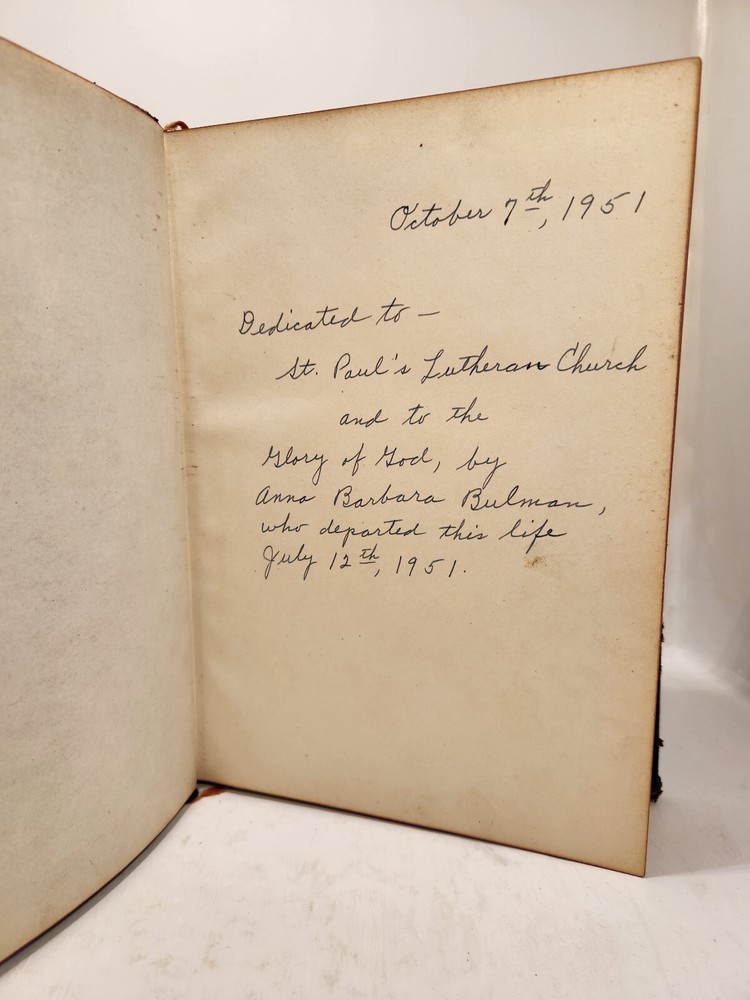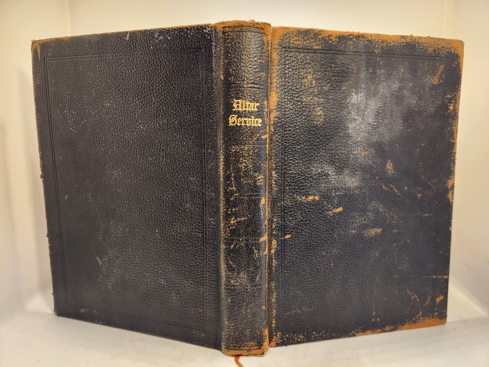 A well-loved, very handsome leatherbound large copy of the Common Service Book of the Lutheran Church. The book has many endearing qualities, such as the gilted edges of the text block, the 4 colored fabric bookmarks bound to the spine, the loving dedication written in cursive pen on the front endpaper, and the beautiful printing of the text on each page. The book also contains a piece of loose plaid fabric. At the time of posting, I could not find any other copies of this edition online (current or past listings). Overall, the book is in Good condition: the text is in excellent condition for age, but there is notable cosmetic wear to the leather cover. Hinges and binding are sound and in good shape. Pages are lightly tanned. There are some very minor age-related blemishes on pages throughout (e.g., a small dark smudge mark, minor toning). The fabric bookmarks are firmly attached, but fraying at ends and age-worn. Otherwise, pages are clean, and clear of writing, markings, highlighting, etc. Leather cover is heavily rubbed along edges and corners, and exposed at corners. The areas of leather that are rubbed leave behind a brownish residue, along with the small pieces of leather than rub off, typical of these bindings. Gilted text on spine. Leather on front cover scratched in spots. Leather chipping along fore edges. Small rips at top and bottom of front spine joint, frayed.