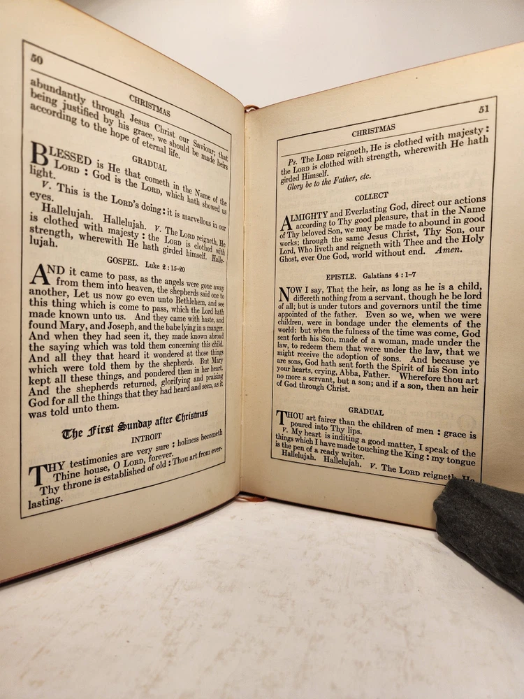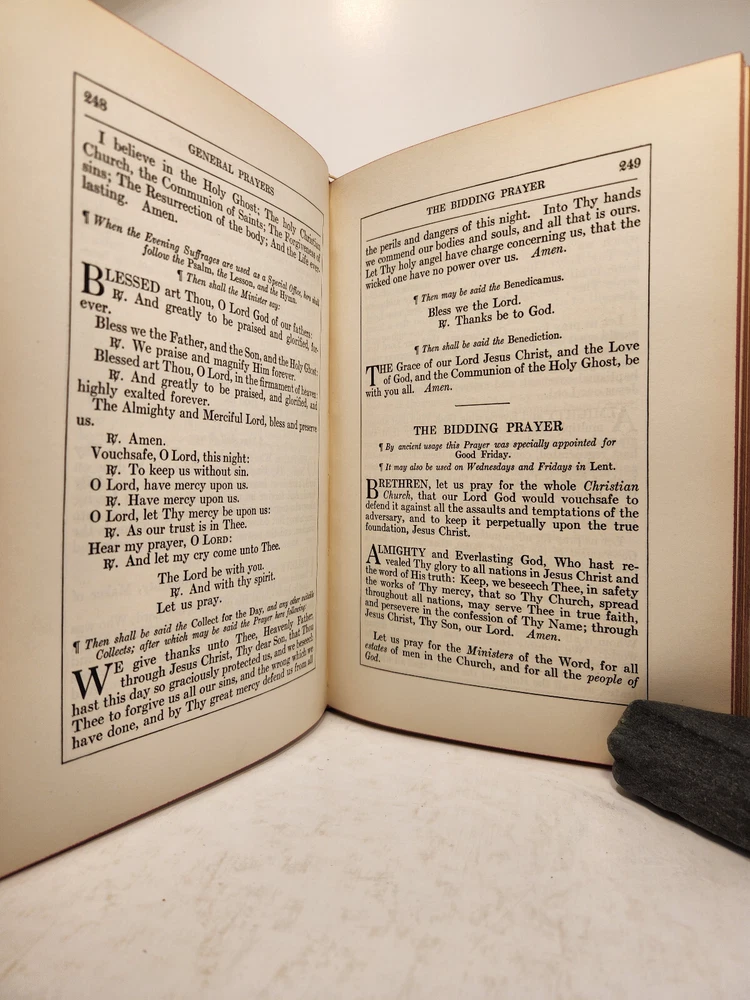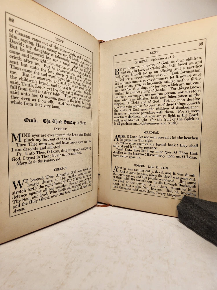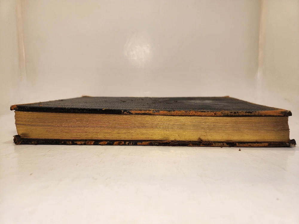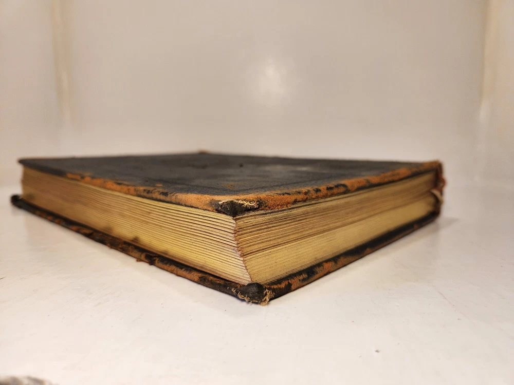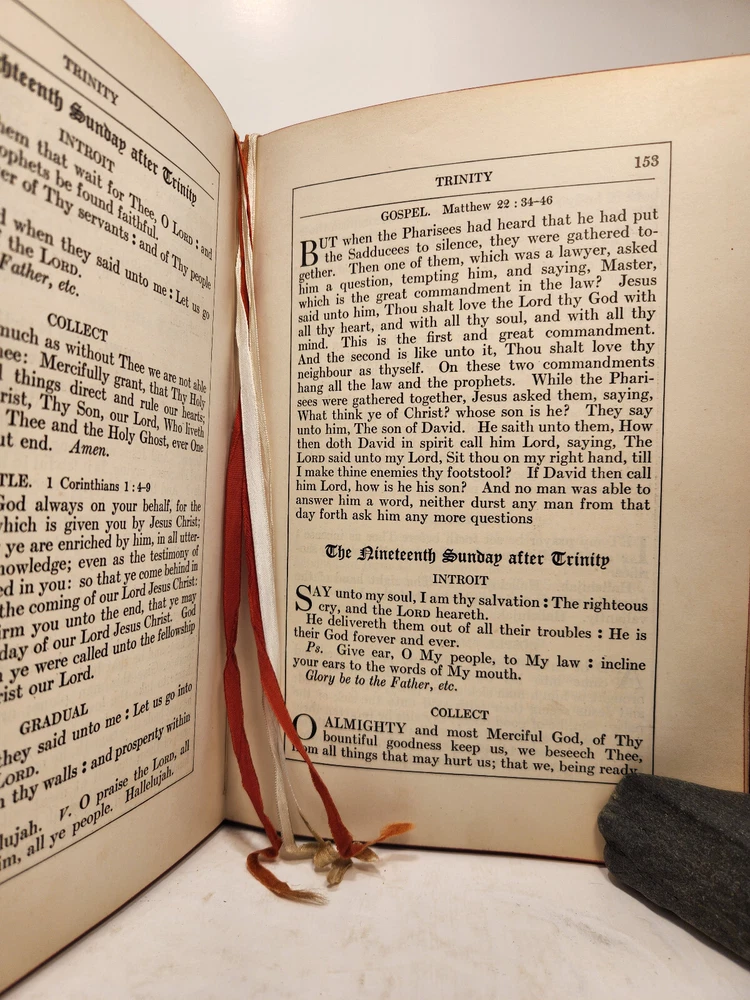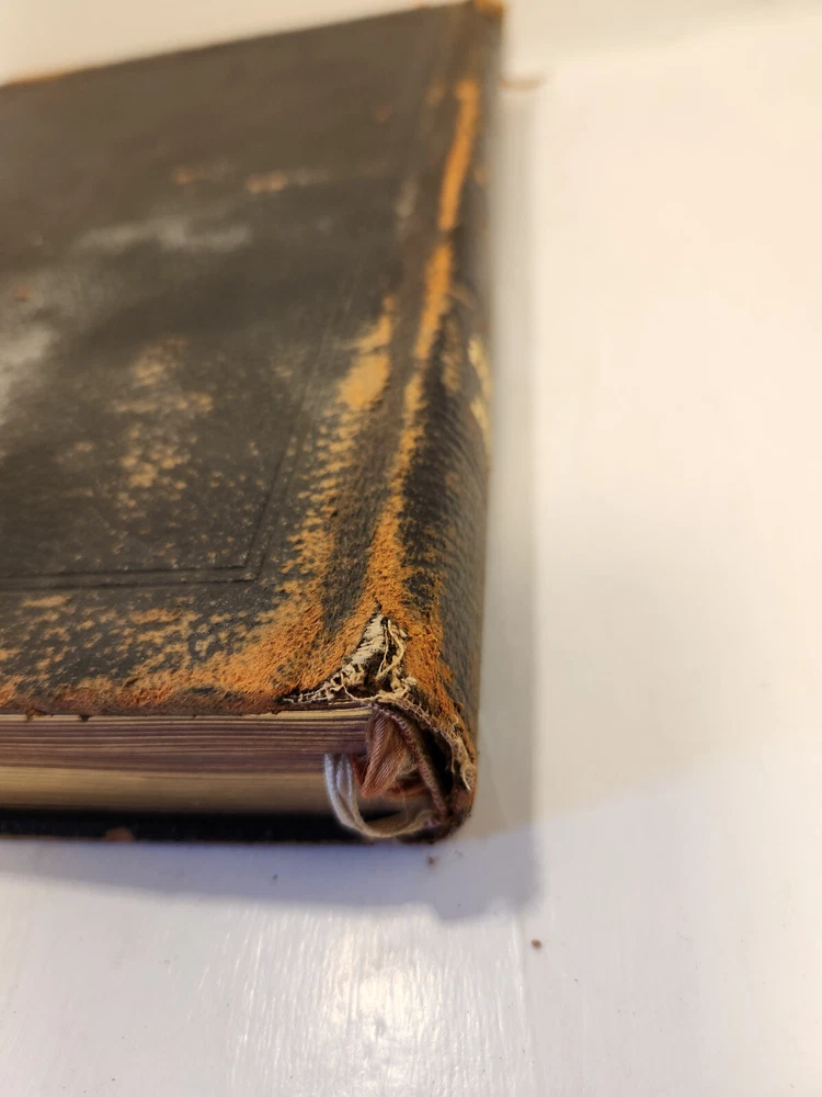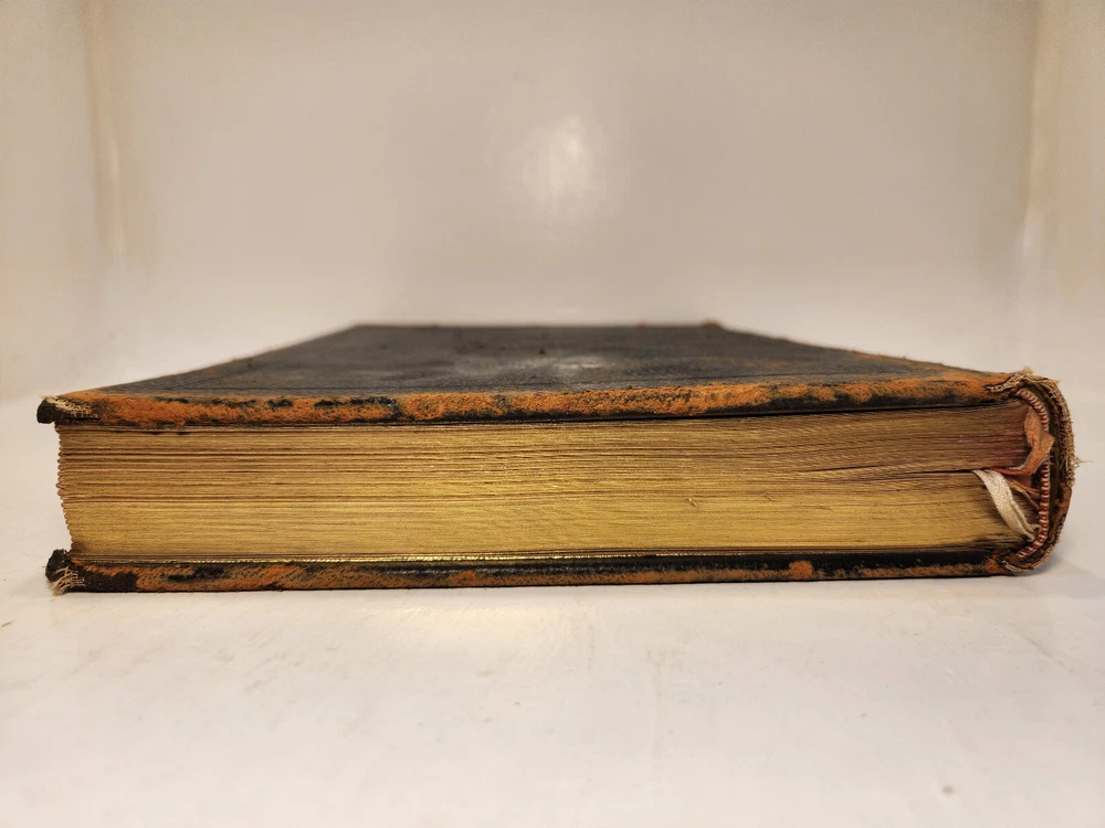 A well-loved, very handsome leatherbound large copy of the Common Service Book of the Lutheran Church. The book has many endearing qualities, such as the gilted edges of the text block, the 4 colored fabric bookmarks bound to the spine, the loving dedication written in cursive pen on the front endpaper, and the beautiful printing of the text on each page. The book also contains a piece of loose plaid fabric. At the time of posting, I could not find any other copies of this edition online (current or past listings). Overall, the book is in Good condition: the text is in excellent condition for age, but there is notable cosmetic wear to the leather cover. Hinges and binding are sound and in good shape. Pages are lightly tanned. There are some very minor age-related blemishes on pages throughout (e.g., a small dark smudge mark, minor toning). The fabric bookmarks are firmly attached, but fraying at ends and age-worn. Otherwise, pages are clean, and clear of writing, markings, highlighting, etc. Leather cover is heavily rubbed along edges and corners, and exposed at corners. The areas of leather that are rubbed leave behind a brownish residue, along with the small pieces of leather than rub off, typical of these bindings. Gilted text on spine. Leather on front cover scratched in spots. Leather chipping along fore edges. Small rips at top and bottom of front spine joint, frayed.