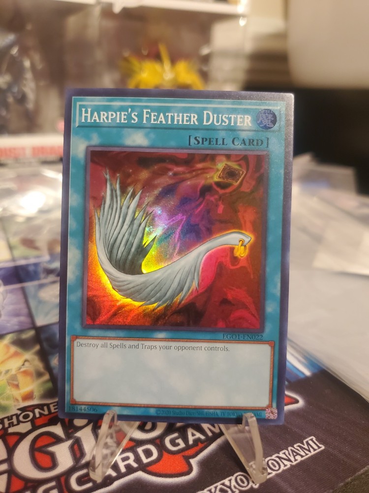 This listing is for one copy of Harpie's Feather Duster EGO1-EN022 Egyptian God Deck: Obelisk the Tormenter Unlimited Edition Super Rare Yugioh Card. Please see listing photos and listing card condition description for card condition. Will ship protected and in PWE.
