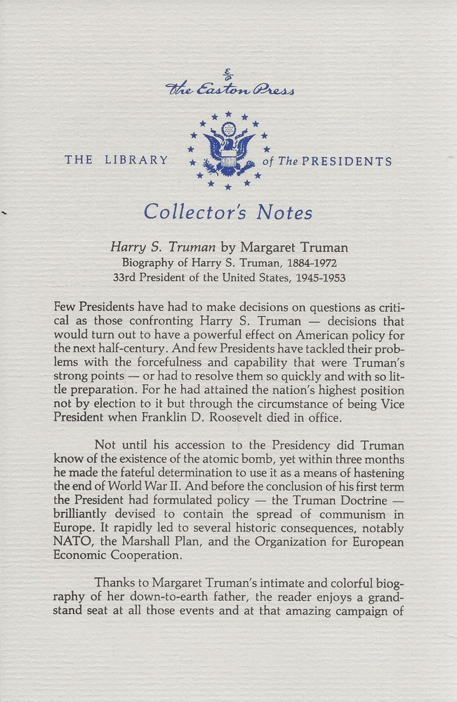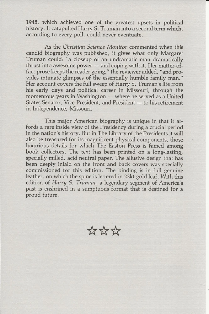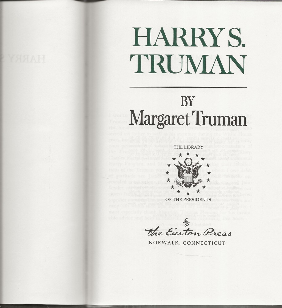 This new, hardcover book with a sewn binding, Leather covers and gilt page edges, is from the inventory of a closed college book store, Trinity Books, Ltd., Wichita Falls, TX. The book has no dustjacket, as published, and is in perfect condition. It may show slight signs of shelf wear and customer handling. Last copy. This biography is like no other about Harry Truman, in that it was written by his wife who probably knew him better than anyone else, especially during his years as president. This is a beautiful book with a very inspiring story.