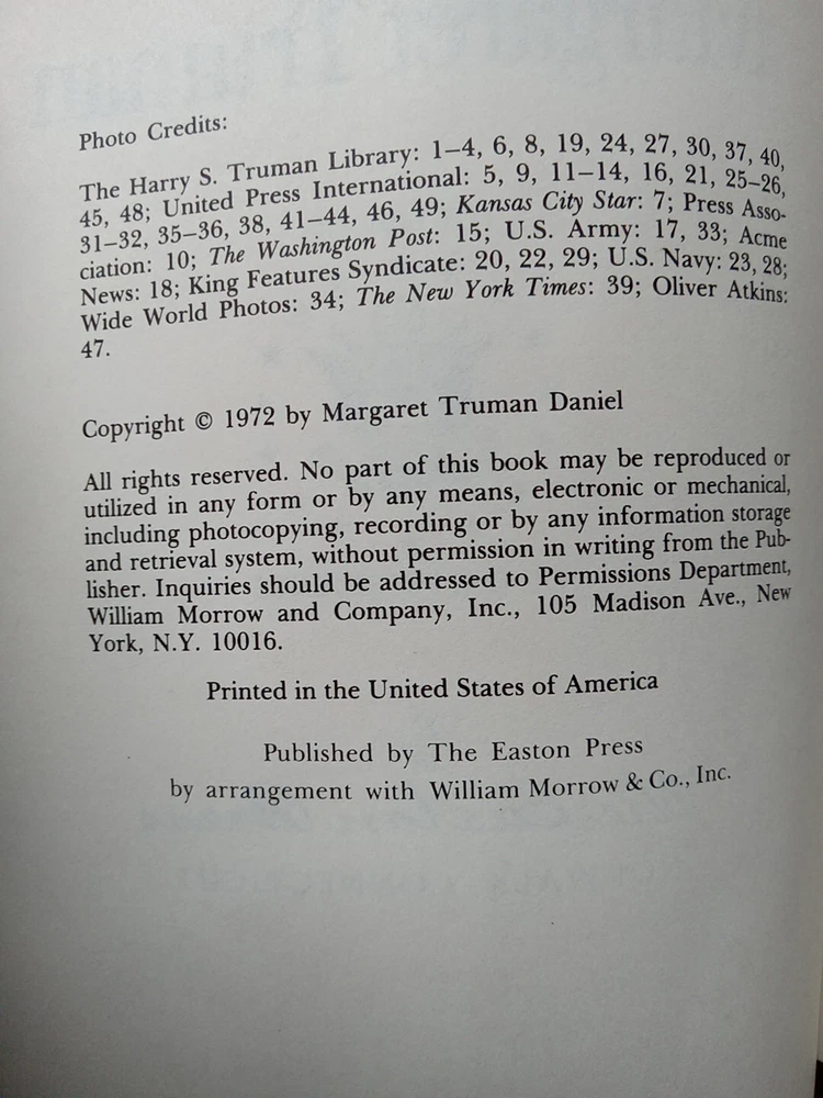 Written by Harry Truman's daughter, leather bound, gilted edges. Fine. Accented in 22kt gold, printed on archival paper with gilded edges, smyth sewing & concealed muslin joints. Bound In full leather with hubbed spines. A Limited Edition. The Library of the Presidents. ; First Easton Press Edition.; 8vo 8" - 9" tall