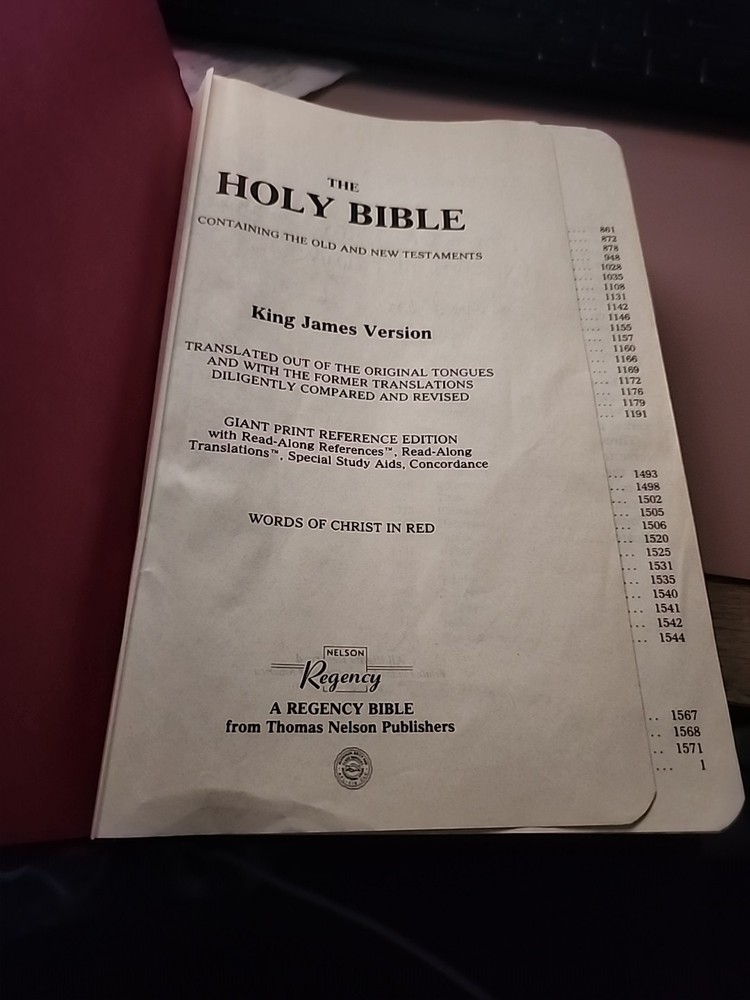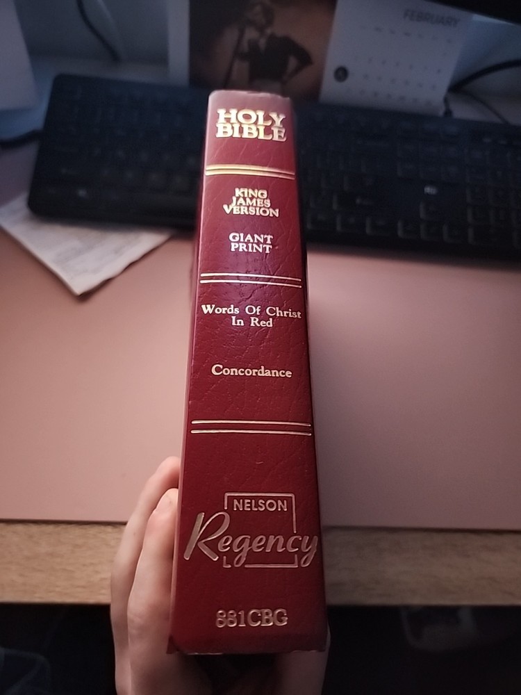 The product is a Holy Bible King James Version with giant print and words of Christ in red, published by Nelson Regency in 1990. It features a flexible faux leather bound cover and is intended for young adults and adults interested in religion and spirituality. Written by God, the Bible is a red letter edition with a focus on Christianity and providing help through its religious and spiritual content. This edition includes special attributes that can enhance the reading experience for individuals seeking guidance and inspiration.