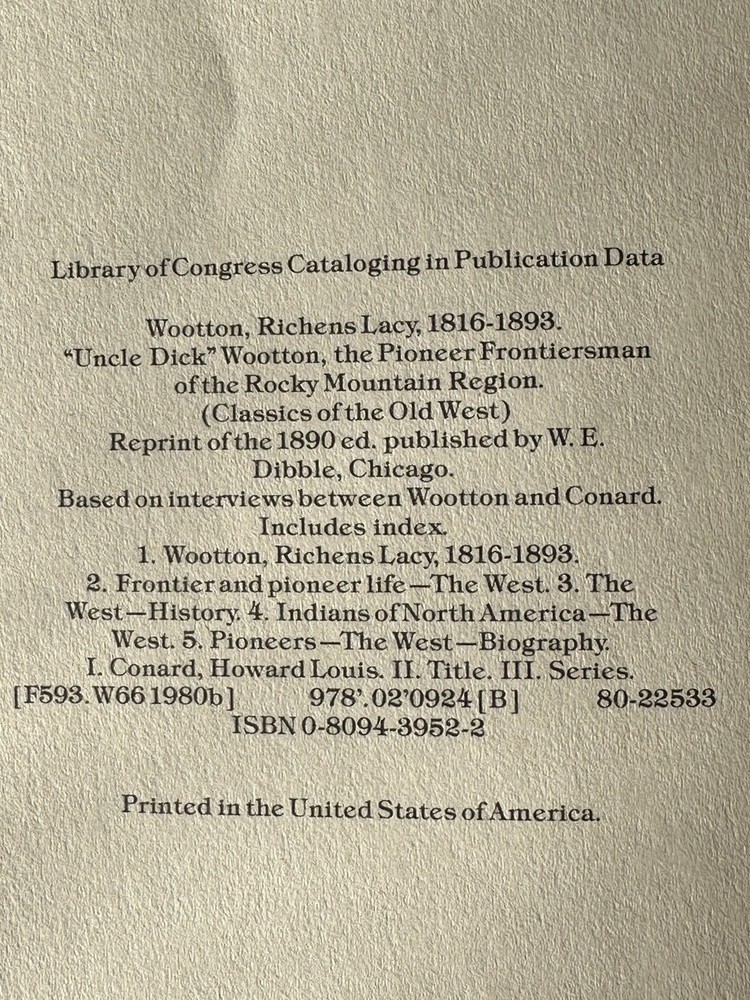 This book tells the story of Uncle Dick Wootton, a true legend of the American frontier. Filled with thrilling tales of adventure and daring, readers will be transported back in time to an era when the West was still wild and untamed. Beautifully illustrated and bound in faux leather, this book is a must-have for any history enthusiast or lover of the Old West. With over 400 pages of gripping narrative and detailed accounts of life on the frontier, this book is a true treasure. The Library of Congress edition, originally printed in 1890, has been faithfully reproduced by Time Life Books and is sure to delight young adults and adults alike. Don't miss your chance to own a piece of American history with this beautifully crafted book. An excellent book to gift or add to your own collection. Book is in excellent condition very little wear.