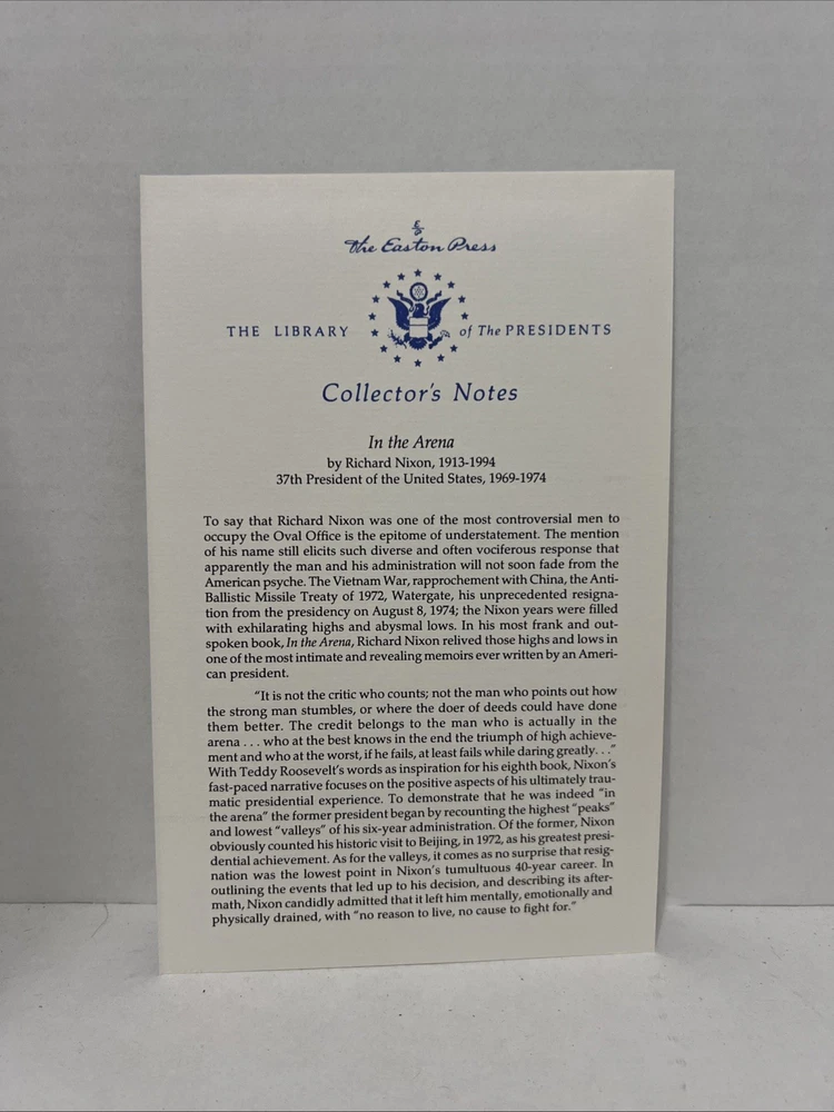 Delve into the insightful world of politics and personal reflection with "In the Arena" by Richard Nixon. Published in 1990 by Easton Press as part of "The Library of The Presidents" series, this leather-bound collectible is a must-have for enthusiasts of political history, government, and biographies. Its elegant hardcover design features gilt edge detailing and an inviting ribbon marker, assuring that each page turn is as memorable as the last. Nixon's memoir offers a profound look into his political journey and the inner workings of government, presented in English for an accessible reading experience. Crafted with acid-free paper to ensure longevity, this piece of literary art is not just a book but a treasure for those intrigued by the man and the times.