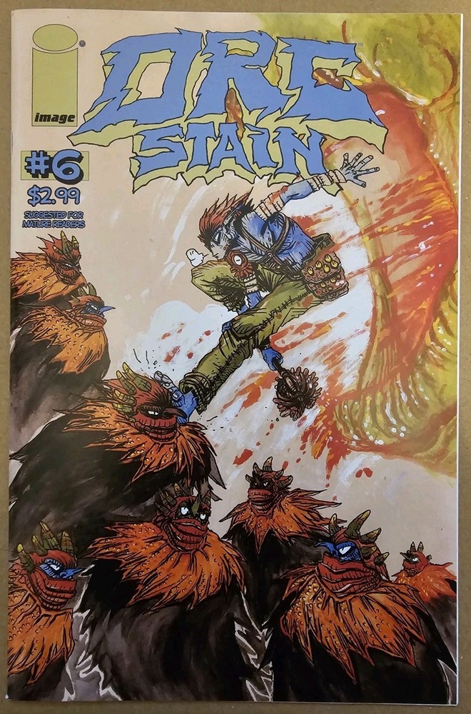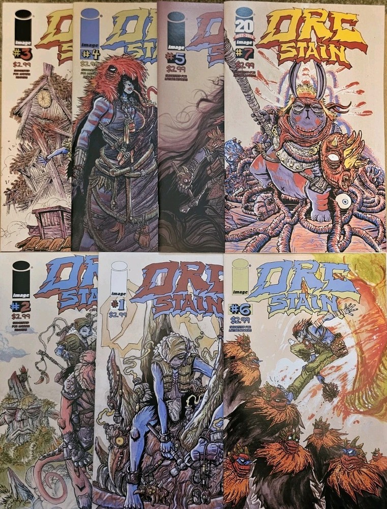 Up for sale are the first 7 Orc Stain comics that are all in very nice condition with a few imperfections (please see pictures). Dive into the grimy and gripping world of "Orc Stain" with this complete set of issues 1 through 7. Brought to you by the talented James Stokoe, each comic book is a vibrant and terrifying adventure through a universe where orcs like One-Eye and Pointyface roam. Published by Image Comics, this series is a must-have for fans of action, horror, and sci-fi, especially those who appreciate the Modern Age of comics. The books are presented in full color, ensuring that every detail of Stokoe's artwork is captured, from the fierce battles to the haunting landscapes. A first edition collection, this set is a jewel for collectors, featuring the original printing from 2010, 2011 & 2012. With its captivating storytelling and unique take on the classic monster lore, "Orc Stain" stands as an exemplary addition to any comic book library.