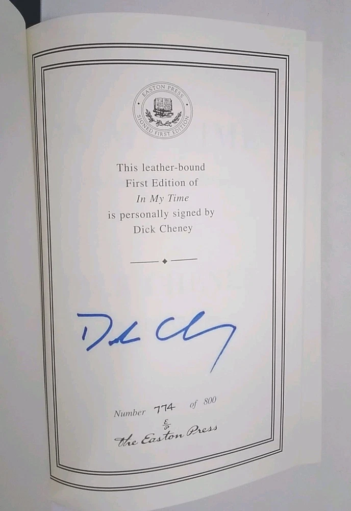 In My Time, autobiography by Dick Cheney. Signed, 1st Ed., Luxury Leatherbound edition by Easton Press. Number 774 of 800 copies. Burgundy leather with gilt embellishment, gilt-edged pages, moire endpapers. 565 pages with index. Beautiful book, pristine condition. See photos for further details.