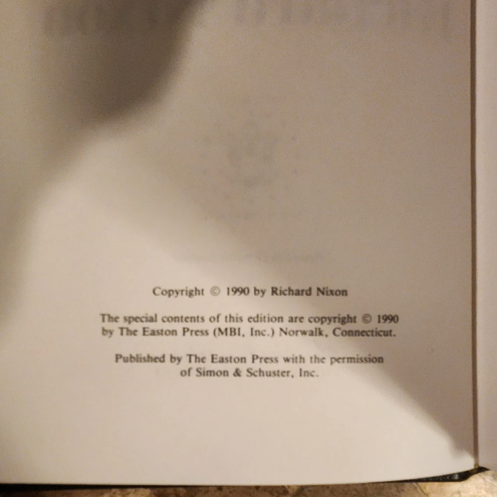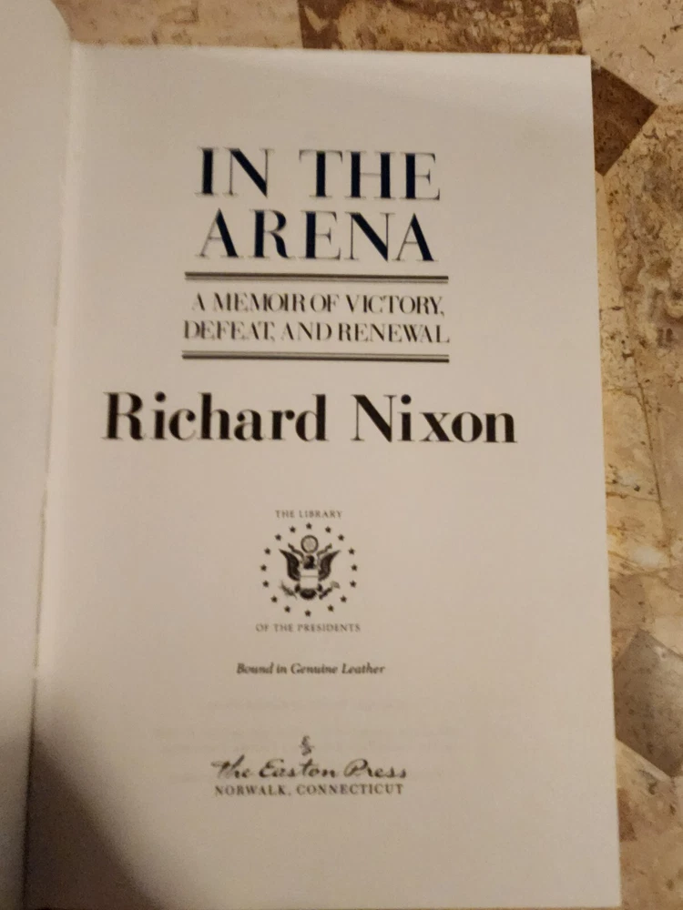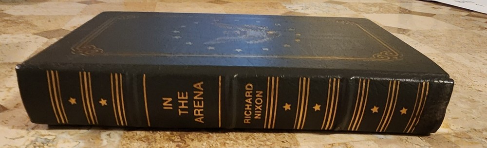 Good copy of In The Arena - A Memoir Of Victory, Defeat, And Renewal by Richard Nixon. Good condition!! No writing, marks, large blemish on back cover (looks like it was melted) and some pages had very small corner fold to bottom corner. The Library Of The Presidents. Collector's Edition Fully bound in genuine leather. 22kt gold deeply inlaid on the "hubbed" spine. Superbly printed on acid-neutral paper that lasts for generations. Sewn pages — not just glued like ordinary books. Handsome moiré endpages and a satin-ribbon pagemarker. Gilded page ends. Look for more Easton Press listings coming soon.