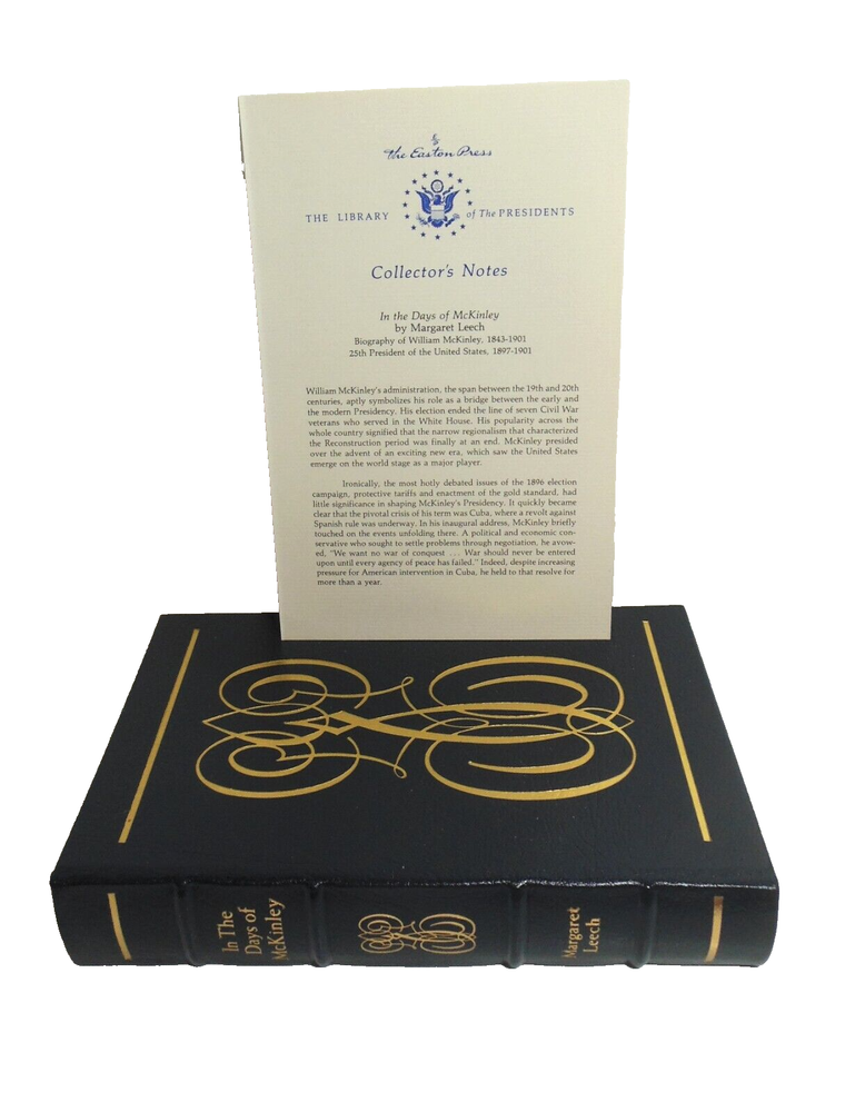 PHOTOS SHOW ACTUAL BOOK YOU WILL RECEIVE "In the Day of McKinley" by Margaret Leech 1986. The Easton Press. Decorative Blue Leather Hardcover with Raised Spine Hubs, Gold Decorative Design and Lettering, Gold on Side Edges and Satin Page-Marker Ribbon. 9 1/4" x 6 1/4". 686 Pages. Complete with Book Insert. Condition: Pages are crisp and clean. Cover has hardly any wear. ** FREE MEDIA MAIL SHIPPING WITHIN U.S. ** ilmjbM