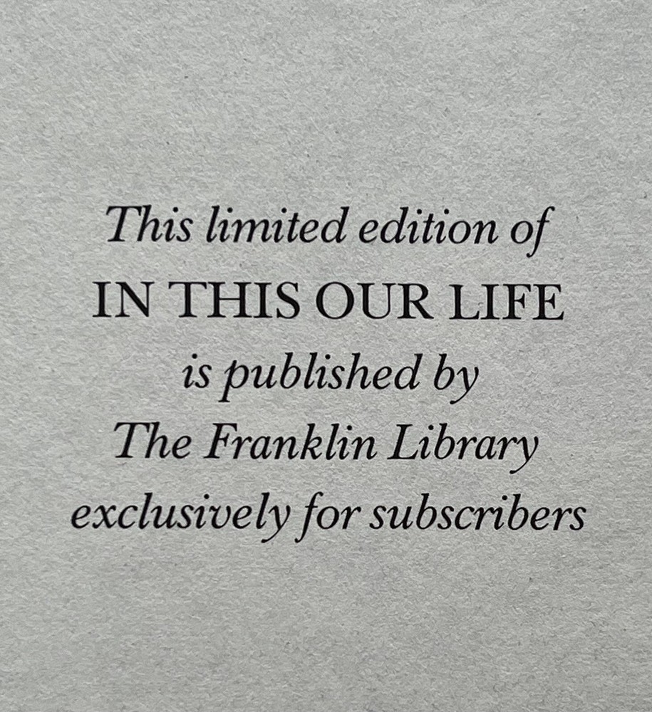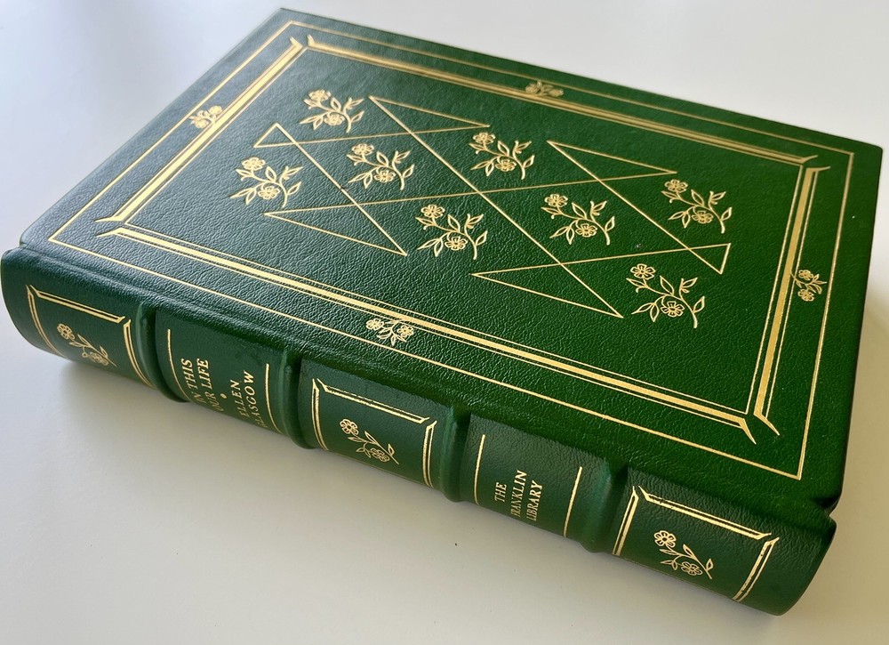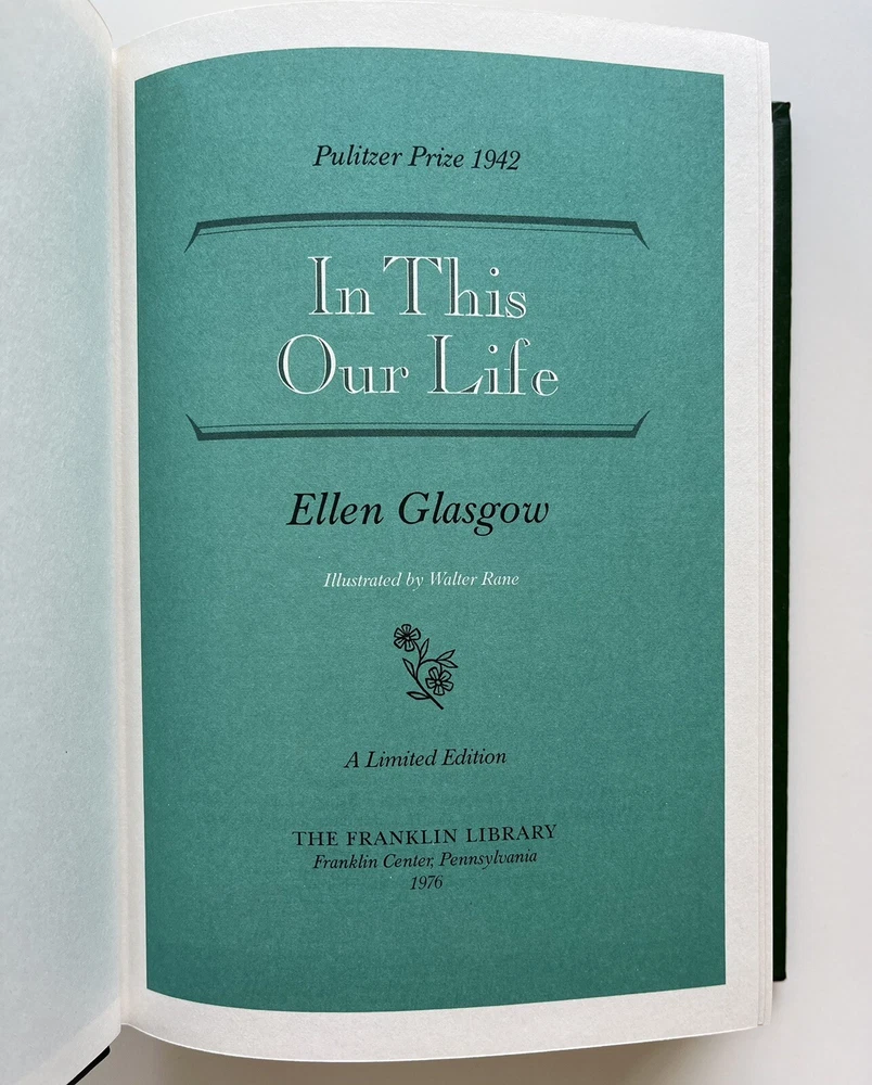 This limited edition hardcover book titled "In This Our Life" by Ellen Glasgow is a prized addition to any book collection. The book, published in 1976 by The Franklin Library, features a leather-bound cover and is written in English.