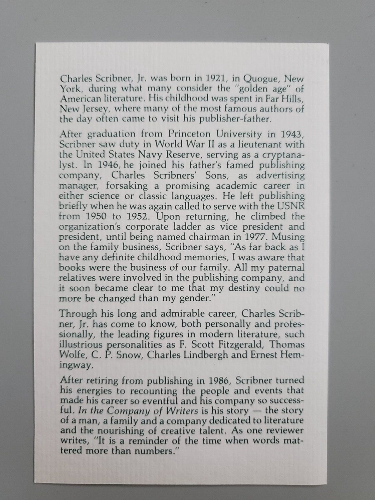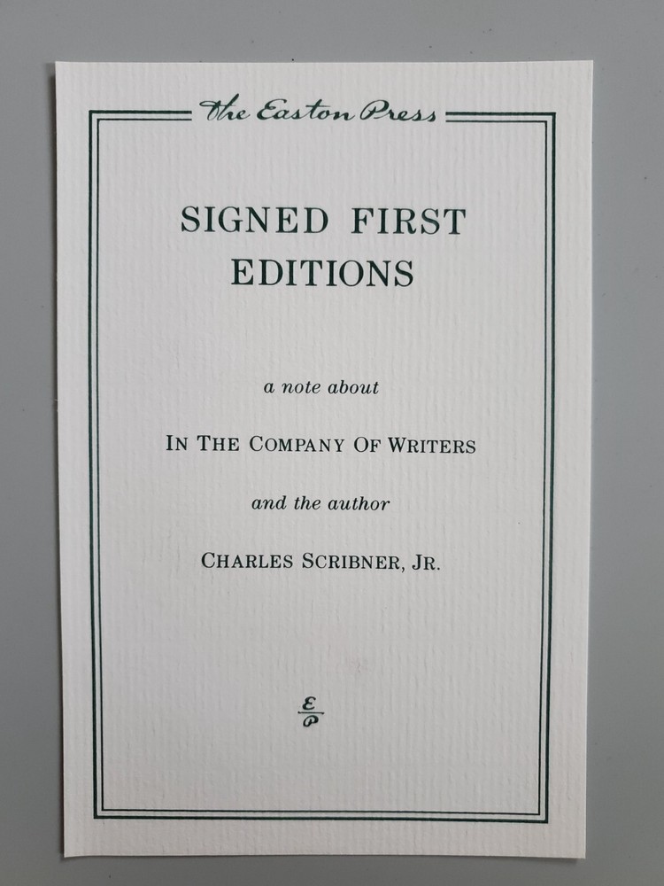 In the Comp0any of Writers: A Life in Publishing by Charles Scribner, Jr. Like new Easton Press Signed First Edition. This hardcover book boasts the features that are expected from Easton Press: signed by the author, bound in genuine leather, with gold lettering and decorations on the cover and spine, gilded page edging and a sewn-in satin bookmark. Decorative pattern is the same on front and back cover. The text is printed on archival quality acid-neutral paper. A separate insert includes a description of the book and the author. These books are a pleasure both to display and to read.
