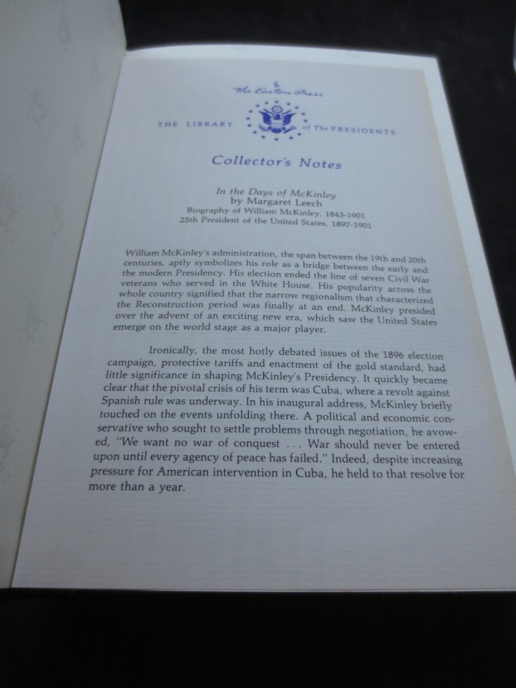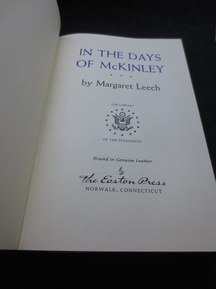 In the Days of McKinley by Margaret Leech - Library of the Presidents Easton Press Leatherbound. Vintage 1986. Very Good Condition. Please look at pictures to see the actual item that you will be receiving so there are no surprises. Smoke free home. Email me with any questions. Thanks.