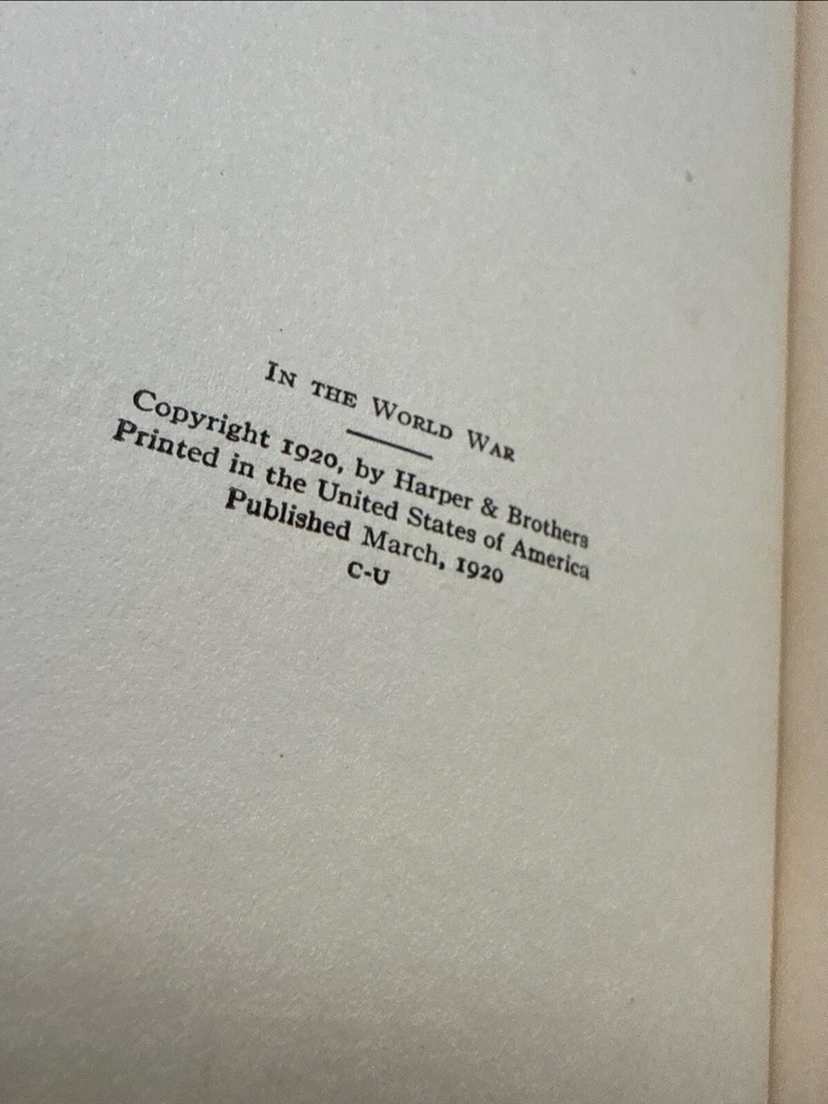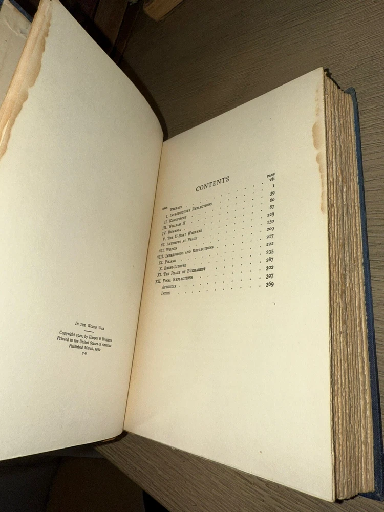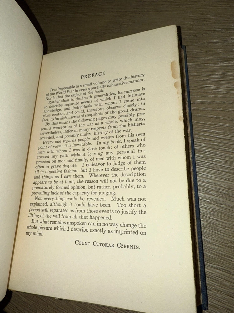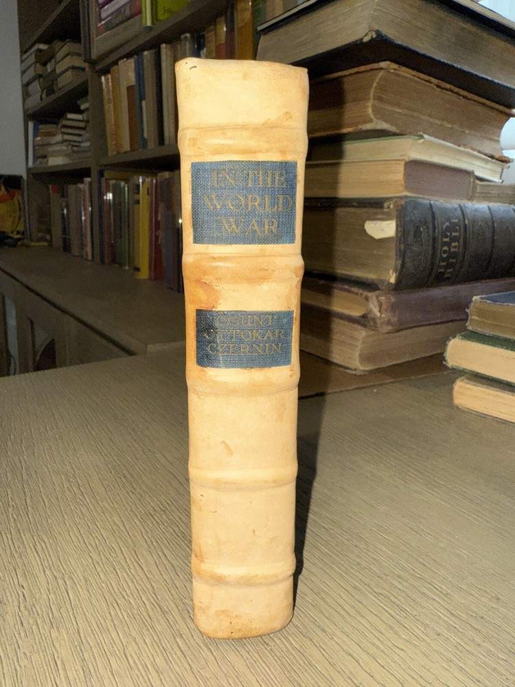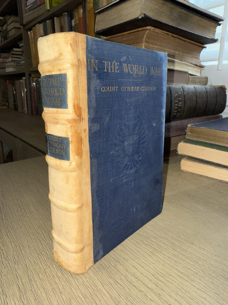 Optimized eBay Title (Max 80 Characters): In the World War Count Ottokar Czernin 1920 WWI Memoir Custom Half-Leather HC eBay Listing Description: In the World War Count Ottokar Czernin Harper & Brothers, New York & London, 1920 Condition: • Binding: Custom half-leather rebinding with original cloth boards. The title and author’s name from the original spine have been affixed to the leather spine. Binding is crisp and solid, indicative of minimal handling post-rebinding. Some amateur aspects, but overall an attractive presentation. • Covers: Blue cloth with gilt lettering and an embossed Austrian coat of arms. The boards show some uneven toning and light spotting. • Spine: Smooth leather spine with raised bands, showing some signs of age toning and handling wear. Some staining around labels from glue. • Text Block: Pages are crisp and securely bound. Some stains to the outer portions of the first several pages. Deckled edges. • Interior: Occasional pencil notations in the margins, otherwise unmarked. Description: This is a custom half-leather bound edition of In the World War by Count Ottokar Czernin, an essential firsthand account of World War I from the perspective of Austria-Hungary’s Foreign Minister. Published in 1920, this memoir provides deep insights into the diplomacy, internal politics, and strategic decisions of the Central Powers. Czernin played a pivotal role in negotiating Austria-Hungary’s exit from the war and offers a unique perspective on the war’s causes, its failures, and the downfall of the Habsburg Empire. His reflections on figures such as Kaiser Wilhelm II and Emperor Karl I are particularly notable. This edition features a custom rebinding in half-leather, with the original title labels adhered to the spine. While the craftsmanship has some amateur qualities, the book remains structurally sound and visually striking. Includes a frontispiece portrait of Czernin, a detailed table of contents, and a preface explaining his motivations for writing the book. Features & Additional Notes: • Custom half-leather rebinding with raised bands and original cloth boards. • First edition, published in 1920 by Harper & Brothers. • Rare first-hand WWI account from Austria-Hungary’s diplomatic leader. • Includes a frontispiece portrait of Count Czernin. • Pages exhibit deckled edges, a feature common in early 20th-century printings. • Light stains to the first several pages but otherwise clean. This is an important historical document and a scarce custom-bound presentation of Czernin’s work, ideal for collectors of military history, European politics, or World War I literature. Item will ship promptly and be packaged securely.