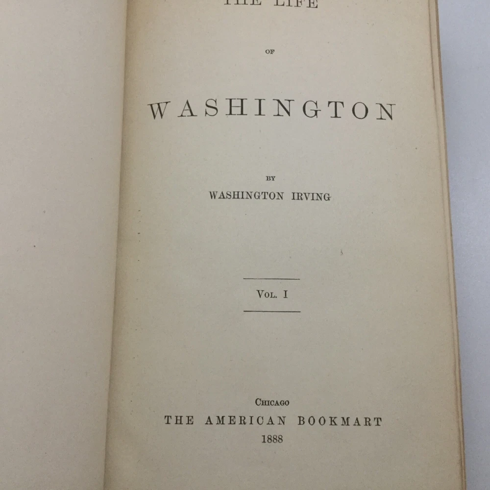 Washington Irving. THE LIFE OF WASHINGTON. 3 Volume set. New York; Belford, Clarke and Company. No copyright date. Quarter bound leather with marbled boards. Page ends are marbled in th same colors as the end pages. Gold stamped title on spine. Volume 1 printed 1888 by American Book Mart , volumes 2 & 3 by Belford, Clarke and Company unknown date