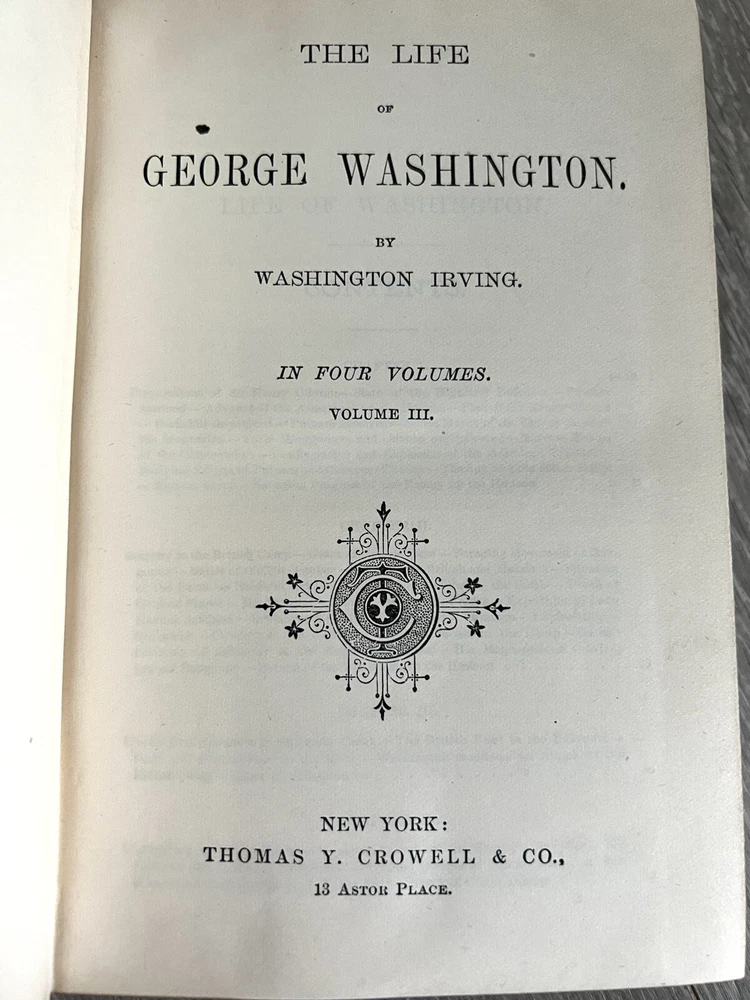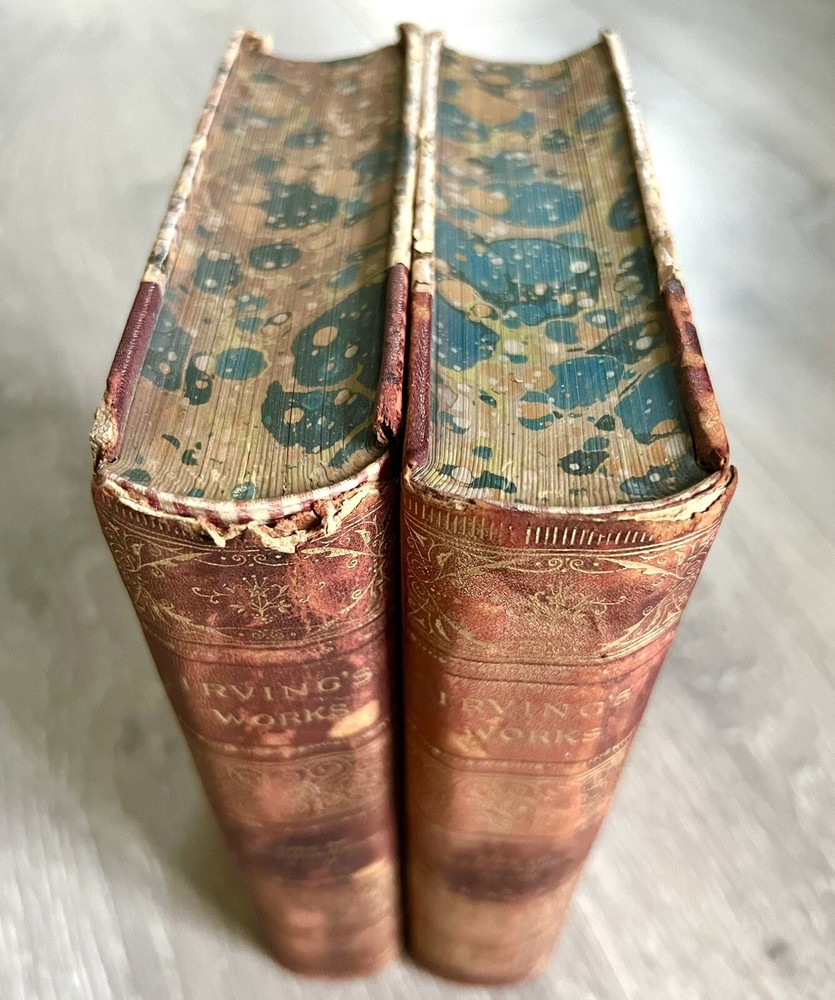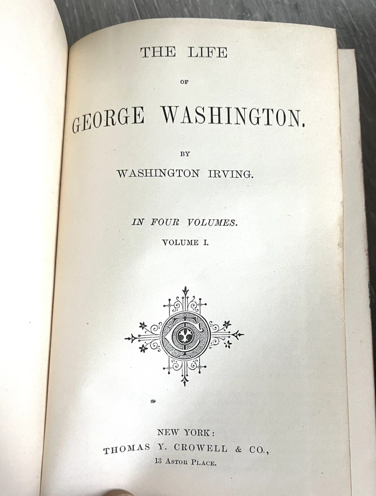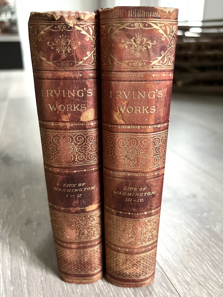 Irving's Works Life of George Washington 4 Books In 2 Volumes Thomas Cromwell. Complete 2-volume set, no date, Thomas Y. Crowell & Company publisher. 1/4 fine calf leather bound with marbled boards, also page edges are marbled. No missing or loose pages, no writing. Beautiful antique set. Please zoom in on photos for details. Will ship insured and bubble wrapped. This is a heavy set.