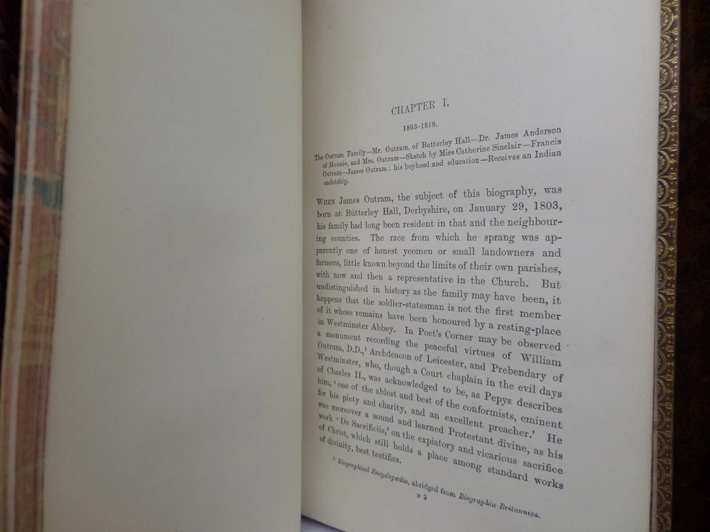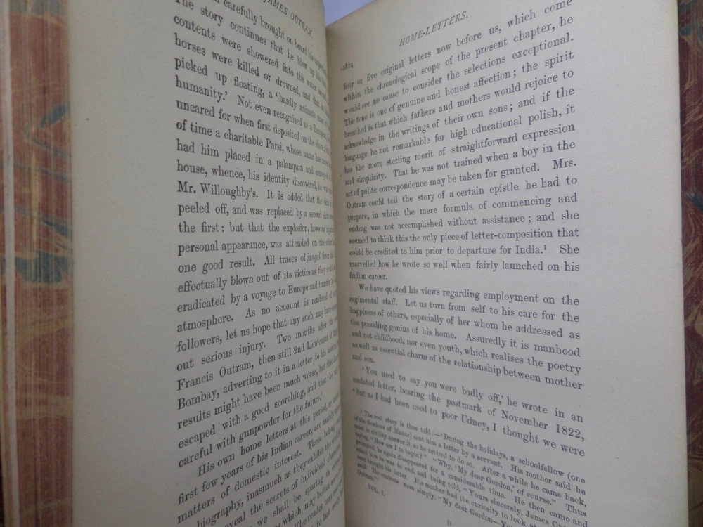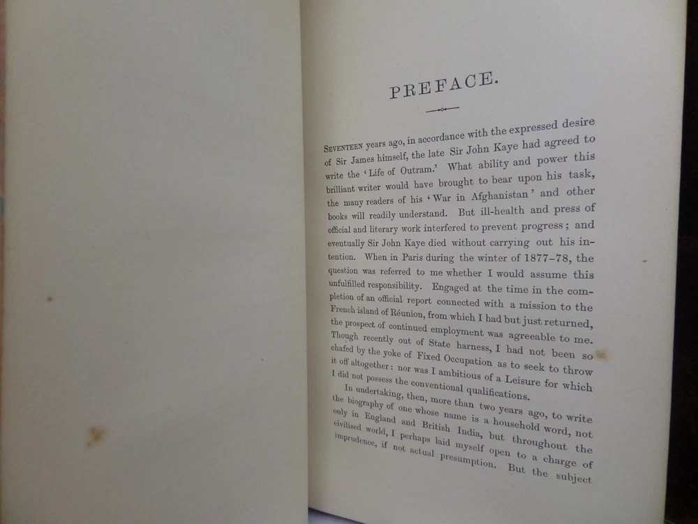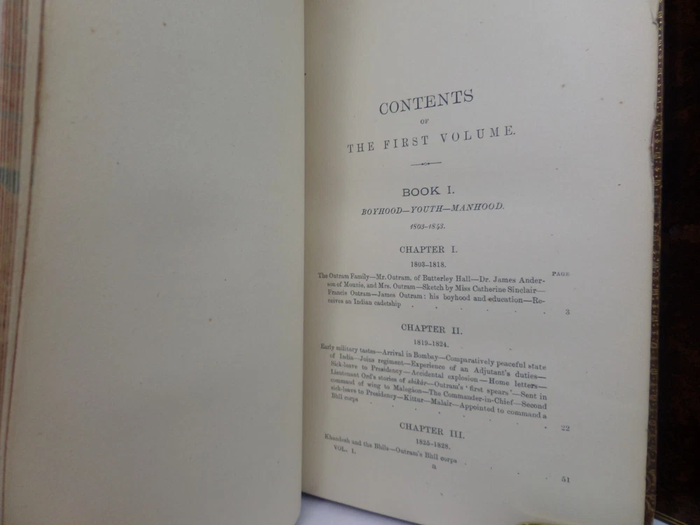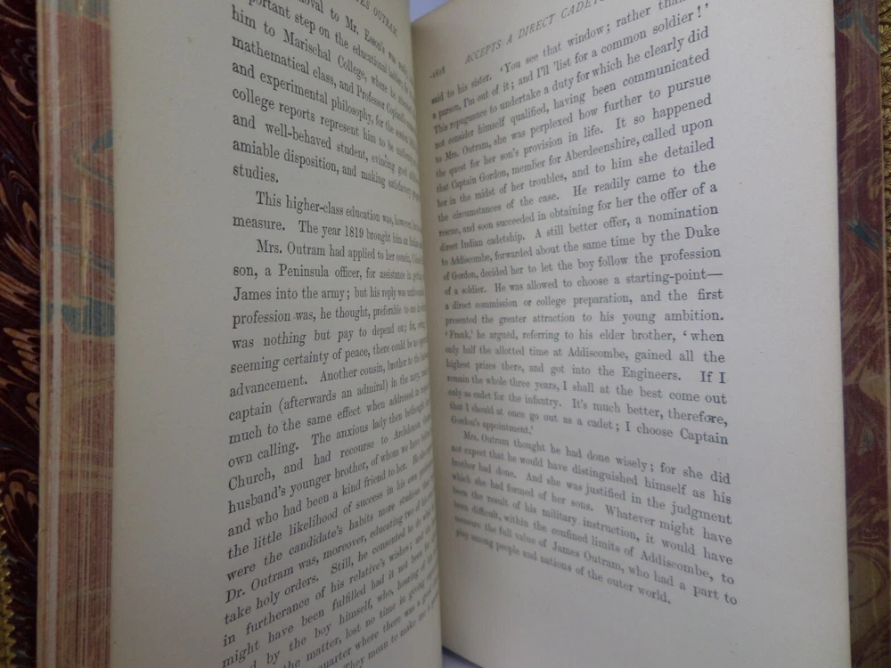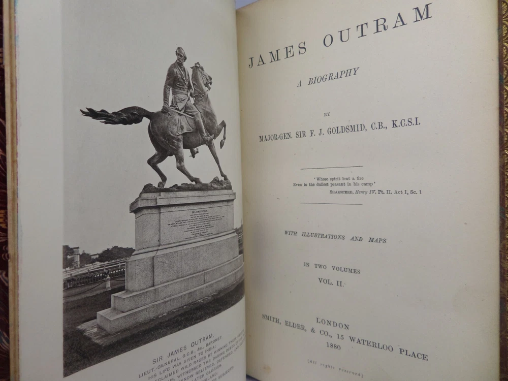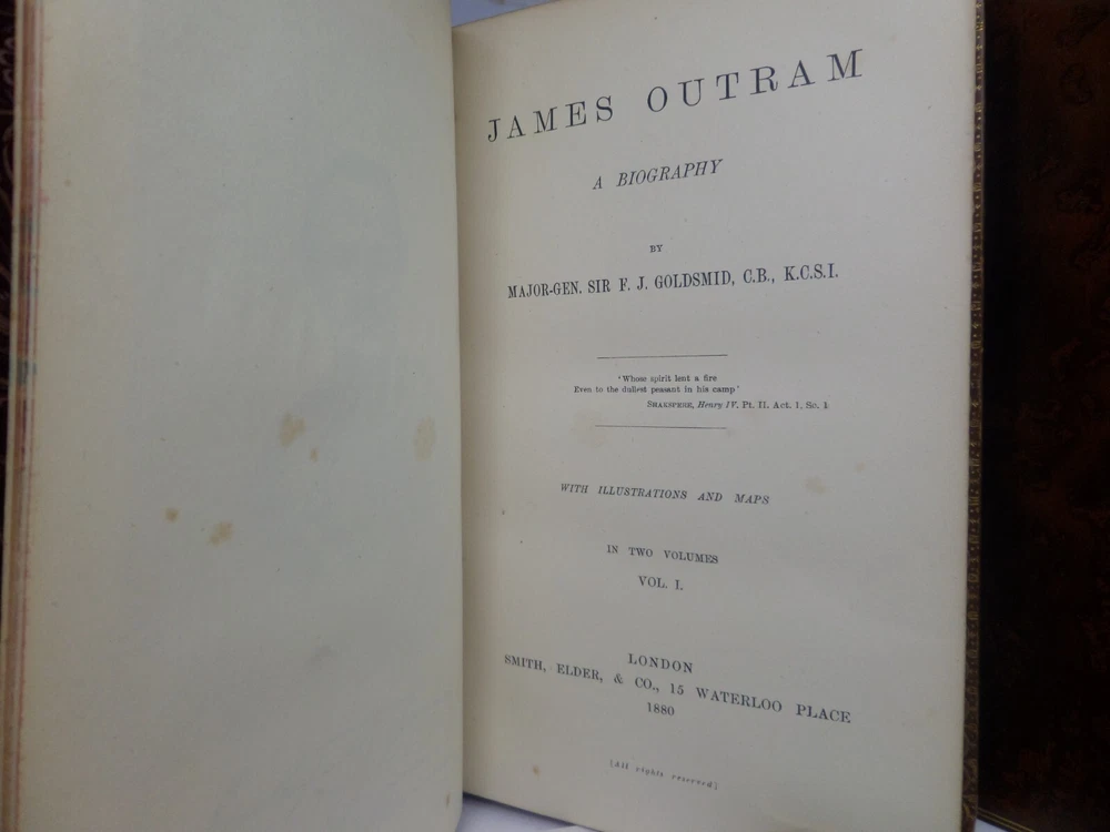 [GOLDSMID, MAJ. GEN. F. J.]. James Outram: A Biography. London: Published by Smith, Elder & Co., 1880. FIRST EDITION; complete in two volumes; leather-bound; hardcover; octavo (22 x 14 cm); pp. xix, 434; vii, [1], 499; English text; handsomely bound in contemporary tree calf gilt by R. Ingalton Drake ; spines with contrasting morocco lettering-pieces; marbled page edges and endpapers; vol. I with a portrait frontispiece and 5 maps, vol. II with 4 illustrations and 3 maps (one of these a folding map at the rear); printed footnotes; appendices and index. Printed by Spottiswoode. Condition: GOOD to VERY GOOD. Bindings tight and secure having been neatly rebacked with the original spines retained. Contents complete, remaining fresh and clean throughout, with a contemporary gift inscription to the front endpaper of volume I. International tracked shipping, dispatched promptly and securely. Please view my other rare books.