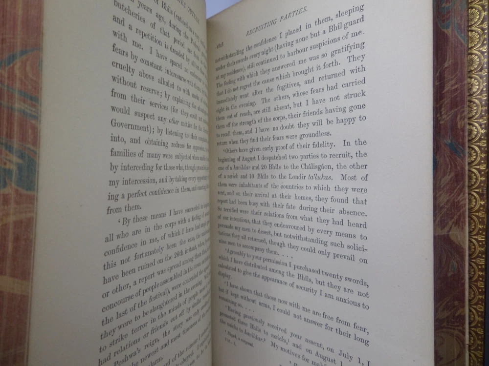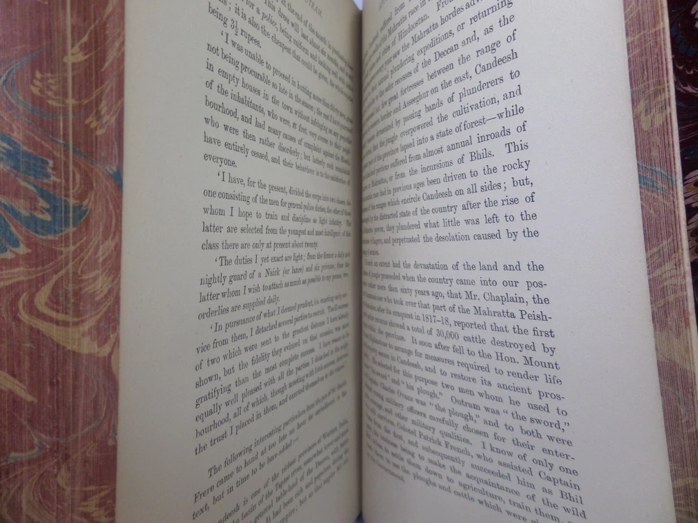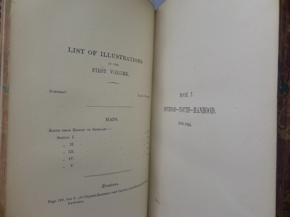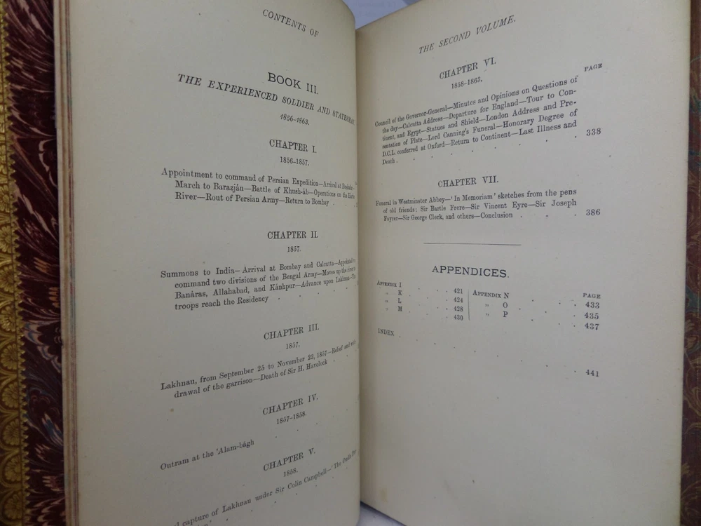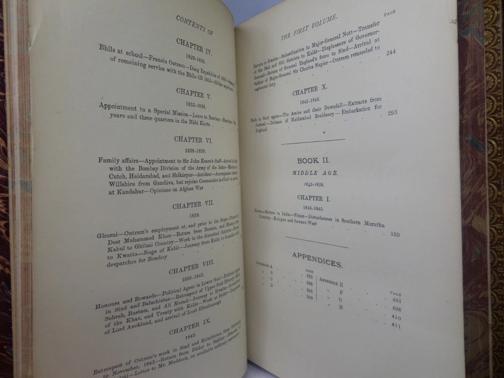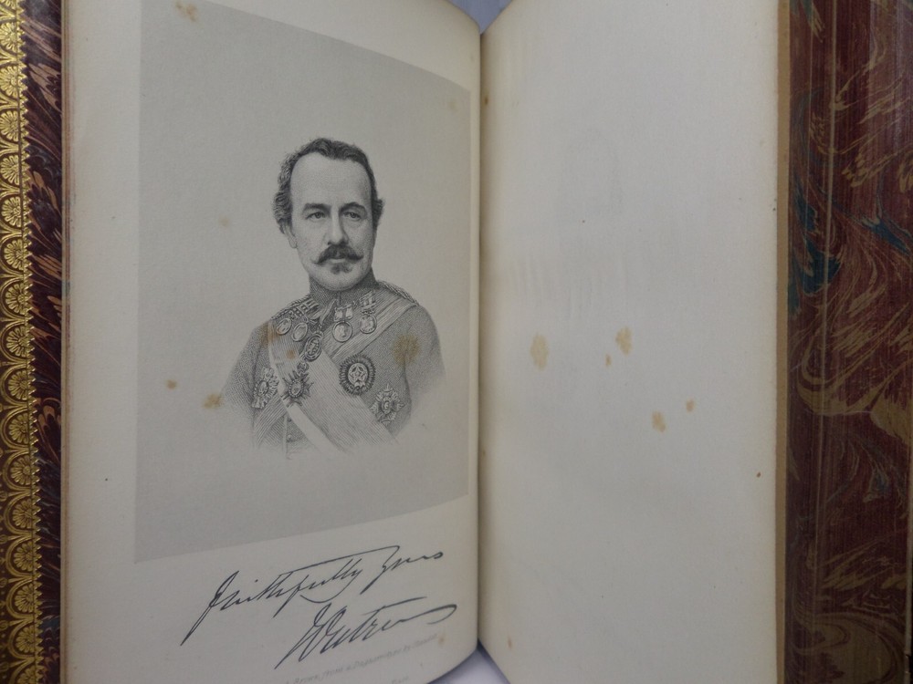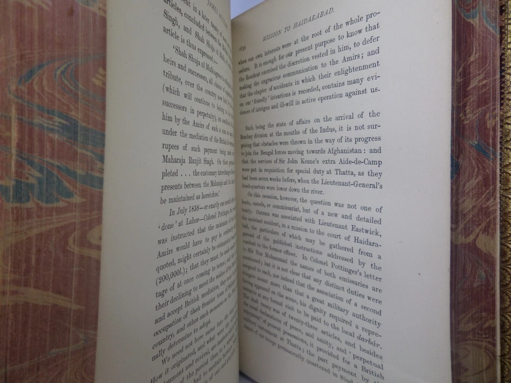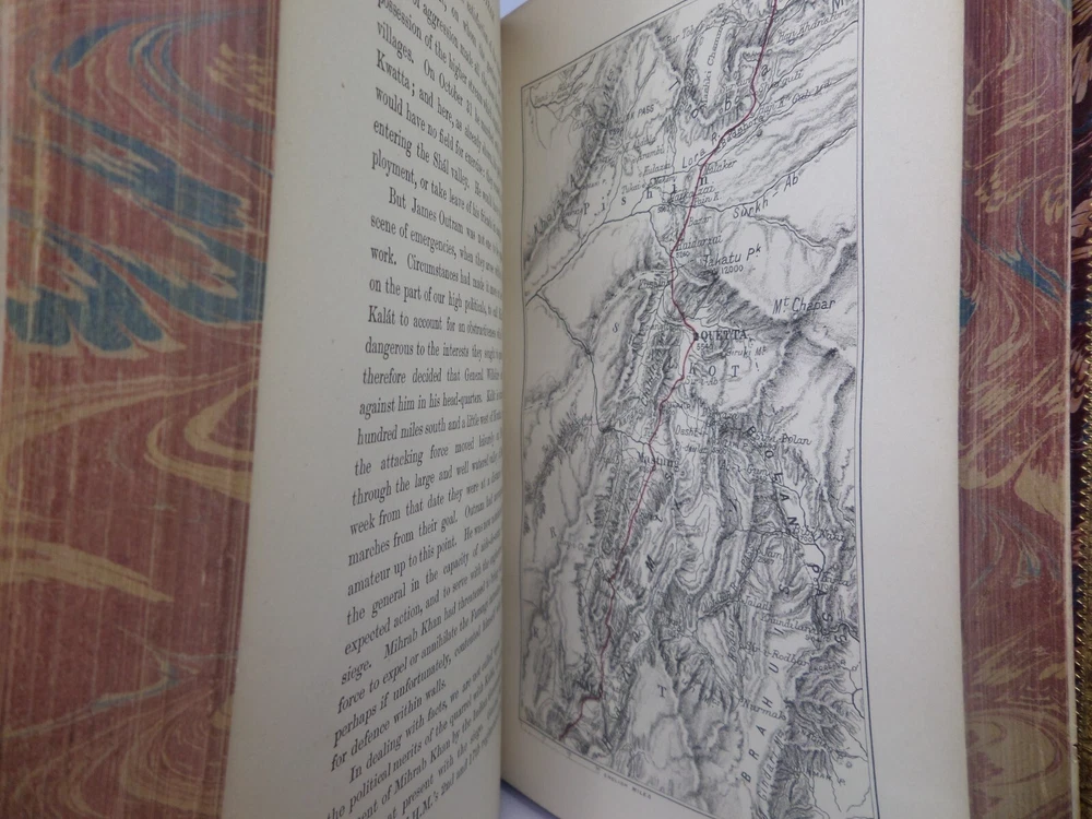[GOLDSMID, MAJ. GEN. F. J.]. James Outram: A Biography. London: Published by Smith, Elder & Co., 1880. FIRST EDITION; complete in two volumes; leather-bound; hardcover; octavo (22 x 14 cm); pp. xix, 434; vii, [1], 499; English text; handsomely bound in contemporary tree calf gilt by R. Ingalton Drake ; spines with contrasting morocco lettering-pieces; marbled page edges and endpapers; vol. I with a portrait frontispiece and 5 maps, vol. II with 4 illustrations and 3 maps (one of these a folding map at the rear); printed footnotes; appendices and index. Printed by Spottiswoode. Condition: GOOD to VERY GOOD. Bindings tight and secure having been neatly rebacked with the original spines retained. Contents complete, remaining fresh and clean throughout, with a contemporary gift inscription to the front endpaper of volume I. International tracked shipping, dispatched promptly and securely. Please view my other rare books.