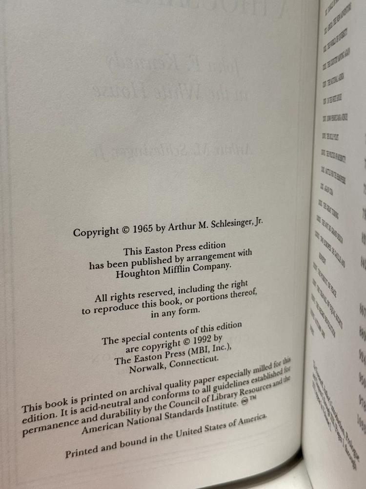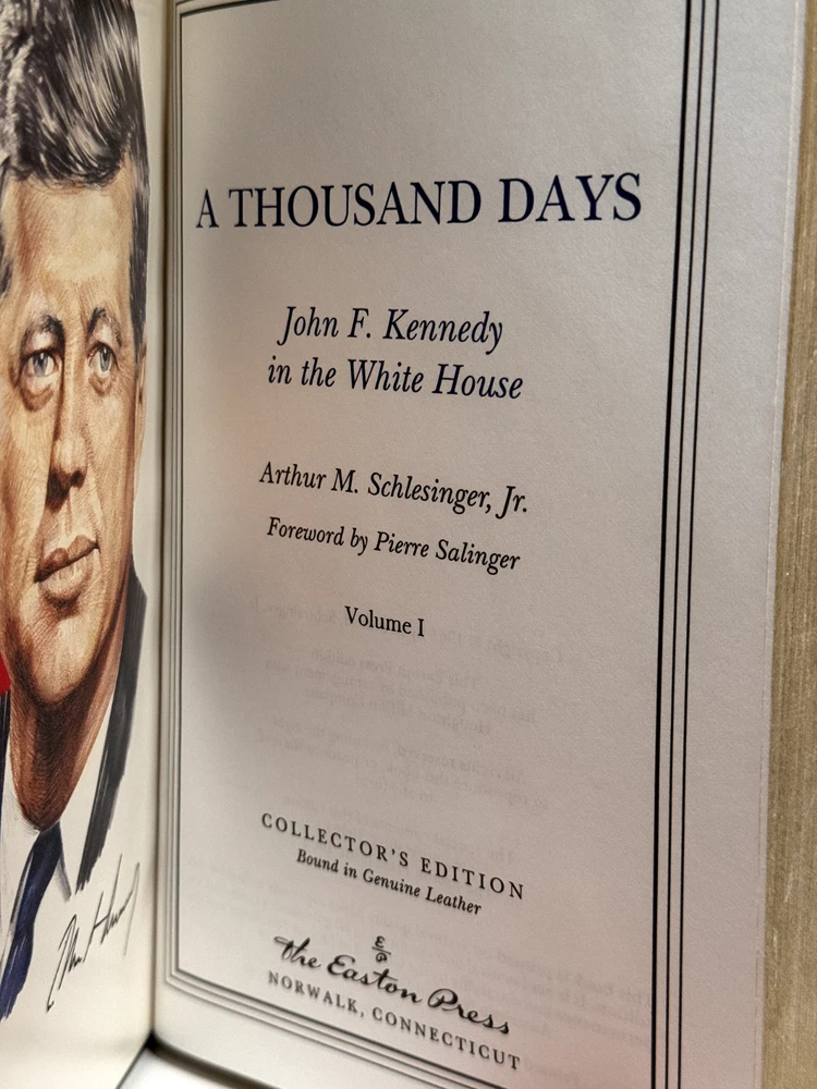 You are bidding on a copy of the Easton Press' LIBRARY OF GREAT LIVES series edition of Arthur M. Schlesinger Jr.'s A THOUSAND DAYS: JOHN F. KENNEDY IN THE WHITE HOUSE. The book is one of the most famous and respected biographies of John F. Kennedy, with an emphasis on his time while serving as the 35th President of The United States of America. Foreword by Pierre Salinger. Bound in beautiful genuine moroccan cowhide leather, the book features raised bars on the spine, gold tooling on the cover and spine, Moire ribbed endpages, satin silk sewn-in bookmark, 22k gold dust on page ends on all 3 sides. Printed on archival quality acid-neutral paper, that will last for generations without diminishing in quality or looks. LIMITED, COLLECTOR'S EDITION, PRINTED SPECIALLY FOR SUBSCRIBERS TO THE LIBRARY OF GREAT LIVES. Free Shipping in all of Continental United States. All other buyers, please check with me for shipping rates before bidding. See my other listings. I have a large collection of rare and collectible books, most leather-bound, others of first edition, first printing, even unpublished manuscripts. I will combine them during shipping so you can receive them together. Just message me your intent to buy more than one book, and I will hold them to be shipped together. Happy Buying!
