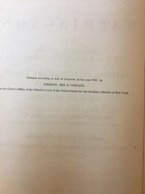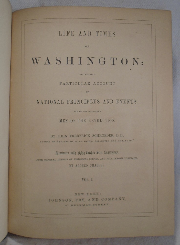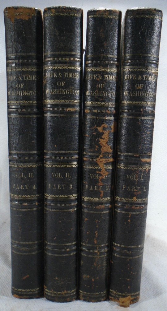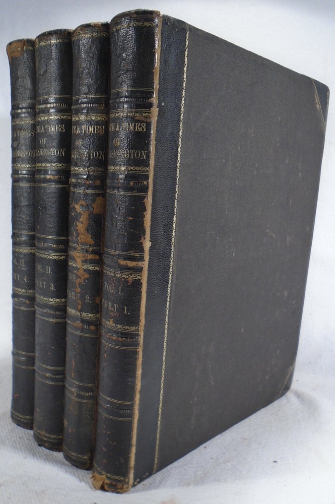 "Life and Times of Washington: Containing a Particular Account of National Principles and Events, and of the Illustrious Men of the Revolution" by John Frederick Schroeder. "Illustrated with highly-finished Steel Engravings, from Original Designs of Historical Scenes, and Full-Length Portraits by Alanzo Chappel". First Edition, 1857. Complete in Two Volumes Bound in Four. Quarto. 3/4 black leather over black cloth, gilt decorations and lettering at front cover and spine, black top edge and other edges marbled, brown edge papers, black and white illustrations throughout. Very good, light wear to edges, spine ends and corners bumped, very faint spotting to cloth, pages agetoned. Text blocks tight. This set was a gift from Civil War Rear Admiral James Findlay Schenck to his grandson. INSCRIBED AND SIGNED BY SCHENCK IN EACH OF THE FOUR VOLUMES! Very Scarce Autograph! James Findlay Schenck (June 11, 1807 – December 21, 1882) was a rear admiral in the United States Navy who served in the Mexican–American War and the American Civil War. His younger brother, Robert C. Schenck, was a Union Army General and a United States Ambassador to Brazil. SIGNED x4 CIVIL WAR REAR ADMIRAL JAMES FINDLAY SCHENCK