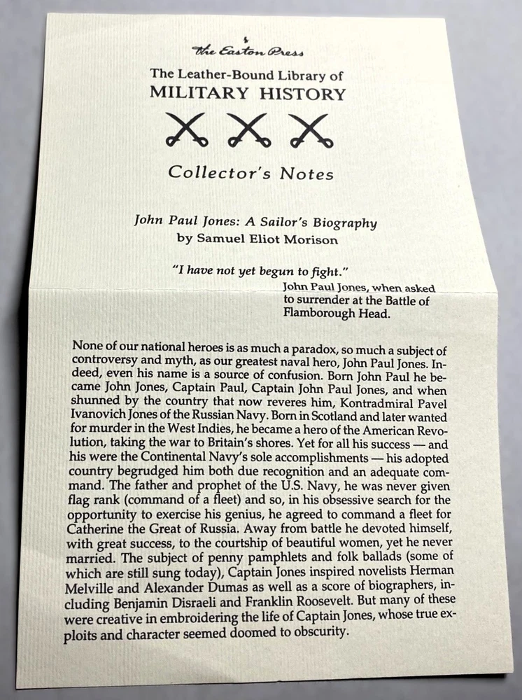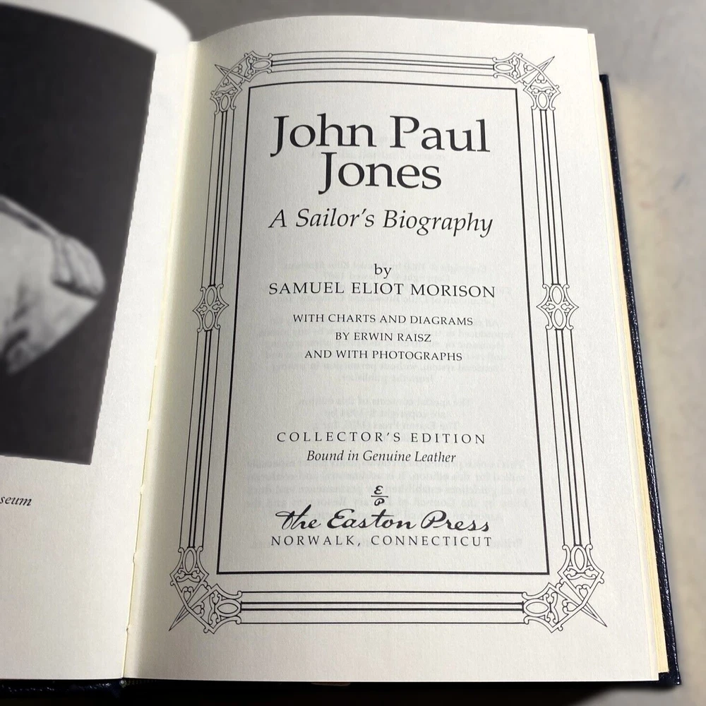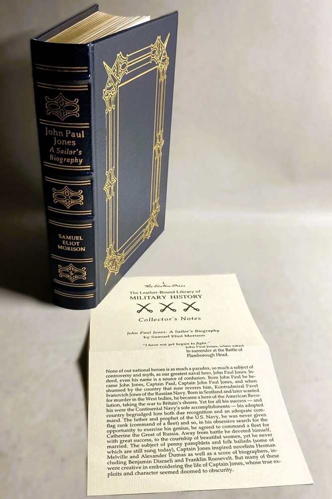 Beautiful Leather-Bound Limited Collector’s Edition of *** John Paul Jones – A Sailor’s Biography *** by Samuel Eliot Morison With Charts and Diagrams by Erwin Raisz And with Photographs *************************************************************** Condition : LIKE NEW / FINE / MINT Published by Easton Press in 1994 Bound in Genuine Leather Hubbed Spine with Smyth-sewn Binding Accented in 22 kt GOLD Printed and Bound in the United States of America on Acid-neutral, archival quality paper especially milled for this edition and conforming to the guidelines established for permanence and durability by the Council of Library Resources and the American National Standard Institute . *************************************************************** ** BOOK GRADING ( CONDITION ) STANDARDS ** BRAND NEW / FACTORY SEALED Self-explanatory. LIKE NEW / FINE / MINT Virtually new, without faults or defects. The highest grade given to books, aside from BRAND NEW. NEAR FINE (NF) / NEAR MINT Excellent condition with few VERY minor “defects” such as faint signs of wear and/or rubbing. No markings of any sort. (i.e. ownership (“Ex Libris”) markings, underlining, notes, highlighting, book plates, etc… The binding should still be firm. VERY GOOD PLUS (VG+) Approaching NEAR FINE with the exception of a few more signs of wear or rubbing. No markings of any sort. (i.e. ownership (“Ex Libris”) markings, underlining, notes, highlighting, book plates, etc… The binding should still be firm. VERY GOOD (VG) A typical used book which is no longer fresh and crisp, but it is still complete and will have no major defects. Potential Defects Present: Book plates or other ownership (“Ex Libris”) marks. Few small scuff marks and/or scratches on cover, corners and/or edges may have a bit more wear. Cloth on boards slightly faded. Dust covers may have a few minor flaws such as a closed tear or minor chip or chipping or a price clipped front flap. The binding should still be fairly firm. If any major defects are present, they will be noted. GOOD (G) A well-worn, used book which still has all of its pages. The lowest grade given to collectable books. Potential Defects Present: Should have no more than one major defect such as a cracked hinge, or damp staining. If the cloth binding is torn or heavily faded it would cause the book to be graded as "good". If a dust jacket has major tears, heavy chipping, or tape repairs it should be graded as good. Any major defects will be noted. FAIR A heavily worn, used book. Several defects present. I will not normally buy or sell books in this condition, with the exception of VERY rare books. ** GENERAL EXAMPLES OF DEFECTS ** VERY MAJOR Water damage, binding breaks, underlining in text, large tears, pages missing, ex-library copies, mold or mildew damage. MAJOR Small tears, spine slant (roll), rip to the cloth or paper binding, hinge or joint of binding starting to separate. MINOR Fading of the cloth or paper binding, dust jacket scuffed or rubbed, light soiling, minor chipping on any edges. ALTERATIONS Book plates or other ownership (“Ex Libris”) markings book plates, gift inscriptions or a remainder mark on one of the edges of the text block, front flap of dust jacket is price clipped. If a different shipping method is preferred, please message me prior to purchase & I will let you know as soon as I update the listing with the new shipping method .