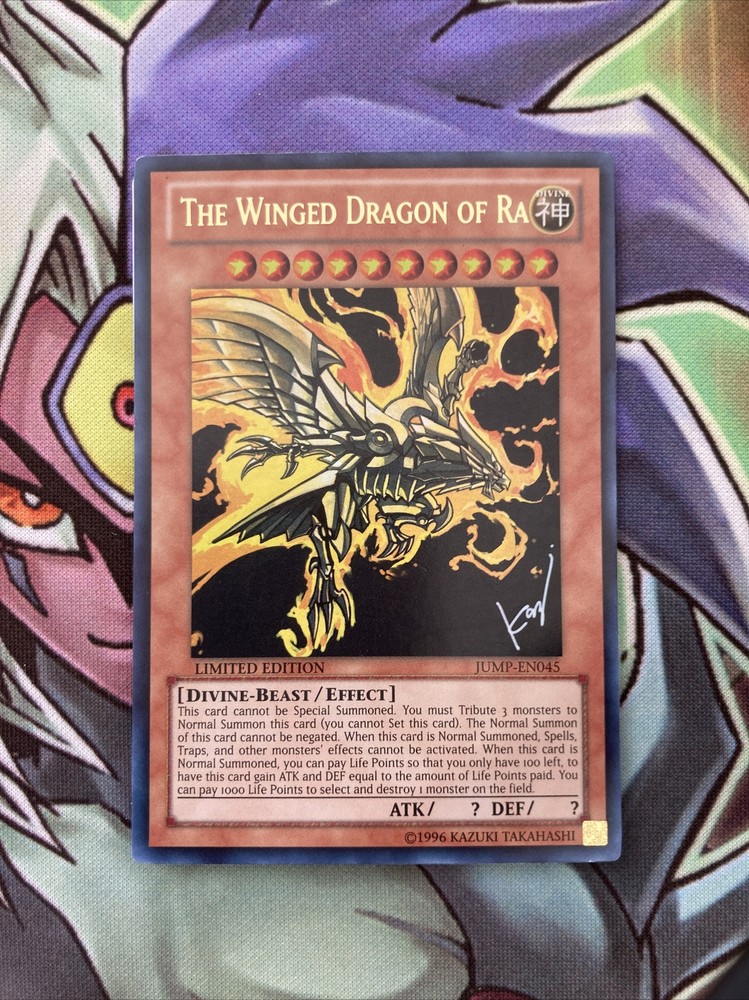 Listing Template 2018 Home About Us Shipping Returns View Feedback Contact Us JUMP-EN045 The Winged Dragon Of Ra Ultra Rare Limited Edition NM Yugioh Card This card is in near mint condition. Please check the photos for more questions on condition or please just ask! Thanks for viewing! Please check out my eBay store for more cards and to use our promotional offers! We offer COMBINED INTERNATIONAL SHIPPING! Please contact us and ask us to combine your shipment! We provide UK free postage! All of our cards are sleeved, with a taped Toploader to ensure maximum protection, and the best overall condition of your cards! Do you want to earn extra cash for your old cards? Clear out your binder and send us photos of what you have! We will happily send you an offer and sort out postage to make it hassle free. There's no harm in trying! Message us now! You will receive these cards in very good condition as shown! Thanks for looking! Free delivery. Honest Sellers. We care about your cards and your satisfaction. About Us Based in United Kingdom, twintraders has been an eBay member since 02 Mar, 2006 Contact Us The best way to contact us is through the eBay messaging system. You can send us a message by using the "Questions and answers" section towards the bottom of the page. Feedback We will always help you to have a 100% positive happy buying experience. Contact us if you are unhappy about any aspect of your purchase from us. We only want five star feedback from you so buy with confidence. View Our Categories