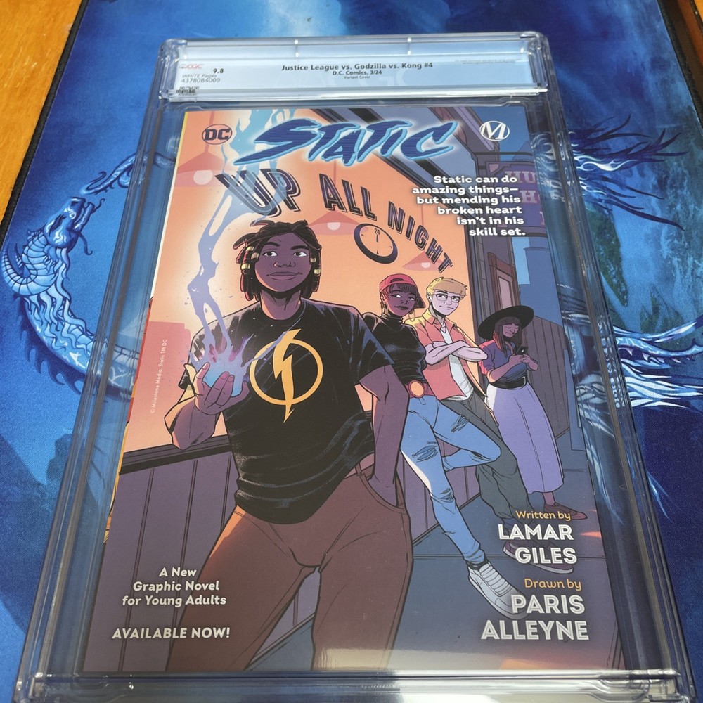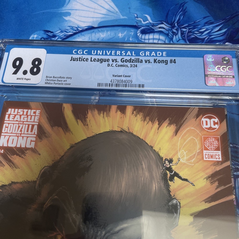 The product is a rare and highly coveted variant cover of Justice League Vs. Godzilla Vs. Kong #4 featuring artwork by Whilce Portacio. This CGC 9.8 graded collectible features characters like King Kong, Supergirl, and Nightwing within the DC Universe. The publication year is set for 2024, placing it within the modern age era of US comics. With its unique cover and high grade, this comic is a valuable addition to any collector's library, showcasing a dynamic and action-packed storyline involving superheroes and iconic monsters.
