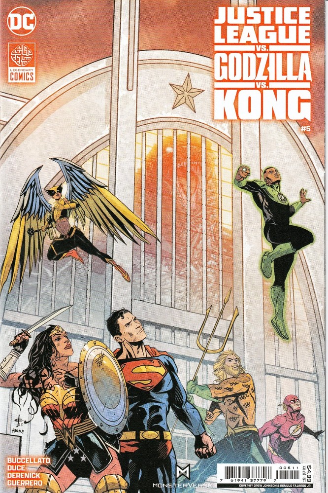 JUSTICE LEAGUE VS GODZILLA VS KONG #5 (2023) Written by Brian Buccellato. Art by Christian Duce, Tom Derenick. Cover by Drew Johnson. The cataclysmic crossover between the DCU and Legendary's Monsterverse continues! The Justice League have regrouped after their initial losses and discover nefarious plans by the Legion of Doom AND the League of Assassins are underway to use the Monsters for their evil purposes. As Lois Lane uncovers truths about the monster's identities, the League also learns of a beacon that's drawing all the creatures to one location...the final battle to save Earth is about to begin! 40-pages, full color. Rated T+ Cover price $4.99. UNREAD NEAR MINT FRESHLY BAGGED AND BOARDED WE DON'T USE STOCK PHOTOS ONE PRICE SHIPPING IS $4.98 NO MATTER HOW MUCH YOU BUY $4.98 USPS TRACKED SHIPPING TO ANY USA ADDRESS NO RETURNS PACKED VERY SECURELY ~ SHIPPED IN A GEMINI COMIC BOOK MAILER