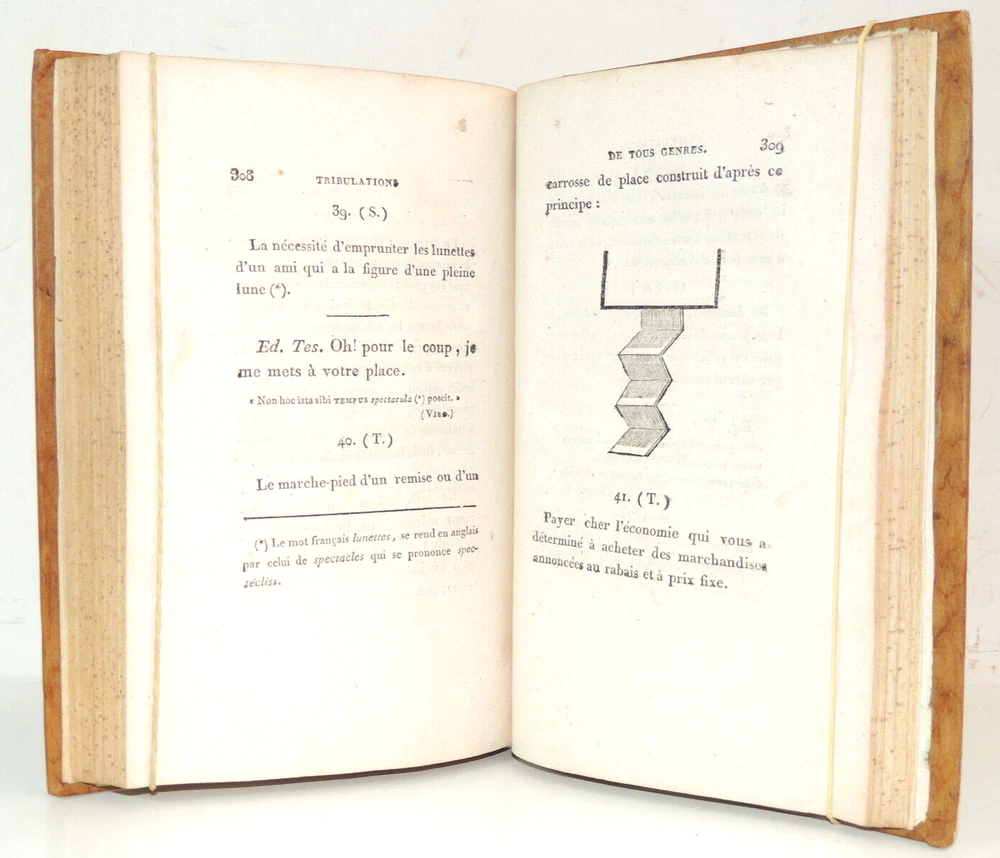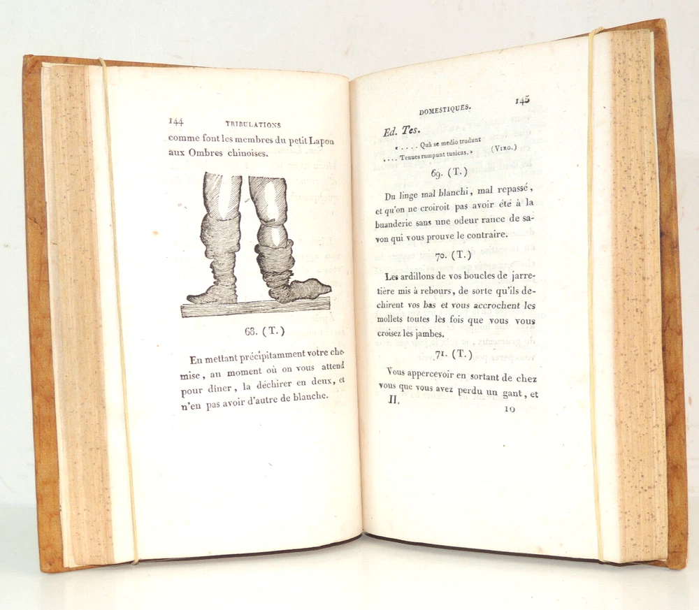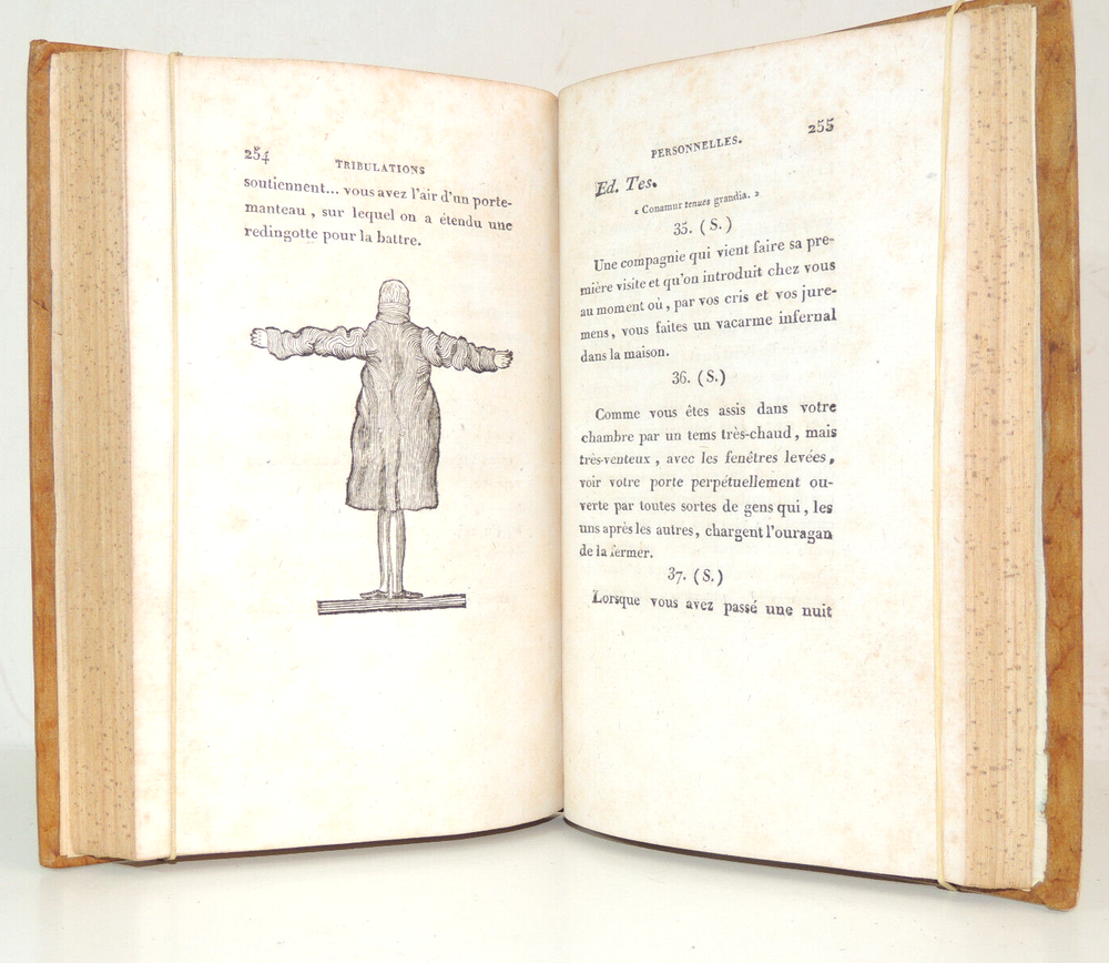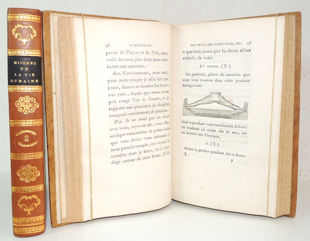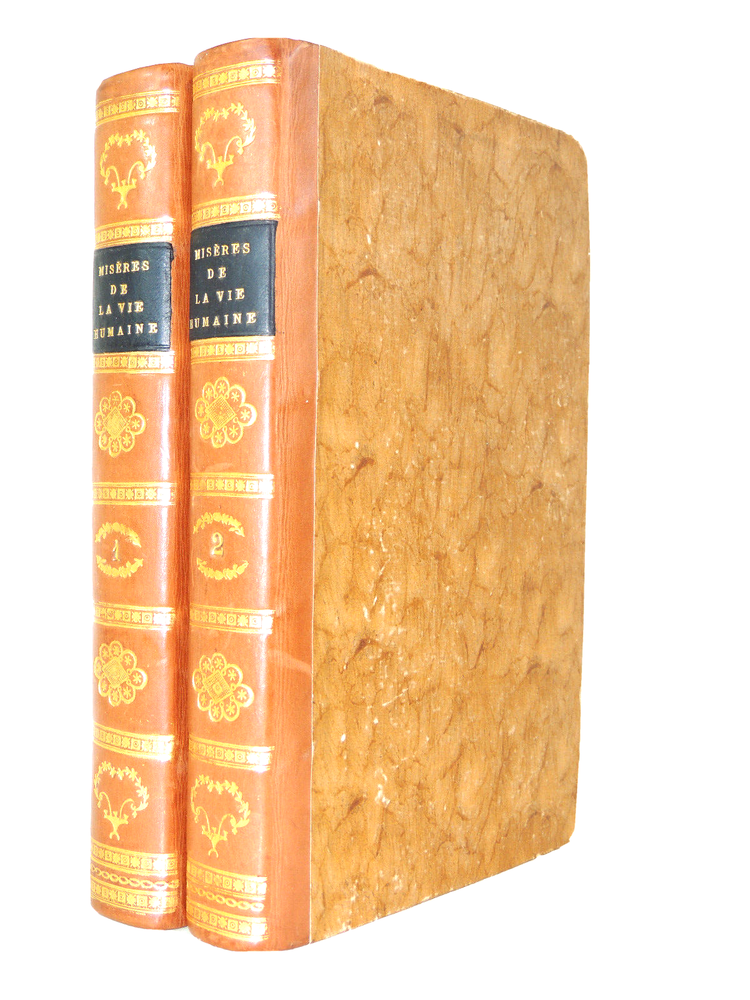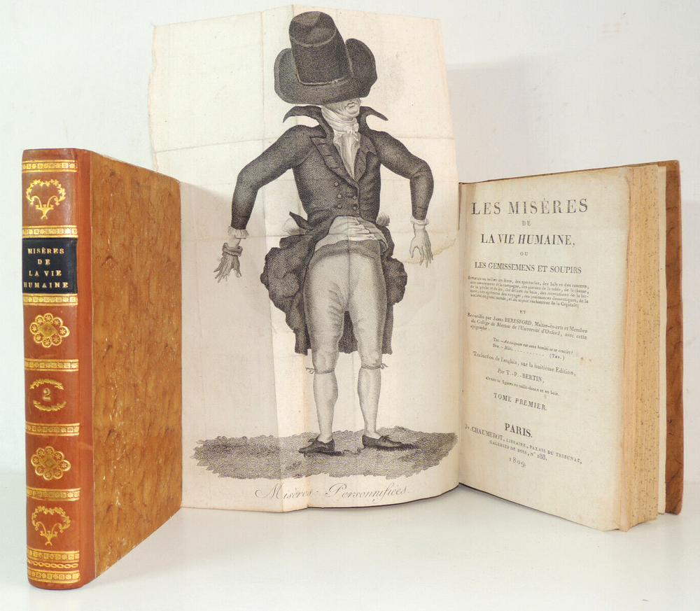 James Beresford. Miseries of Human Life or the Groans and Sighs The description of this item has been automatically translated. If you have any questions, please feel free to contact us. THE MISERIES OF HUMAN LIFE or THE MOANS AND SIGHS exhaled in the midst of festivals, shows, balls and concerts, the amusements of the countryside, the pleasures of the table, hunting, fishing and games, the delights of the bath, the recreations of reading, pleasures of travel, domestic pleasures, high society, and the enchanting stay of the capital James Beresford Original edition of the French translation, translated by Bertin vol.in-8, 200x130, half calfskin bound, title label, superb bindings in perfect condition, very fresh interior, 383 & 386pp (complete in two volumes) illustrated with 2 beautiful lithographs in the frontispiece, and vignettes in the text Paris Chaumerot, 1809 Very beautiful copies! rare ! 25/4 THE MISERIES OF HUMAN LIFE or THE MOANS AND SIGHS exhaled in the midst of festivals, shows, balls and concerts, the amusements of the countryside, the pleasures of the table, hunting, fishing and games, the delights of the bath, the recreations of reading, pleasures of travel, domestic pleasures, high society, and the enchanting stay of the capital James Beresford Original edition of the French translation, translated by Bertin vol.in-8, 200x130, half calfskin bound, title label, superb bindings in perfect condition, very fresh interior, 383 & 386pp (complete in two volumes) illustrated with 2 beautiful lithographs in the frontispiece, and vignettes in the text Paris Chaumerot, 1809 Very beautiful copies! rare ! 25/4 Objet modifié Non Époque Jusqu'au XVIIème siècle Reliure Cuir Langue Français Caractéristiques spéciales Édition originale Caractéristiques spéciales Illustré Sujet Philosophie Auteur James Beresford.
