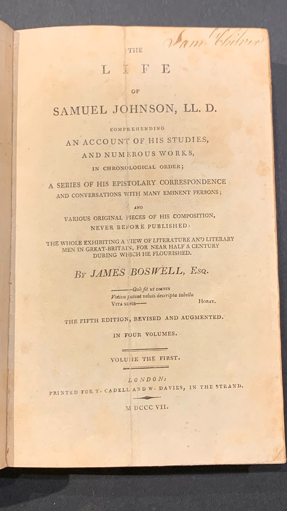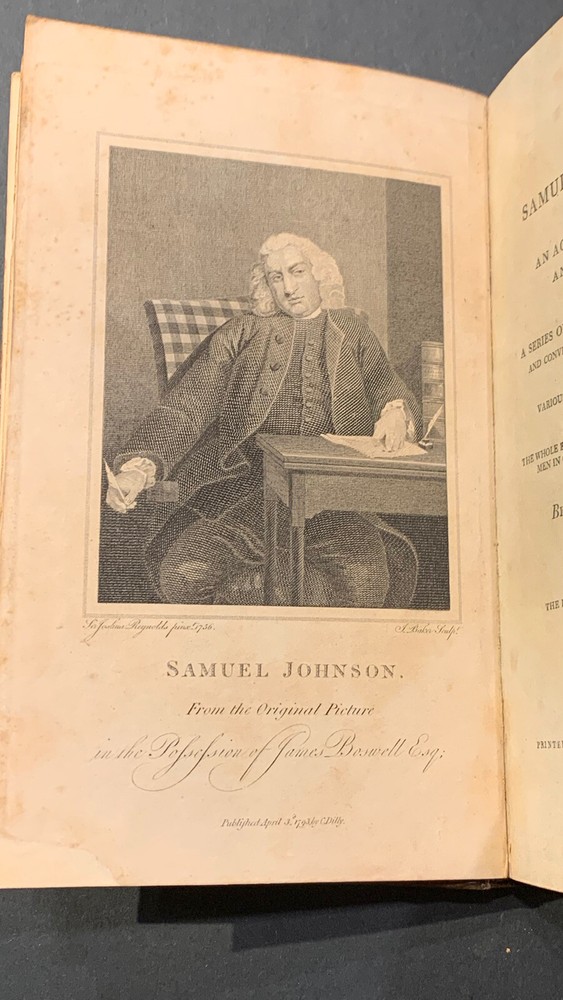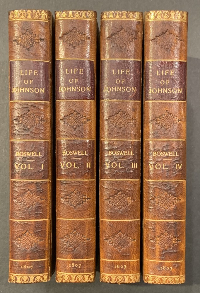 James Boswell “Life of Samuel Johnson” 1807 Fifth Edition in 4 volumes. Bound in leather. Overall in good condition. Minor foxing and staining. Interior mostly clean. Binding in good condition. Some bumps and rubs but otherwise a nice presentation.
