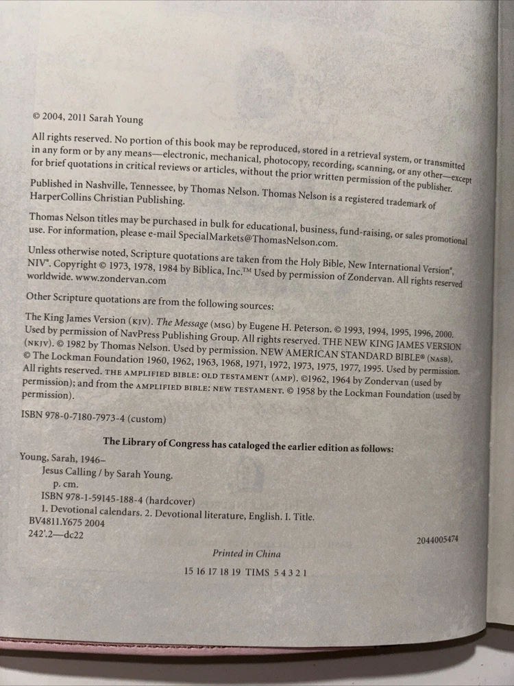 Jesus Calling : Enjoying Peace in His Presence by Sarah Young 2011 Minor Damage to cover and edge of binding (shown in photos) and handwritten dedication and year (also shown in photos). No other writ...