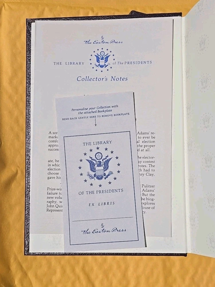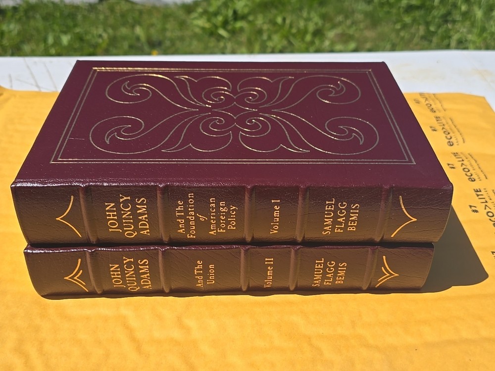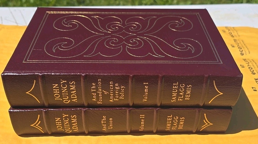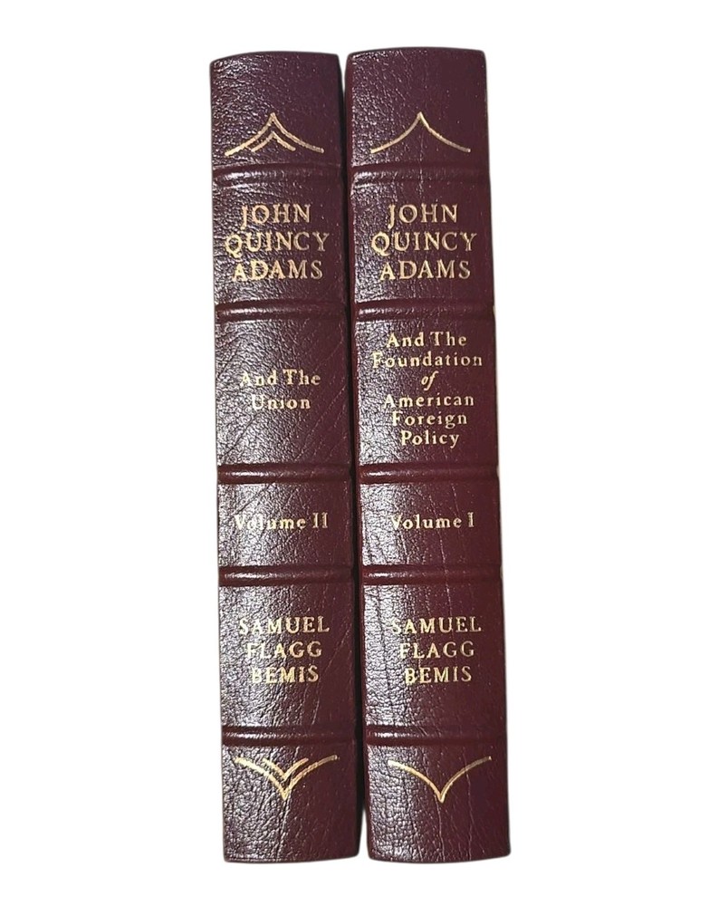 Rare, like new condition. Both volumes were kept in plastic wrap and remain in fresh, unused condition. Includes certificates of authenticity and two unused Easton Press bookplates. John Quincy Adams by Samuel Flagg Bemis – Easton Press 2-Volume Leather-Bound Set (1987) This is the complete 2-volume set of John Quincy Adams by Pulitzer Prize-winning historian Samuel Flagg Bemis, published by Easton Press in 1987 as part of their Library of American History collection. A masterful and definitive biography of the sixth U.S. President, this set offers both scholarly depth and literary elegance, covering Adams’ life, diplomacy, and political career. Features: Premium full genuine leather binding 22kt gold embossing on the covers and spine Gilded page edges for added protection and beauty Satin ribbon page markers Silk moiré endpapers Archival-quality, acid-neutral paper Smyth-sewn binding for durability and longevity Volumes Included: John Quincy Adams and the Foundations of American Foreign Policy John Quincy Adams and the Union