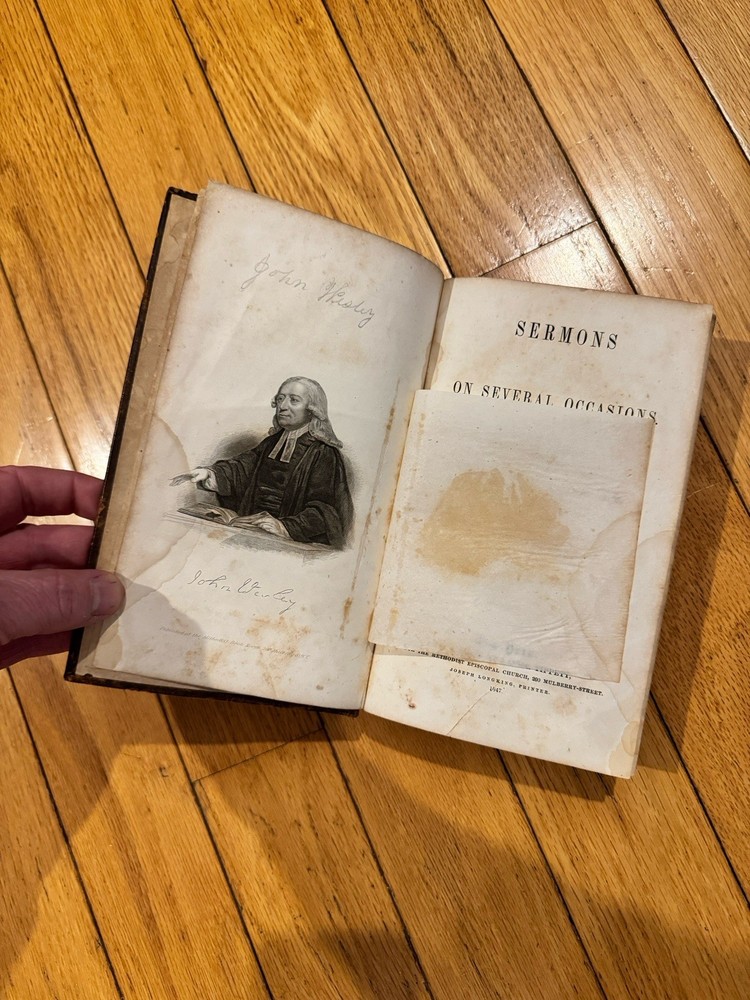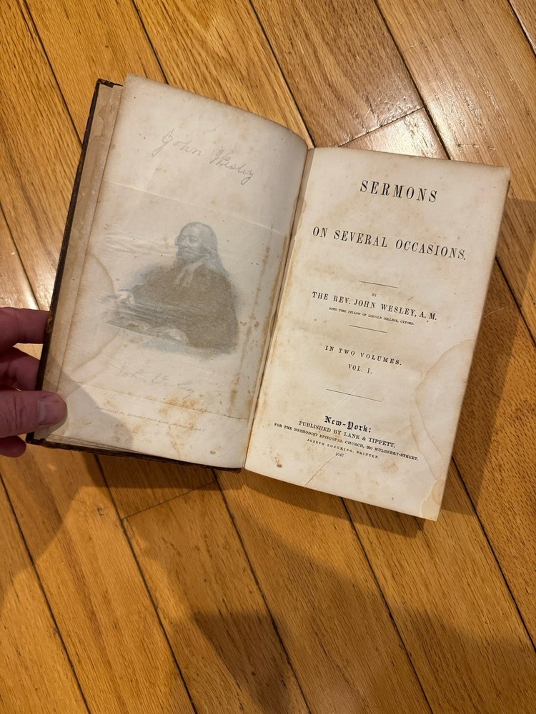 **Rare 1847 Edition: John Wesley's "Sermons on Several Occasions" - Exceptional Condition** This remarkable 1847 printing of John Wesley's foundational work "Sermons on Several Occasions" represents a significant piece of Methodist and broader Christian heritage. The volume showcases the timeless theological insights of one of the most influential figures of the Great Awakening, whose sermons shaped the spiritual landscape of the 18th and 19th centuries. **Physical Condition:** This copy is in exceptionally fine condition for a volume approaching two centuries old. The original leather binding remains supple and intact, showing minimal wear consistent with careful handling over the generations. The binding is solid and secure, with no loose pages or structural issues. Interior pages display only light foxing - the gentle brown spotting that naturally occurs with age - which does not impair readability and actually adds to the authentic character of this historical volume. **Historical Significance:** John Wesley's sermons were instrumental in the Methodist revival movement and the broader evangelical awakening that transformed religious life in Britain and America. This 1847 edition captures Wesley's powerful theological voice during a period when his influence continued to spread across denominational lines. Wesley's emphasis on personal holiness, social justice, and evangelical fervor resonates throughout these pages, making this not merely a book, but a window into the spiritual transformation of nations. **Collector's Value:** Mid-19th century editions of Wesley's works are increasingly scarce in such excellent condition. The combination of historical importance, theological significance, and remarkable preservation makes this volume an exceptional acquisition for collectors of religious texts, Methodist history, or Great Awakening materials. This is your opportunity to own a tangible connection to one of Christianity's most pivotal figures and movements - a work that continues to inspire and instruct believers nearly three centuries after Wesley first delivered these transformative messages.