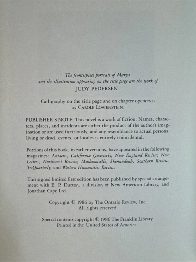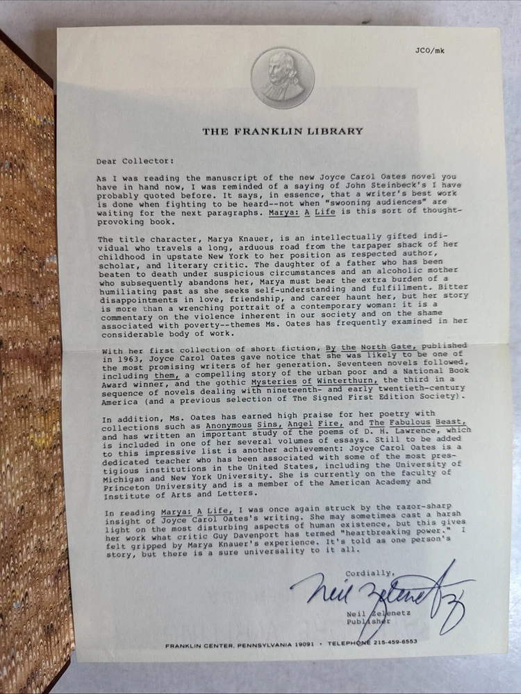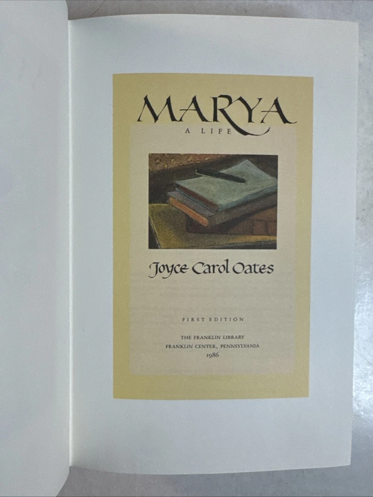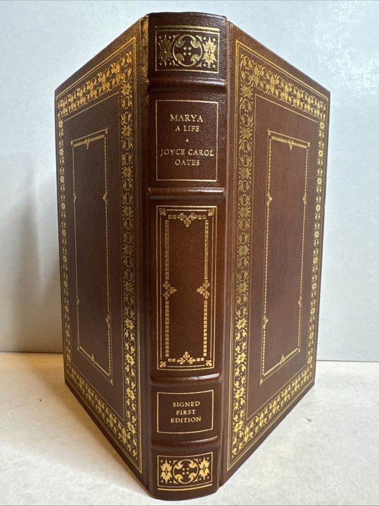 Immerse yourself in the literary prowess of Joyce Carol Oates with the 1986 Franklin Library first edition of "Marya: A Life." This exquisite leather-bound volume is a testament to Oates's mastery in storytelling, offering readers a chance to own a piece of historical literature. The book comes exquisitely crafted, with a focus on the art of bookmaking that befits its status as a collector's item. The Franklin Library edition is renowned for its high-quality leather and detailed embossing, making it a standout addition to any collection. Fans of Oates's work and collectors alike will appreciate the significance of this signed first edition, which promises to be a timeless piece. With its place firmly in the realms of both antiquarian and collectible books, it's a treasure that holds intrinsic value for enthusiasts and readers alike.