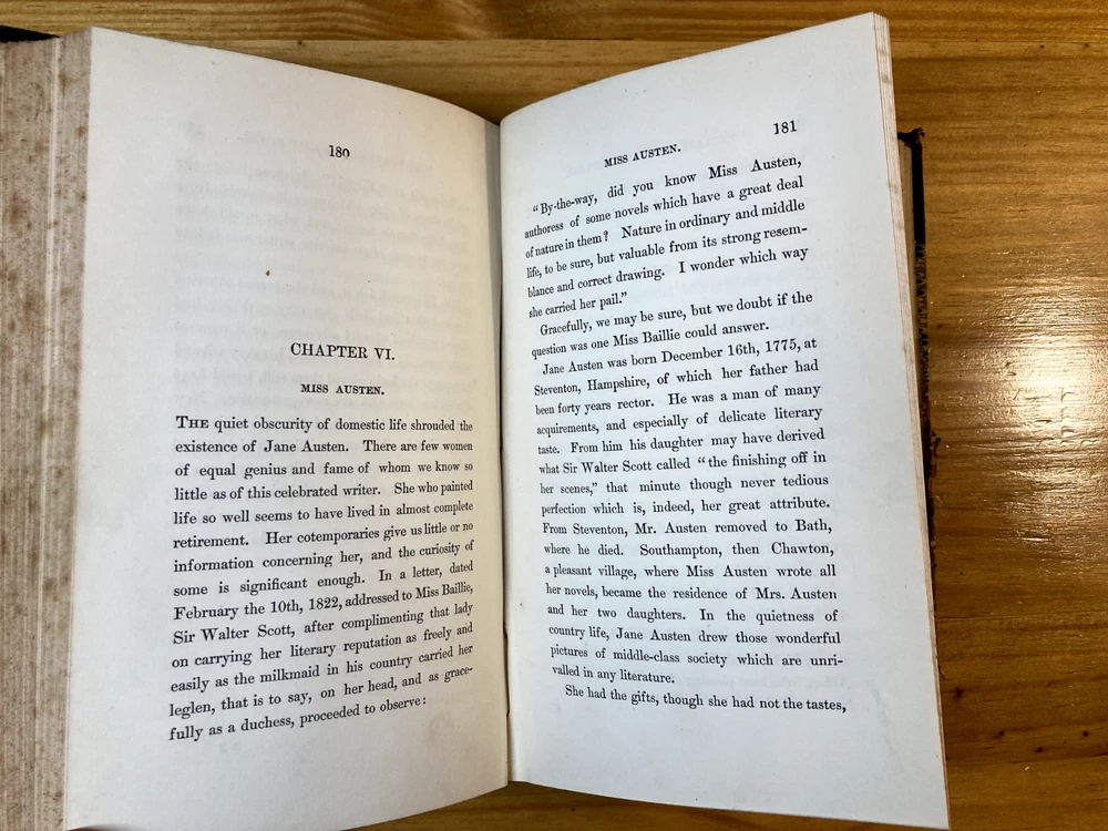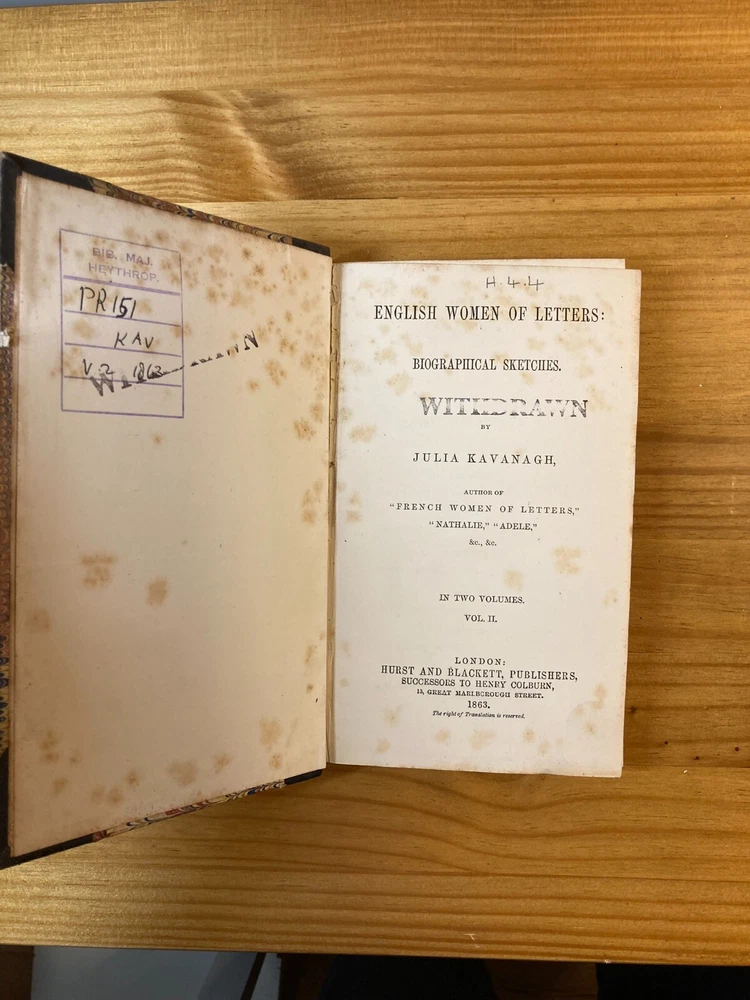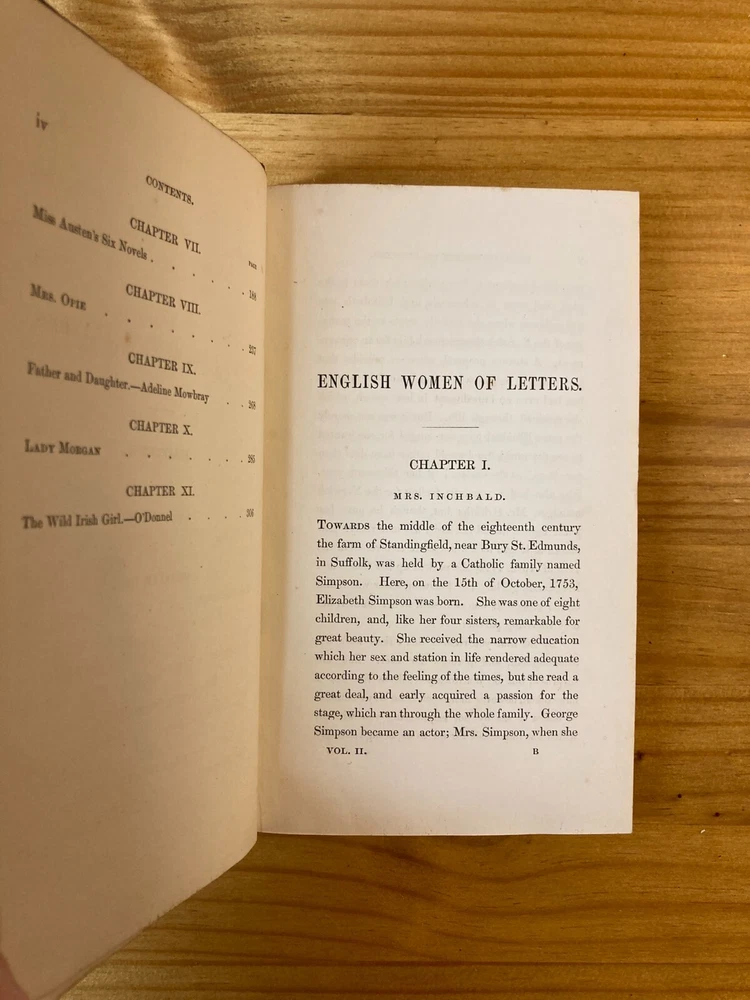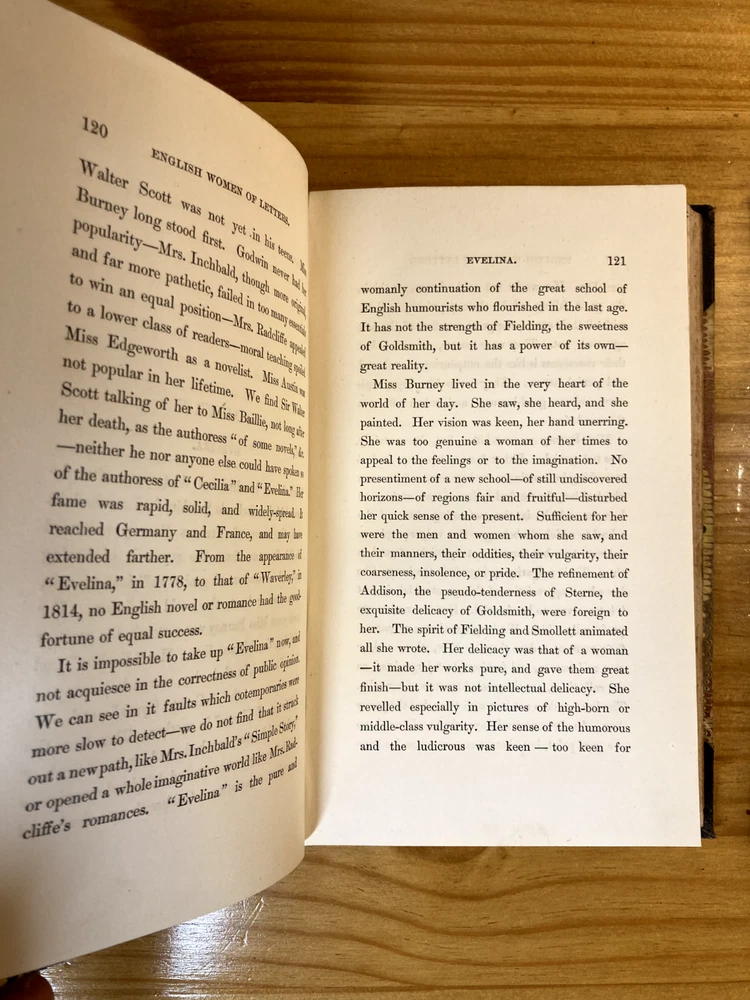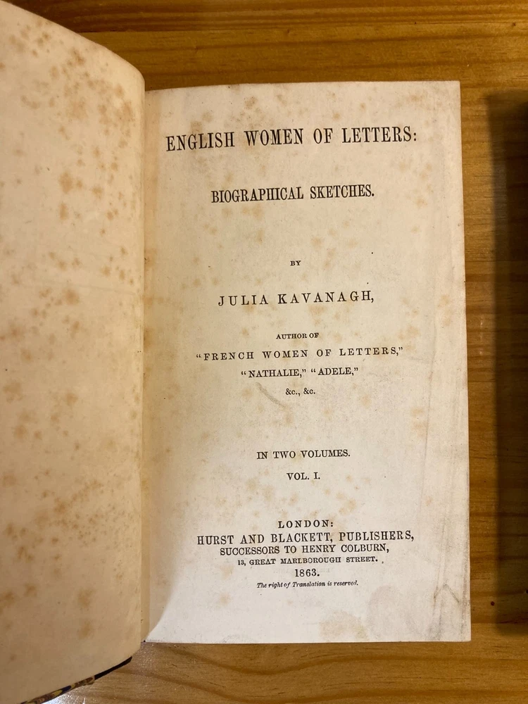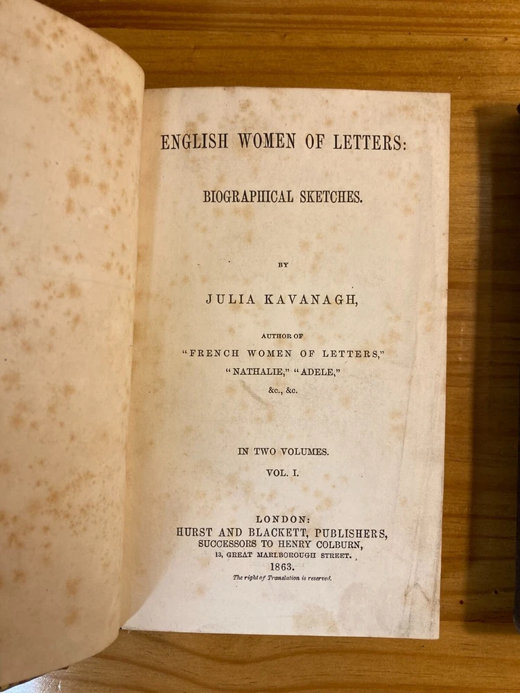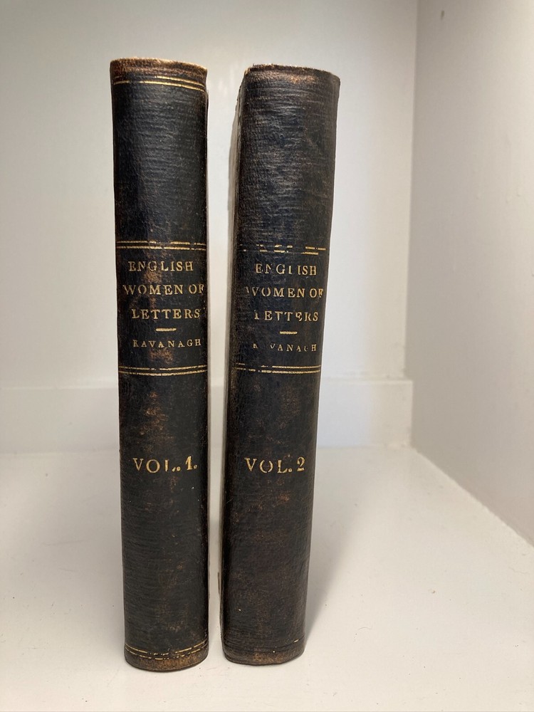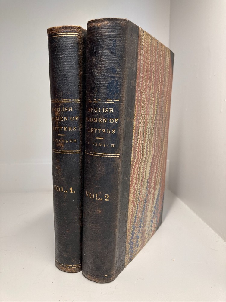 A fair copy of an important first edition. Written as a companion piece to French Women of Letters, Kavanagh's English Women of Letters became an influential reference guide for literary scholars. Rather than focus broadly on women's historical accomplishments, as her predecessor Mary Hays did, Kavanagh narrowly honed the focus of her female biography. "My object is, namely, to show how far, for the last two centuries and more, women have contributed to the formation of the modern novel in the great literatures of modern times." By considering writers from Aphra Behn to Jane Austen to Amelia Opie, Kavanagh encouraged readers to see how women influenced the novel's form from its inception. She further urged them to consider how women continued shaping the literary canon through their ongoing engagement with the form. An exceptionally important work in the feminist canon. Two volumes, bound in quarter leather over marbled boards. Ex-library, with stamps. Endpapers and first free pages of both volumes have heavy foxing, but the rest of the books are quite clear. FFE on volume two is partially detached from binding. Foxing to edges as well. Despite all of these condition imperfections, still an important first edition & a critical moment in feminist criticism.