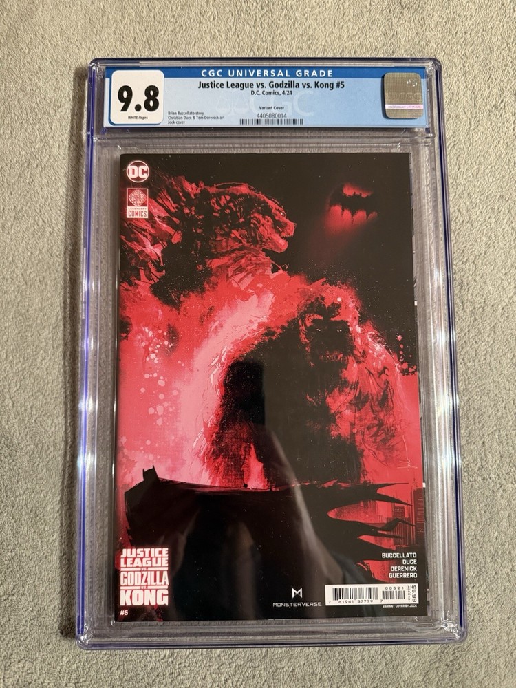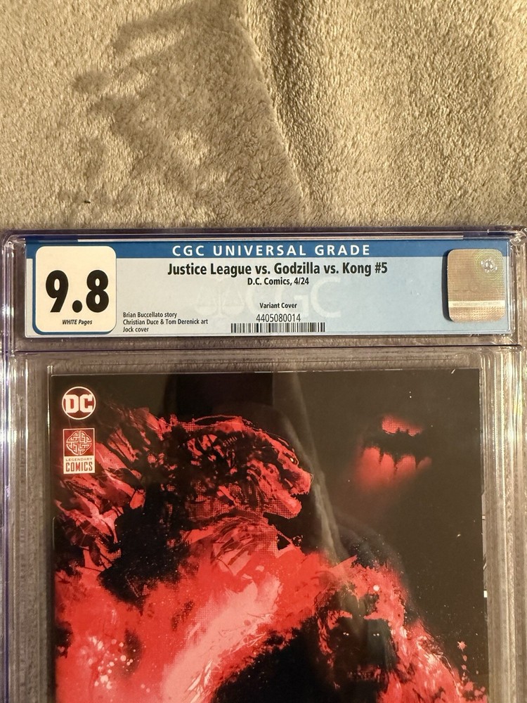 Get your hands on this amazing Justice League vs Godzilla vs Kong #5 Jock Variant Cover CGC 9.8 . This US Comics tradition comic book features the iconic superheroes Batman (Bruce Wayne), Godzilla, and King Kong. The cover art by Jock is simply stunning and is sure to impress any collector. Published by DC Comics in 2024, this Modern Age (1992-Now) comic book is a must-have for any fan of superheroes and science fiction. The issue number is 5 and the comic is in English language. This Jock Cardstock Variant Cover is a rare find and will make a great addition to your collection.