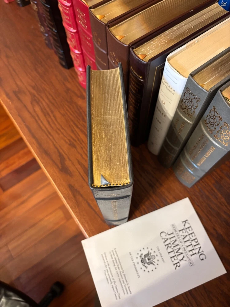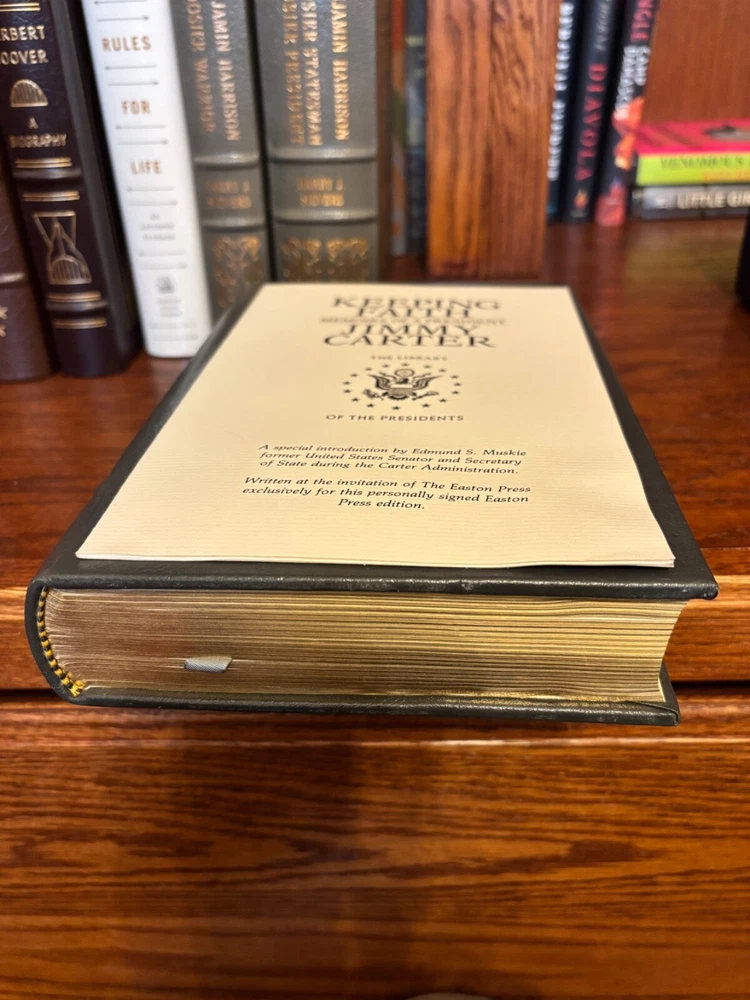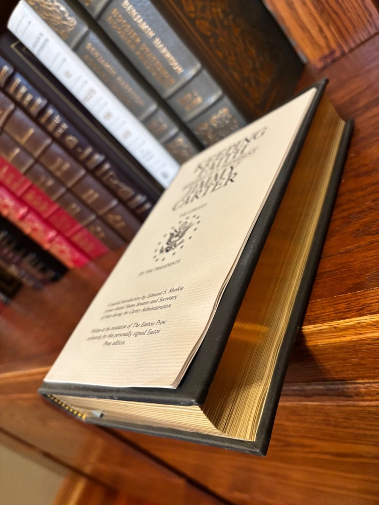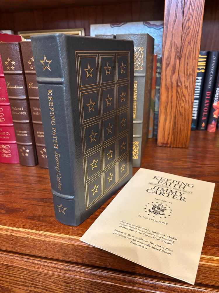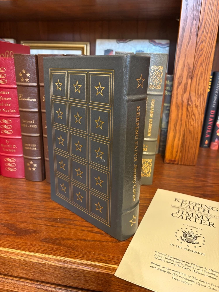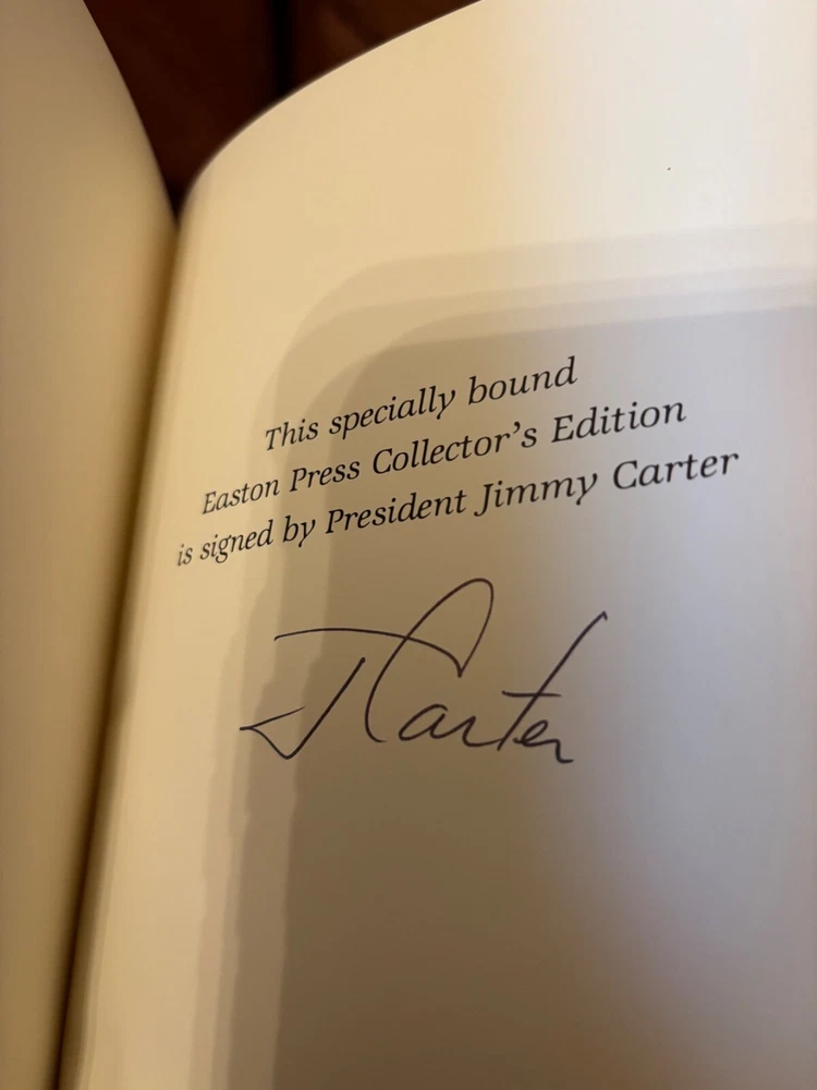 Easton Press(1982)full leather hardcover, 22K gold accented, decorated endpapers, ribbon marker, book is in “Fine” condition, obviously unread and appearing unused, includes publisher booklet issued with publication, signed by Jimmy Carter on publisher provided signature page, blank bookplate affixed.......(please see my many feedbacks for an idea of how I grade books and generally do business) (see my EBay store for the finest books & prices, many signed).......(No remainder marks or price-clipping)...............Always shipped in a box, well protected