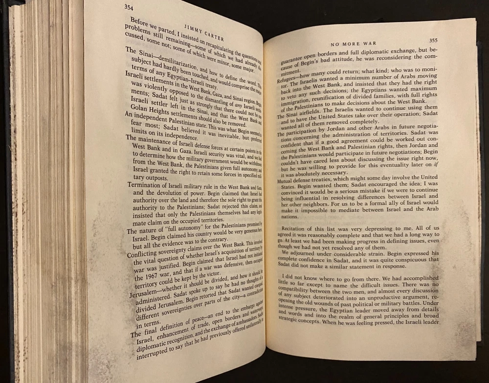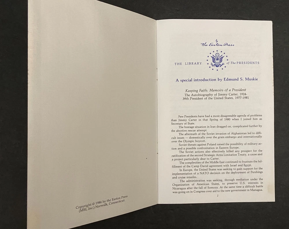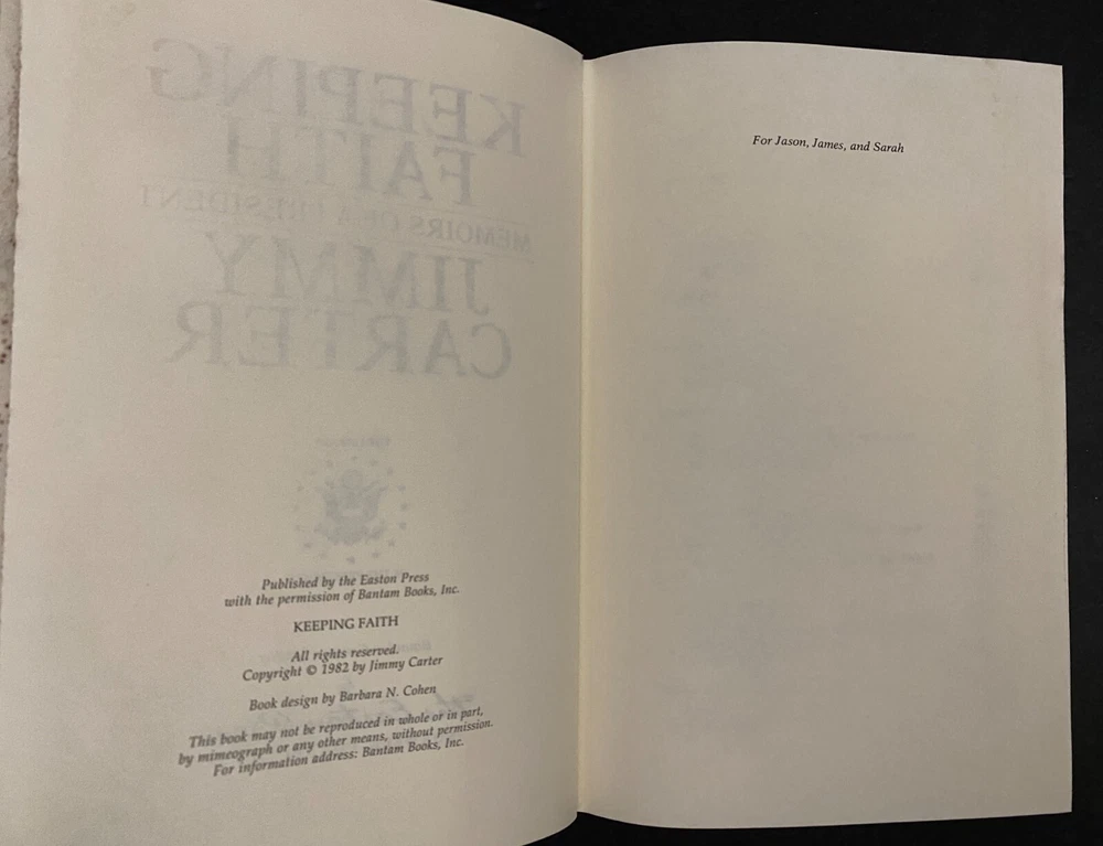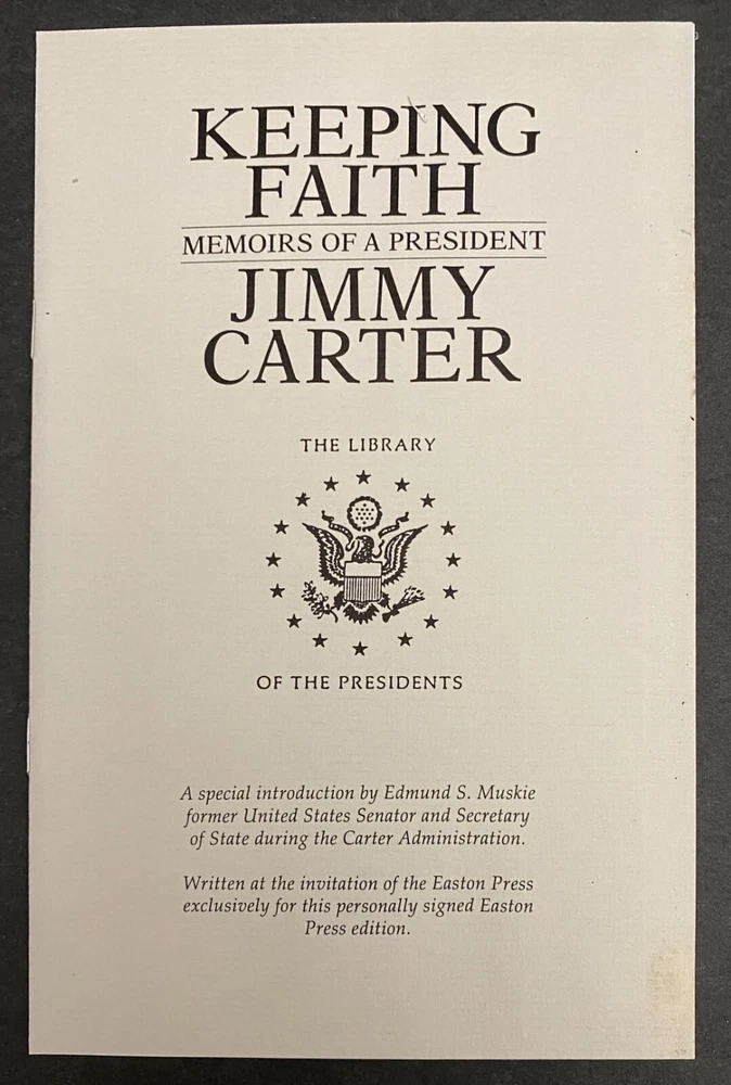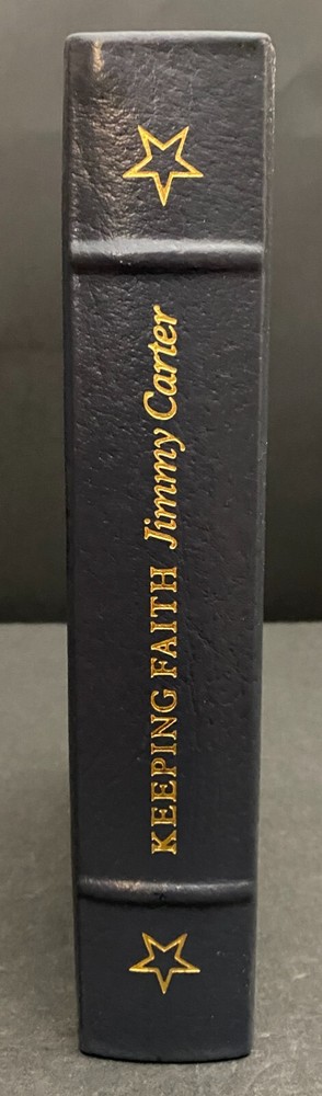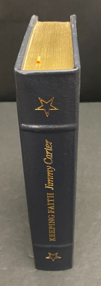Keeping Faith by Jimmy Carter, SIGNED, Water Damaged Part of the Library of the President's collection of The Easton Press, Norwalk, Connecticut, 1982. This book is fair condition. Previous owner's bookplate is attached to the front free end paper. The book is warped and the gilding on all 3 page ends are damaged The Easton Press books are bound in genuine leather binding, with 22kt gold accents and hubbed spines, gilded page ends, acid-neutral paper and evocative illustrations and decorations. We will be happy to combine shipping, wherever possible. Some items cannot be combined because of their size, weight or because they are fragile. Please ask if you have any questions. Your order will ship by the next business day after receiving payment. All items are from a smoke-free environment. Thank you, and Happy Reading!