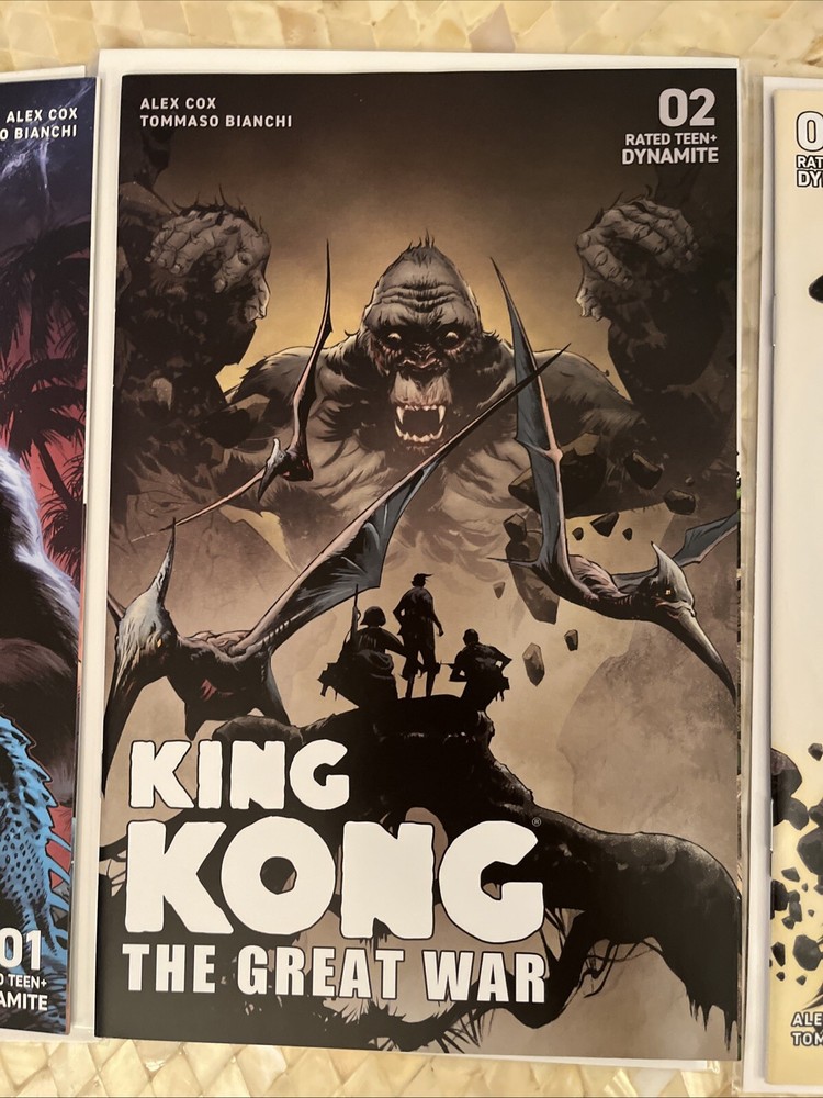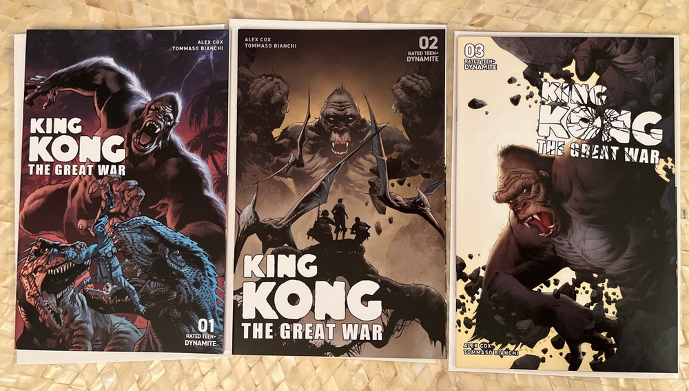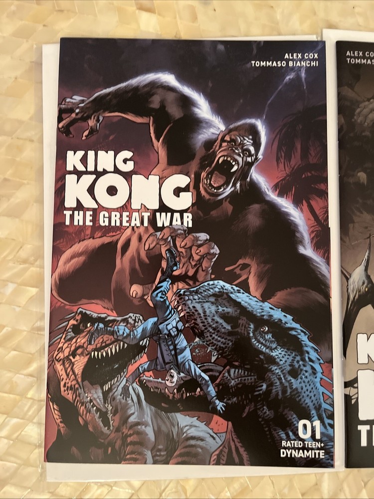 King Kong: The Great War #1-3 is a Dynamite Comics publication from 2023. The comic books are bagged and boarded for preservation. The story follows King Kong during World War II in the Pacific. The comic books are in English language and intended for viewer discretion. The series is written by Tommaso Bianchi and Alex Cox with art by Bryan Hitch and Jae Lee. The comics are part of the Modern Age (1992-Now) era and fall under the Action, Adventure, Movie & TV genre. Books are like new. See pics. VF/NM Will combine shipping with other books