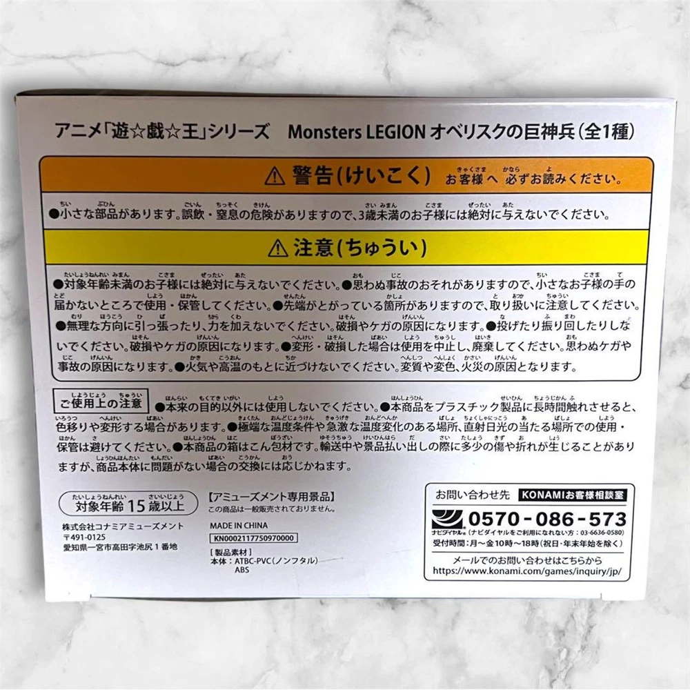 Add this limited and rare Konami Monsters LEGION Obelisk the Tormentor figure to your Yu-Gi-Oh! collection. This highly sought-after piece is perfect for any fan of the series or monster collectors. Still sealed in its original box, it is a great addition to any display. Condition The item is unopened and in its original packaging. The outer box shows some minor surface wear, dents, and claw marks from being a crane game prize. There are also some tape marks on the box. Shipping Tracking numbers are provided to all orders. The item will be carefully packed to ensure it arrives safely. Customs and import charges Import duties, taxes, and charges are not included in the item price or shipping cost. Buyers are responsible for these charges. These charges may be collected by the carrier when you receive the item.