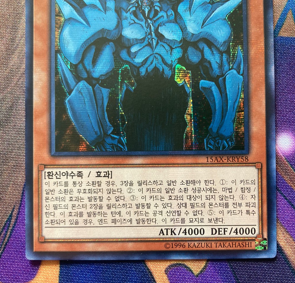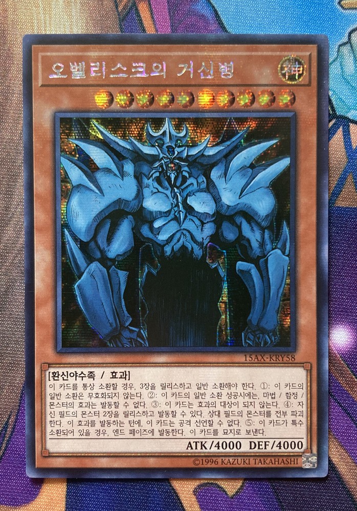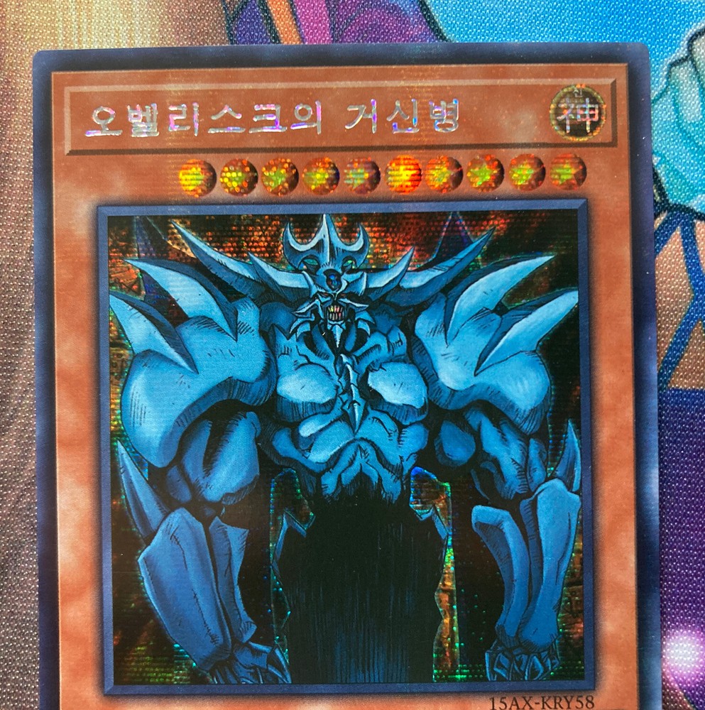 Korean Yu-gi-oh! TCG Obelisk The Tormentor 15AX-KRY58 Secret Rare Shipped with eBay standard envelope USPS service Card is pack fresh; pulled and sleeved instantly No shuffle marks on the face or back of the card Corners are crisp Edges are clean When looking at the face of the card, centering looks to be slightly thicker on the right side border than the left Thanks for the view!!