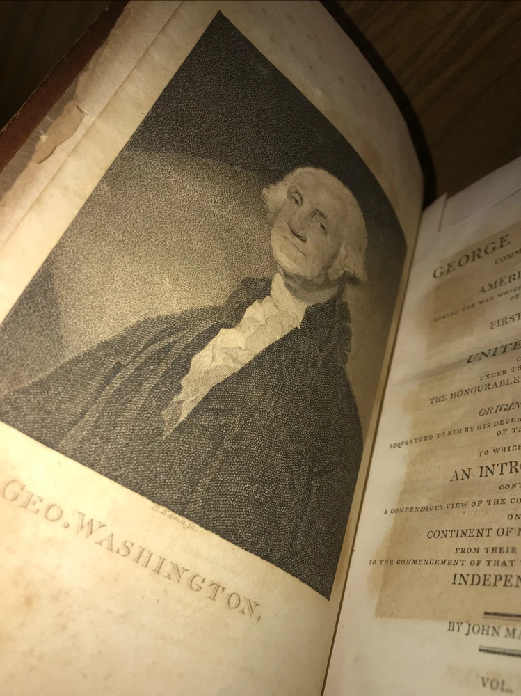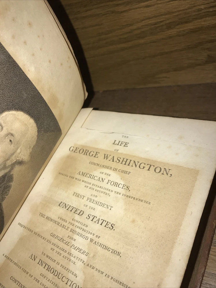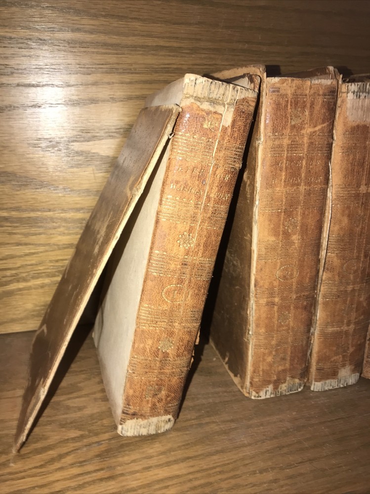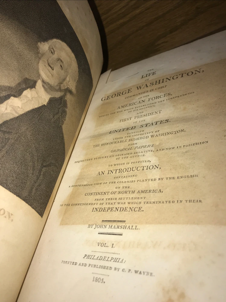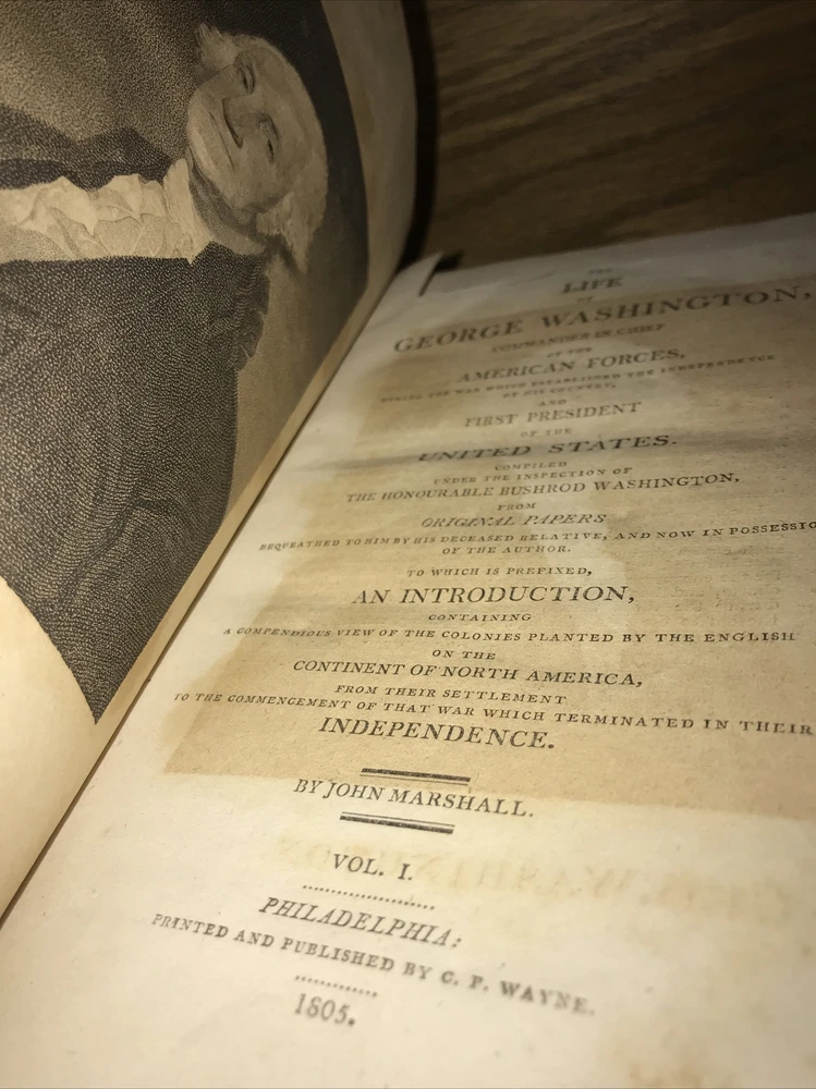 First edition of Marshall’s Washington. 1805-1807. Volumes 1-4 are 1805. Volume 5 is 1807. Complete but in poor condition. Original frontisplate of Washington still present. Bindings original. Bindings in poor condition. Covers detached or cracked on all volumes. Spines abraded. Spine labels missing. Quality rag paper. Set is complete. Poor externally. Still a good reading set. Not in collectible condition. Name clipped from title page. Original end paper volume one is detached. Original frontisplate is present attached and intact. Early owners name in end paper and clipped from title pages. Rear cover volume one is detached. All covers are cracked and almost detached. 1805-1807. Will be well protected for shipping. 2022.03.10