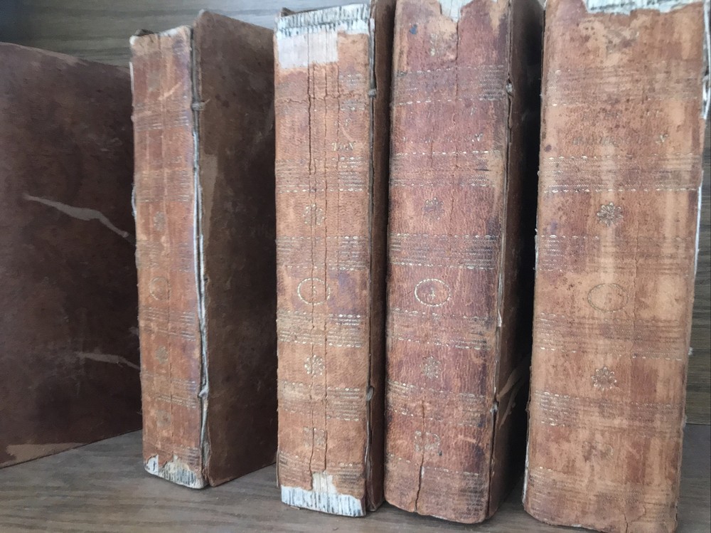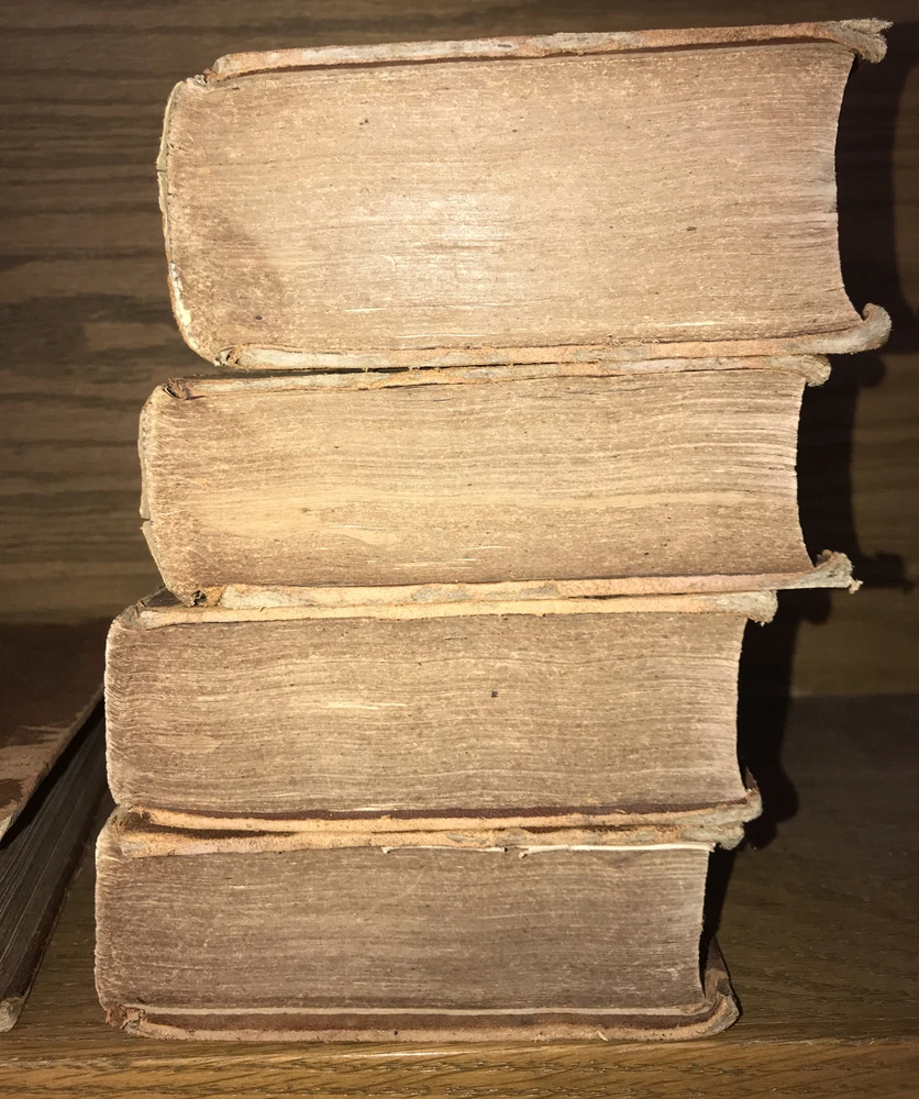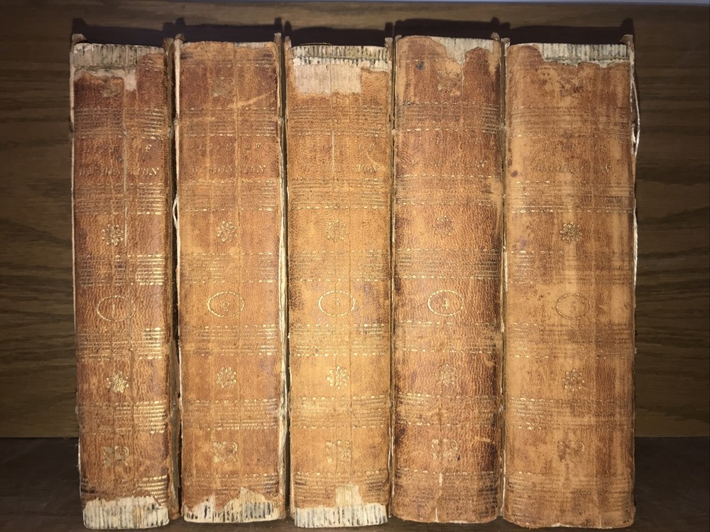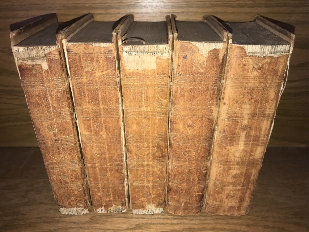 First edition of Marshall’s Washington. 1805-1807. Volumes 1-4 are 1805. Volume 5 is 1807. Complete but in poor condition. Original frontisplate of Washington still present. Bindings original. Bindings in poor condition. Covers detached or cracked on all volumes. Spines abraded. Spine labels missing. Quality rag paper. Set is complete. Poor externally. Still a good reading set. Not in collectible condition. Name clipped from title page. Original end paper volume one is detached. Original frontisplate is present attached and intact. Early owners name in end paper and clipped from title pages. Rear cover volume one is detached. All covers are cracked and almost detached. 1805-1807. Will be well protected for shipping. 2022.03.10