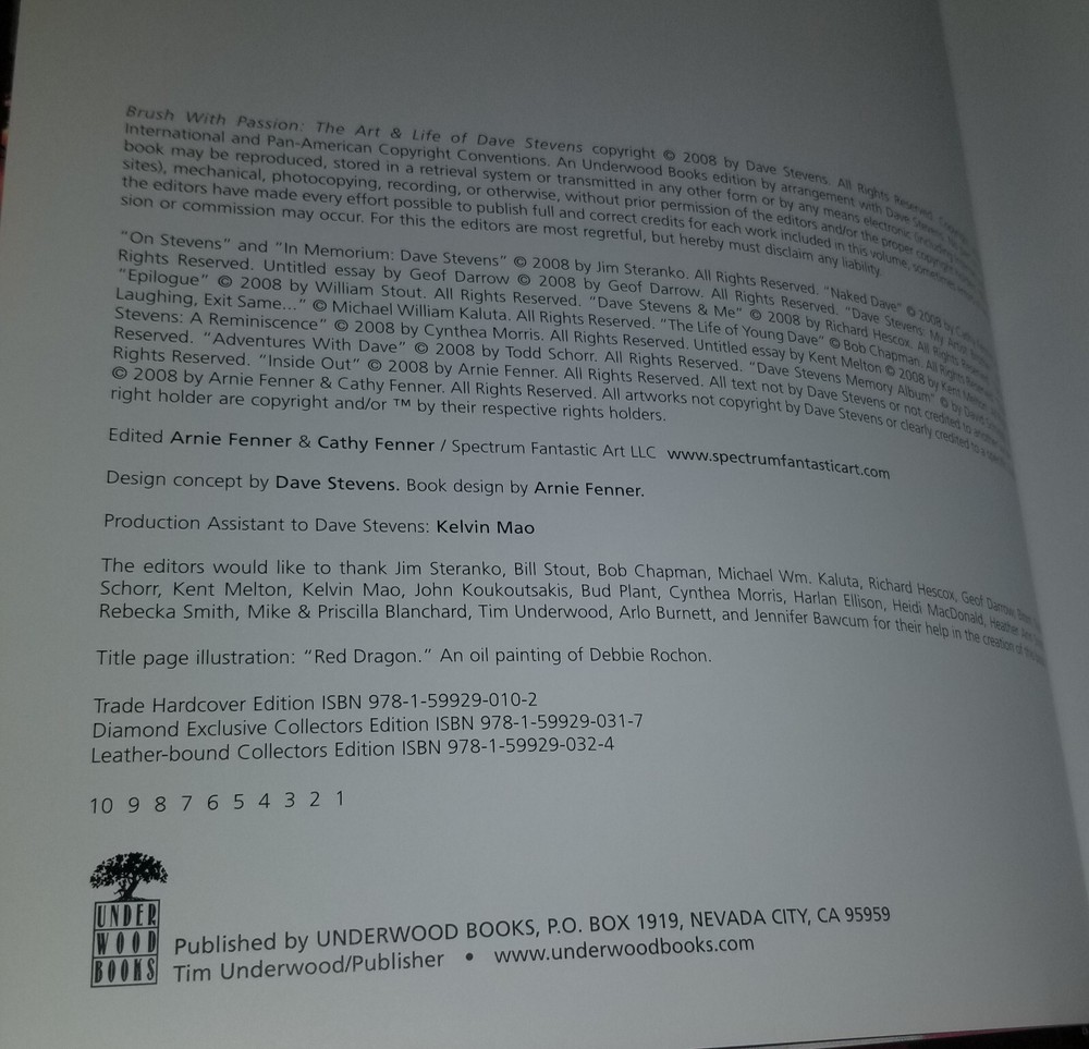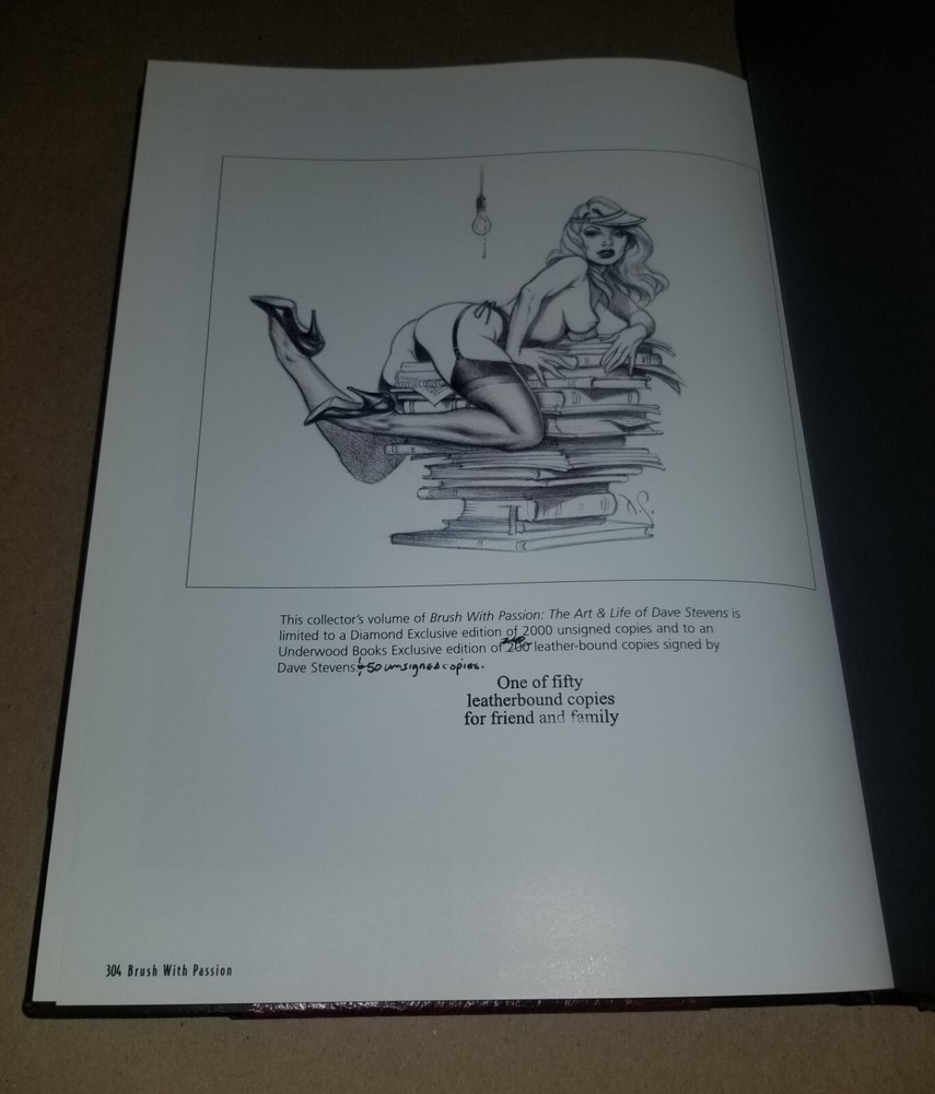 Up for sale is an ultra-rare LEATHER-BOUND Collectors Edition of: Brush With Passion Art and Life of Dave Stevens. This particular book is 1 of only 50 copies printed for friends and family. The back cover page features a hand-written correction to the edition numbers including a stamped "One of fifty leatherbound copies for friends and family". This book has never been read and is in near-mint condition. I bought this book directly from the Dave Stevens' estate along with another version that has an additional page (this particular version of the book does not have the tipped-in page). That other book is also being listed for sale. Feel free to ask any questions you may have.