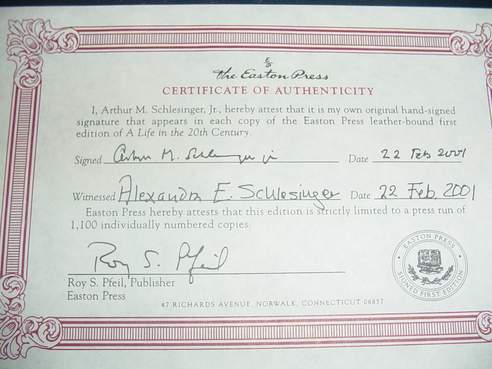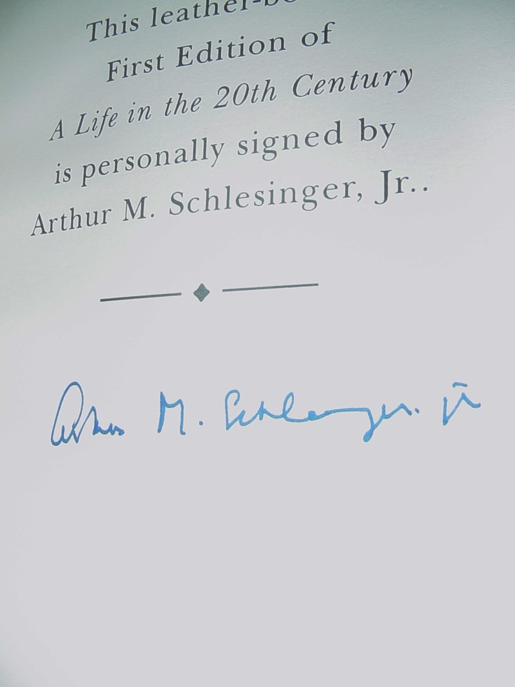 For your consideration, a FINE, UNREAD copy of THE SIGNED, FIRST EDITION OF A LIFE IN THE 20TH CENTURY - THE CLASSIC BY ACCLAIMED AUTHOR AND HISTORIAN ARTHUR M. SCHLESINGER SIGNED IN BOLD PEN BY THE AUTHOR ON A SPECIAL SIGNATURE PAGE IN A LUXURY FULL LEATHER EDITION FROM THEIR SIGNED FIRST LIMITED EDITIONS SERIES - LONG OUT OF PRINT! A RARE BEAUTIFUL BOOK WITH EXQUISITE ILLUSTRATIONS - PERFECT FOR THAT GIFT THAT WILL LAST FOR GENERATIONS TO ENJOY! Published by The FRANKLIN LIBRARY AND LONG OUT OF PRINT . THIS IS A TRUE COLLECTOR'S EDITION PUBLISHED BY THE FRANKLIN LIBRARY IN MIDNIGHT BLACK AND 22KT GOLD LEATHER, SPECIAL ENDPAPERS, HUBBED SPINE, SATIN RIBBON, 22KT GILDING OF TITLES, COVER DECORATIONS AND PAGE ENDS, ARCHIVAL QUALITY PAPER. THIS RARE AND EXCEPTIONAL BOOK IS IN FINE CONDITION with no sign of previous ownership, ABSOLUTELY BEAUTIFUL! YOUR SATISFACTION IS GUARANTEED! A great collectible title with excellent shelf appeal. S&H IS $4 FOR THIS FINE BOOK in the US ., others set after auction closes. I accept Paypal. Plse check my other fine book listings of Easton Press and Franklin Library full leather classic collector's editions and save on combined shipping. Bid with confidence. Add a map to your own listings. FREE Trial!