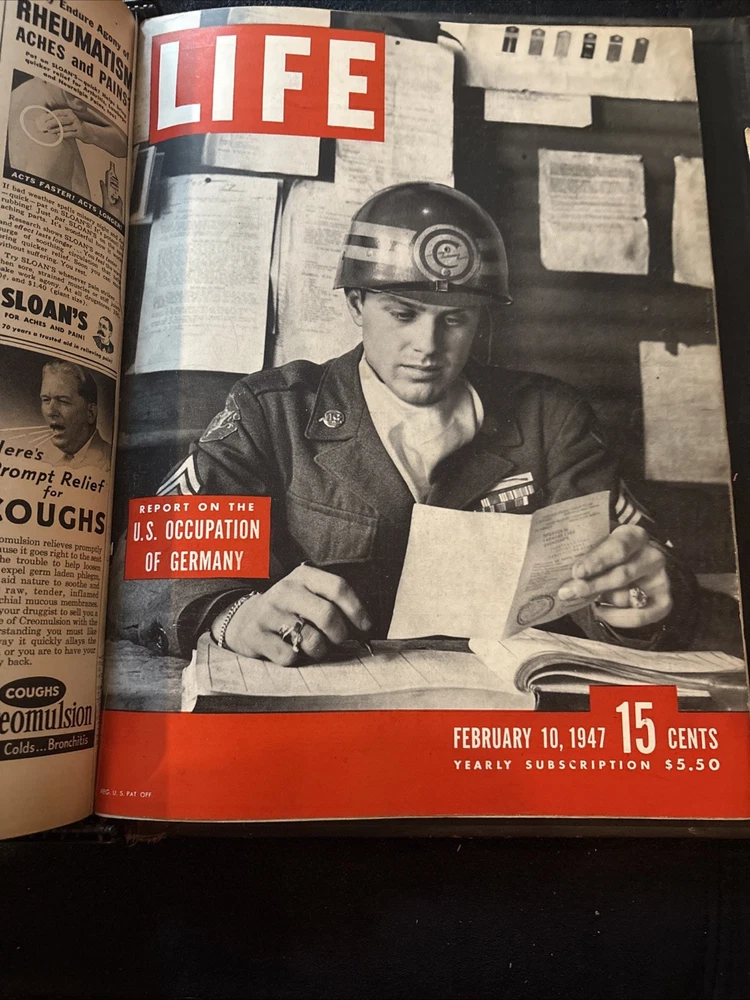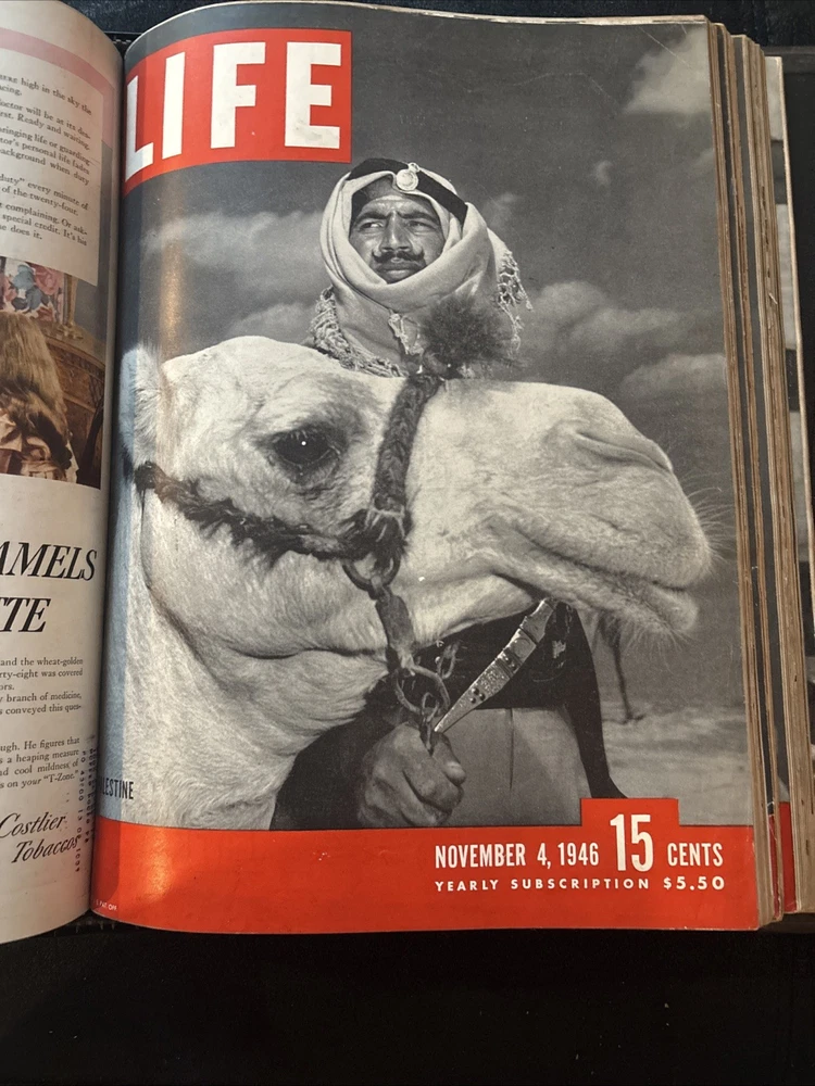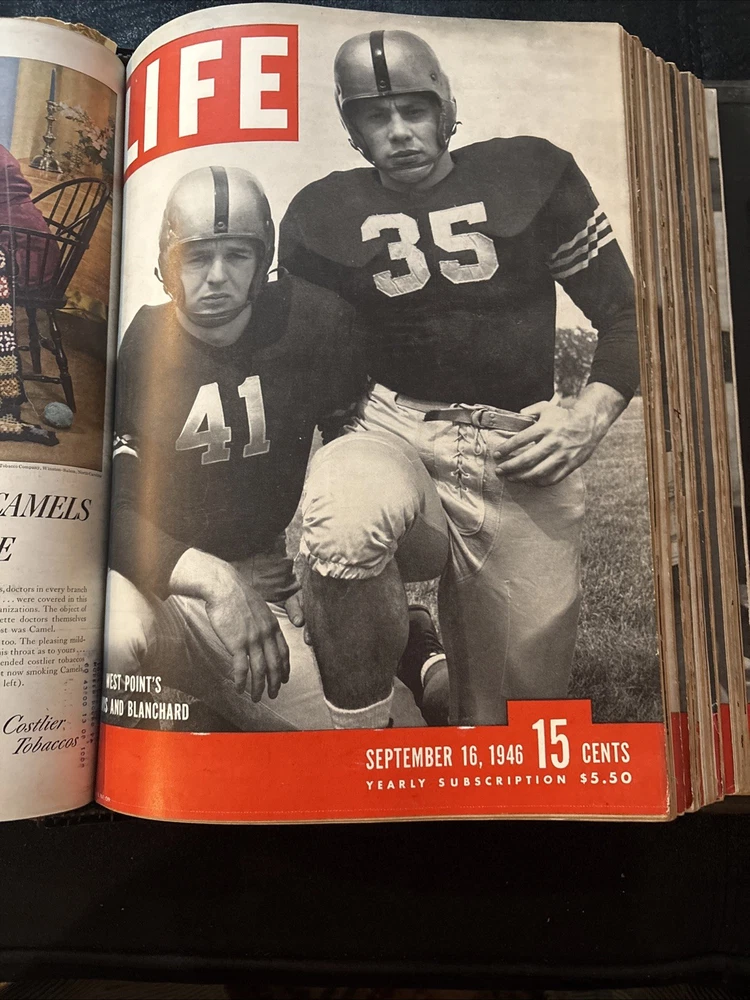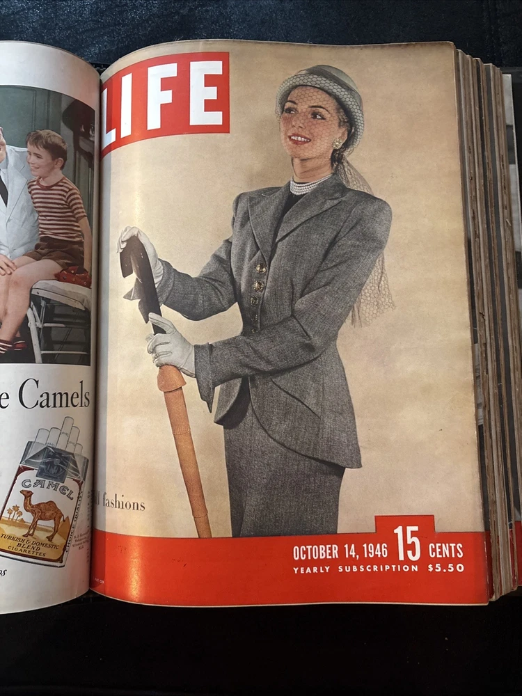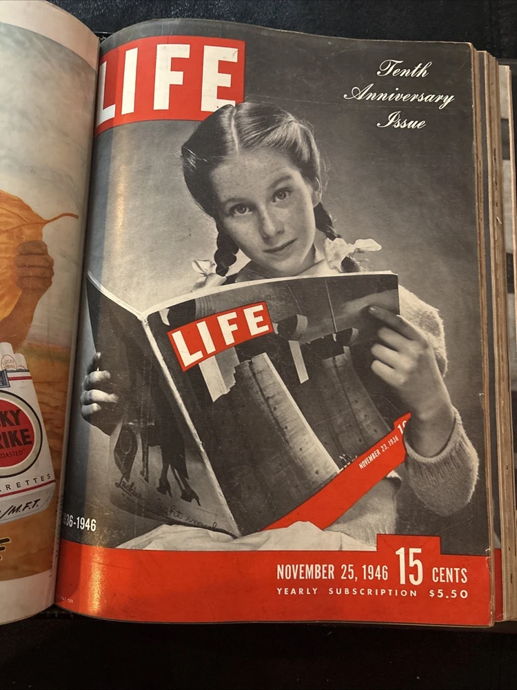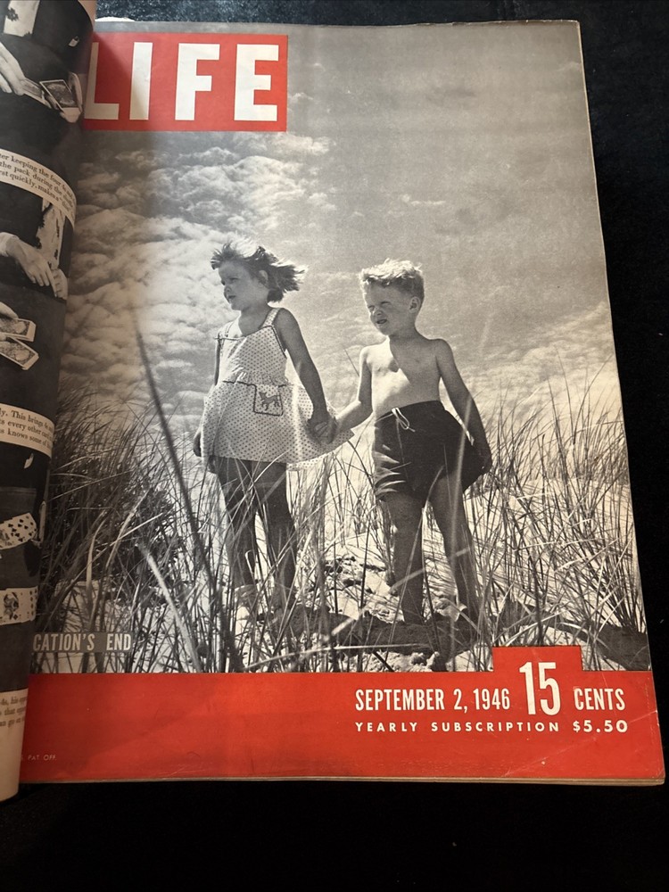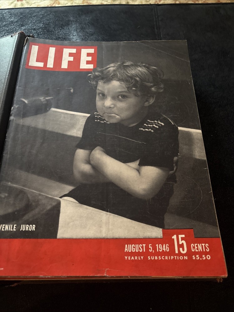 This is a leather-bound edition of Life Magazine, spanning from August 1946 to February 1947. The publication name is Life and the publication months are February and August. The magazine covers various topics and contains articles, photographs, and advertisements from the post-war era. The item is perfect for collectors or those interested in vintage magazines. Good condition with wear normal for age.